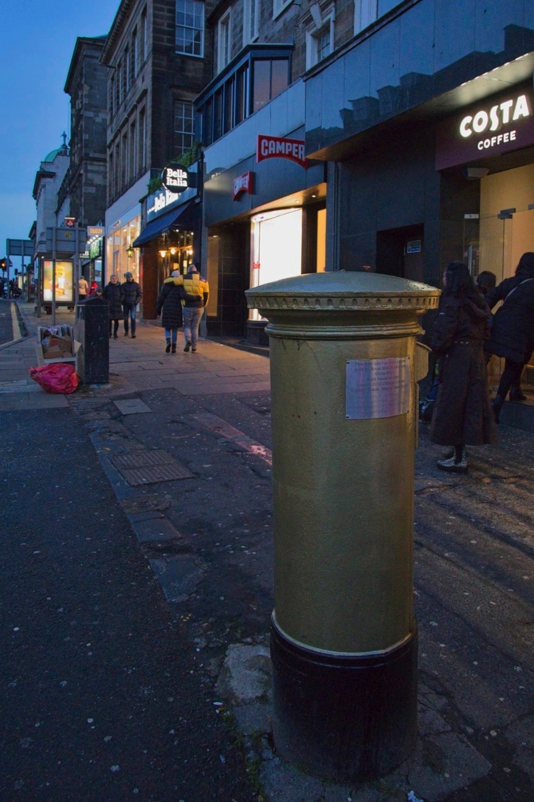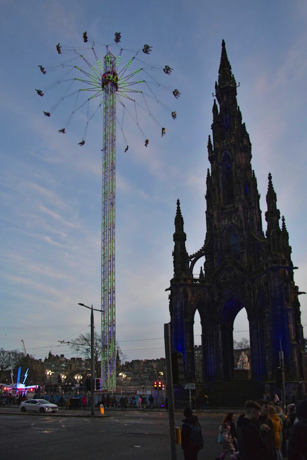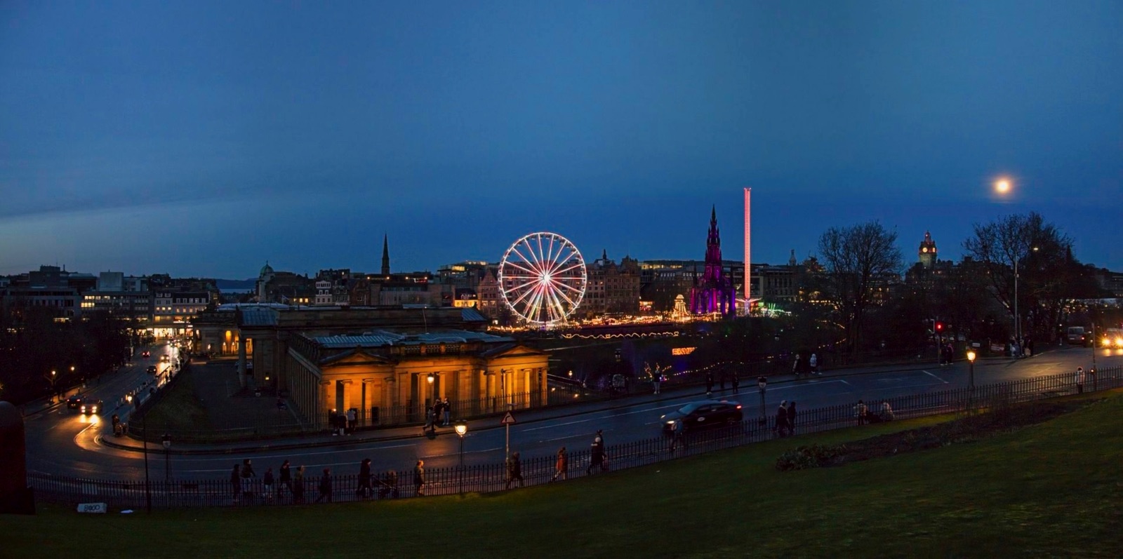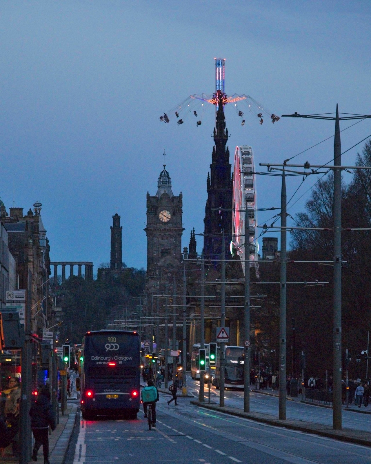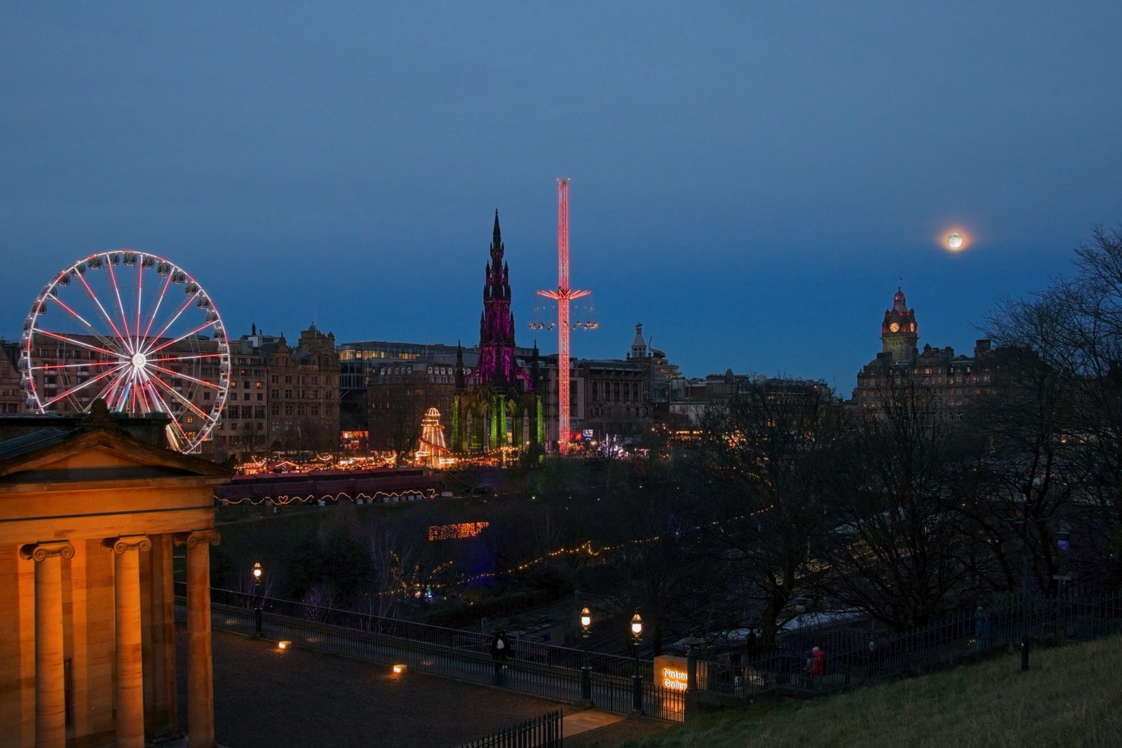 It was a nice clear winter day yesterday and Anne and I met up with cousin Alison and Alan for a stroll around the city centre to check out the lights and attractions. The city was pretty quiet as the vast majority of the shops remained closed for Boxing Day. We walked from George Square, past our old home, down to Princes Street and George Street, returning up the Mound as the light faded and, indeed, the temperature dropped. Here are some snaps from our stroll. The headline pictures is from Castle Wynd looking over the Mound towards Princes Street. Starting below you can follow our walk starting with look up to where we grew up on the top floor above the Doctors pub. Then past Greyfriars Bobby with his now abused nose, and along Bauermeister Strasse (George 4 Bridge). The bookshops are now restaurants! A quick look at the moon over the North British hotel and then down the mound past the National Gallery and on to Princes Street into the land of the thrill seekers. Along George Street, the Dome pub was well lit up and there were more thrill rides. Back to Princes Street we passed the gold post box for Sir Chris Hoy and then headed back up the mound as the light got just about perfect for twilight photos. The final shot is looking along George 4 Bridge to the Bank of Scotland at the top of the Mound. What a nice walk it was.