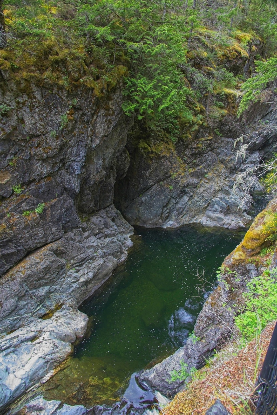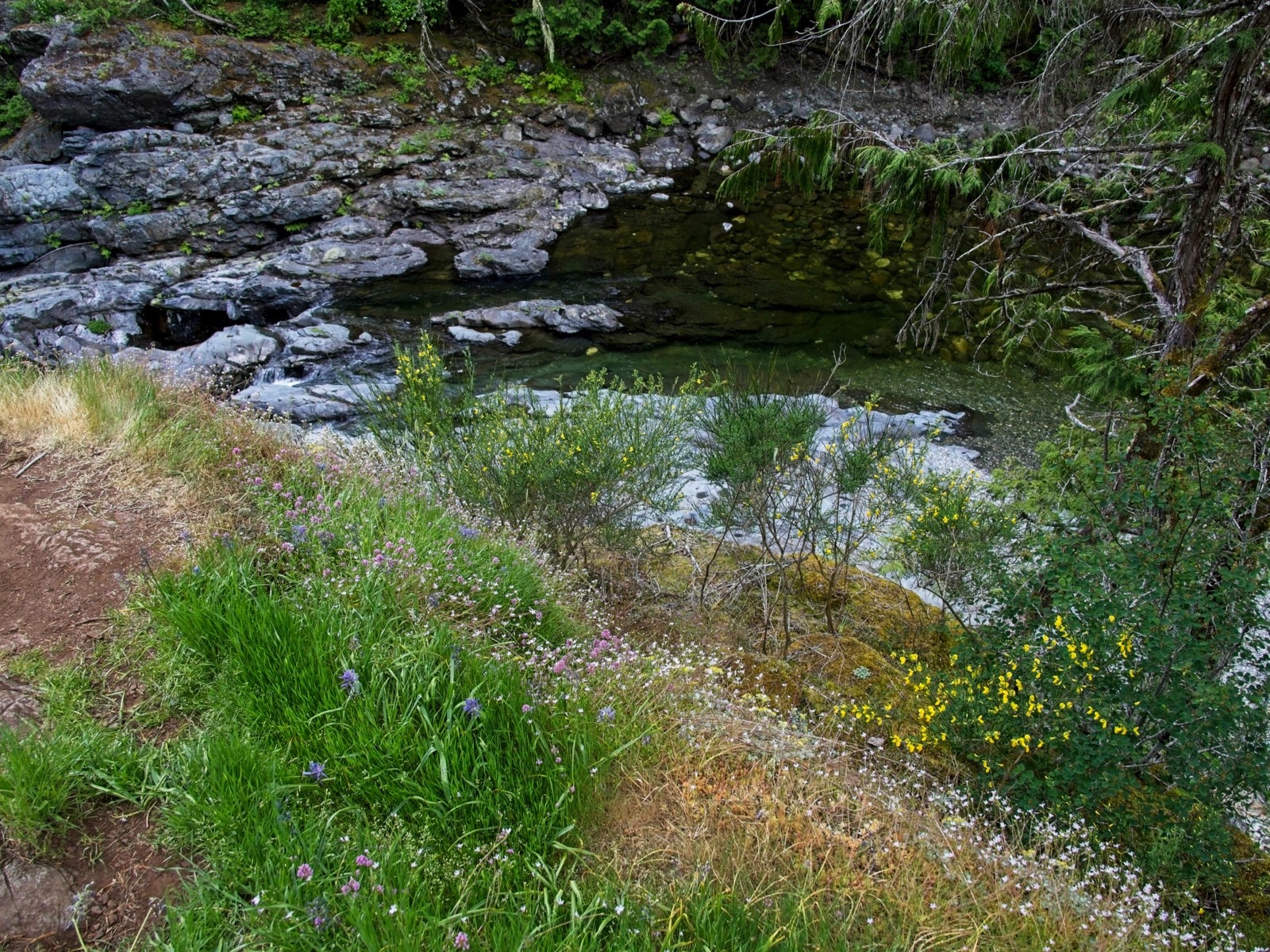 At Sooke the river of the same name has cut a deep gorge and the water has excavated pools of absolutely clear water, hence the potholes in the park name. There was an abundanceof colour with wildlfowers and the trees and a few little birds.