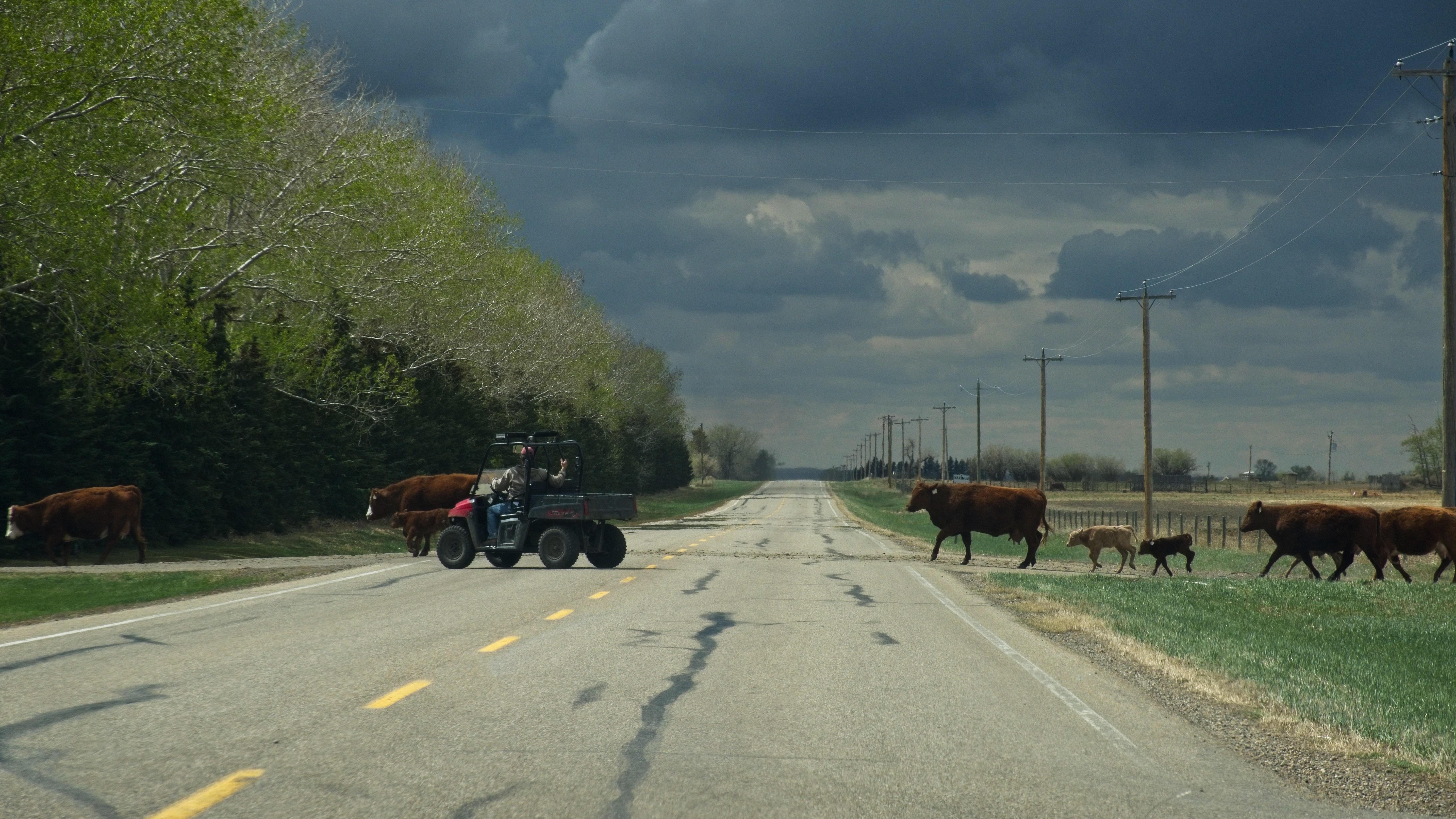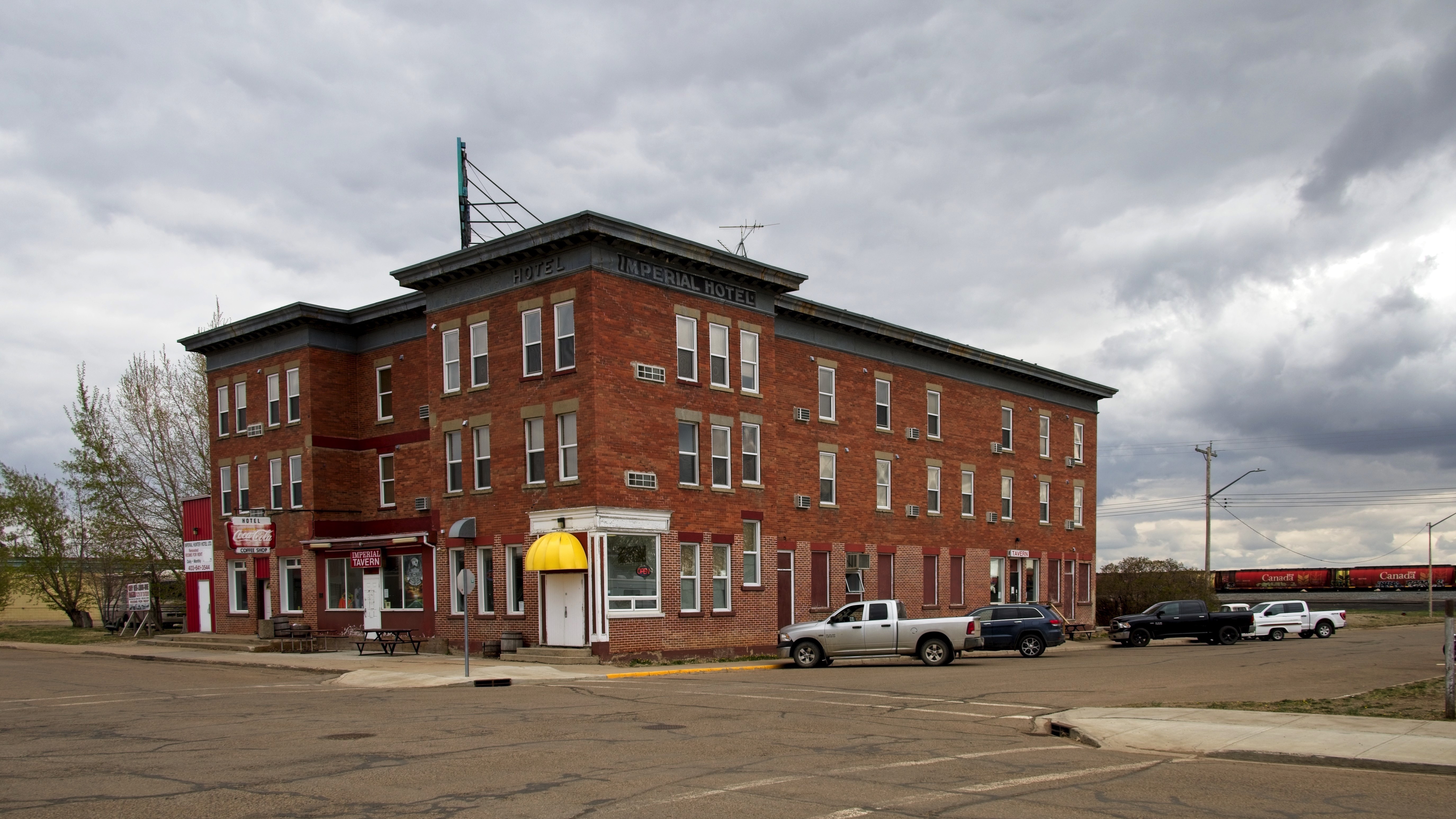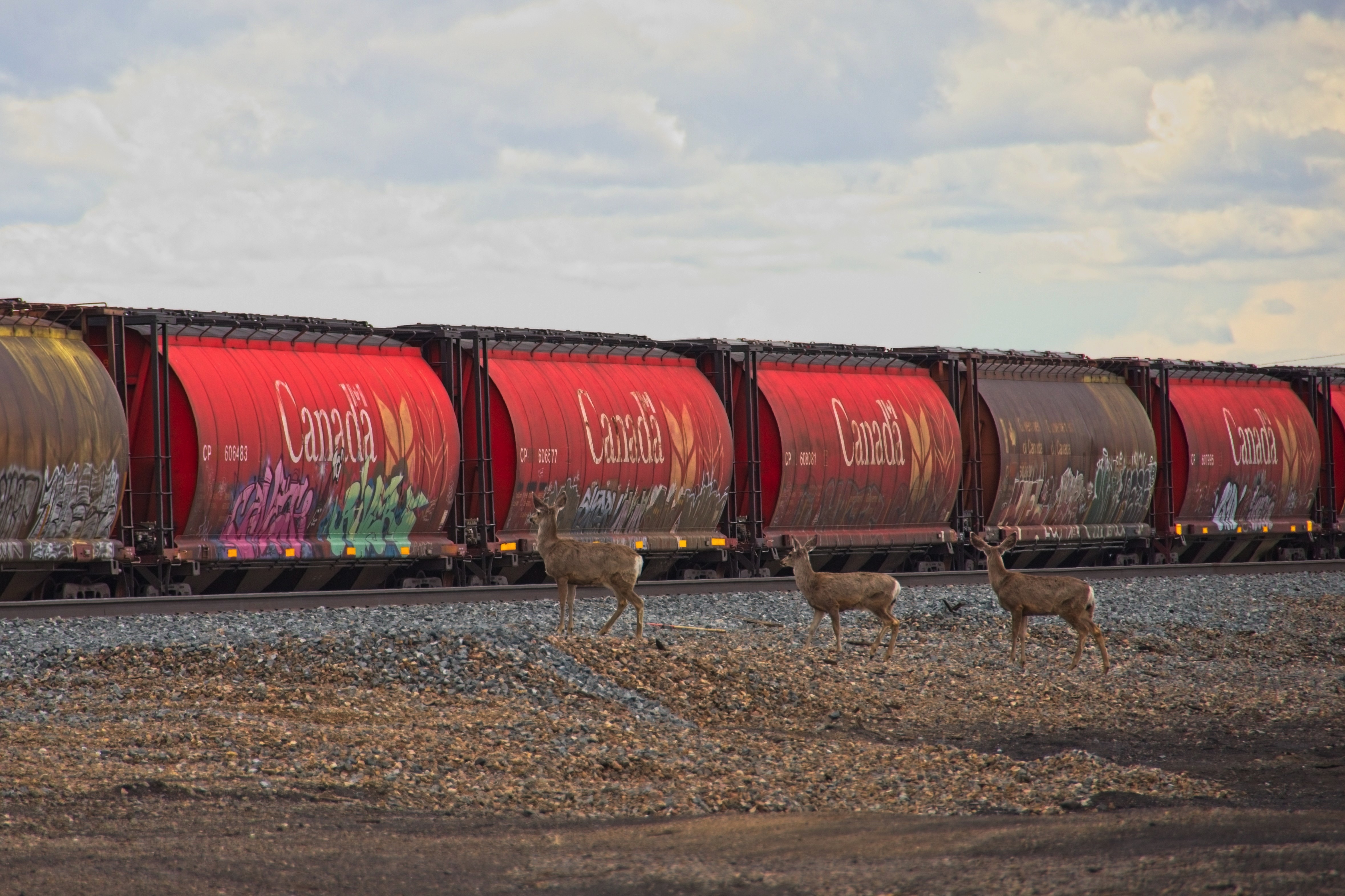 After a comfortable night with a reasonable amount of sleep I made an early start to visit the Dinosaur Provincial Park, about 65km East of Bassano. Empty roads again and not a hill in sight. The park is in Alberta’s badlands which is an area where the prairie has been eroded away exposing the many layers of ancient sediment, typically where fossile are easily found, as is the case here. The headline picture is from the Badlands Trail and I walked each of the trails in the park until an early afternoon lunch in the park cafe. I have tried to pick a small selection that convey the landscape including images with people for scale. A feature of the park are small hoodoos, columns of sandstone. There are a couple of dinosaur fossils in neat display buildings on the Fossil Hunter Trail. The Cottonwoods by the Red River are still recovering from a fire here in 1989! An overlook at the park entrance gives a great introduction to these badlands. On the roads to and from the park you pass many oil wells and large fields both for wheat and for beef cattle, some of whom caused me to stop on the beautifully named Short Cut Road. At Bassano the evidence of the wheat trade is evident on the Canadian Pacific railroad. The mule deer just came wandering out of the slightly rundown tiny town of Bassano and patiently waited for a freight train to trundle by. The eating options in Bassano are somewhat limited with a choice of walking to the diner at the Esso Station or driving to the farthest end of town to the other option. I chose to walk across from the hotel. The diner was not posh but the waitress was very nice, service quick, reasonably priced and the French Dip and fries was well cooked and tasty.
