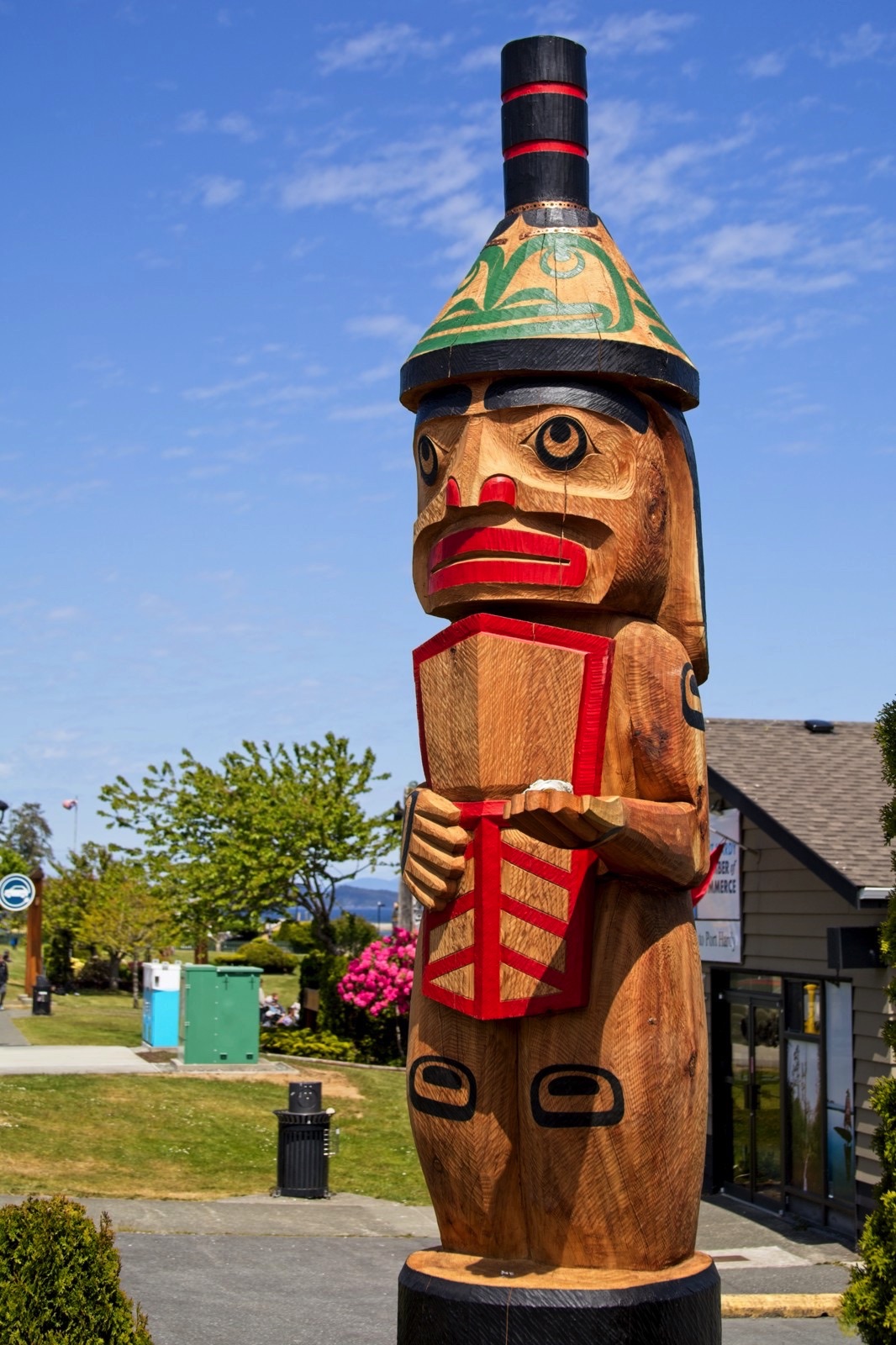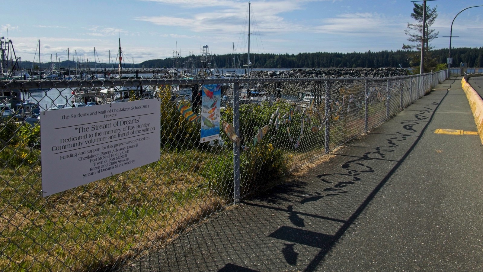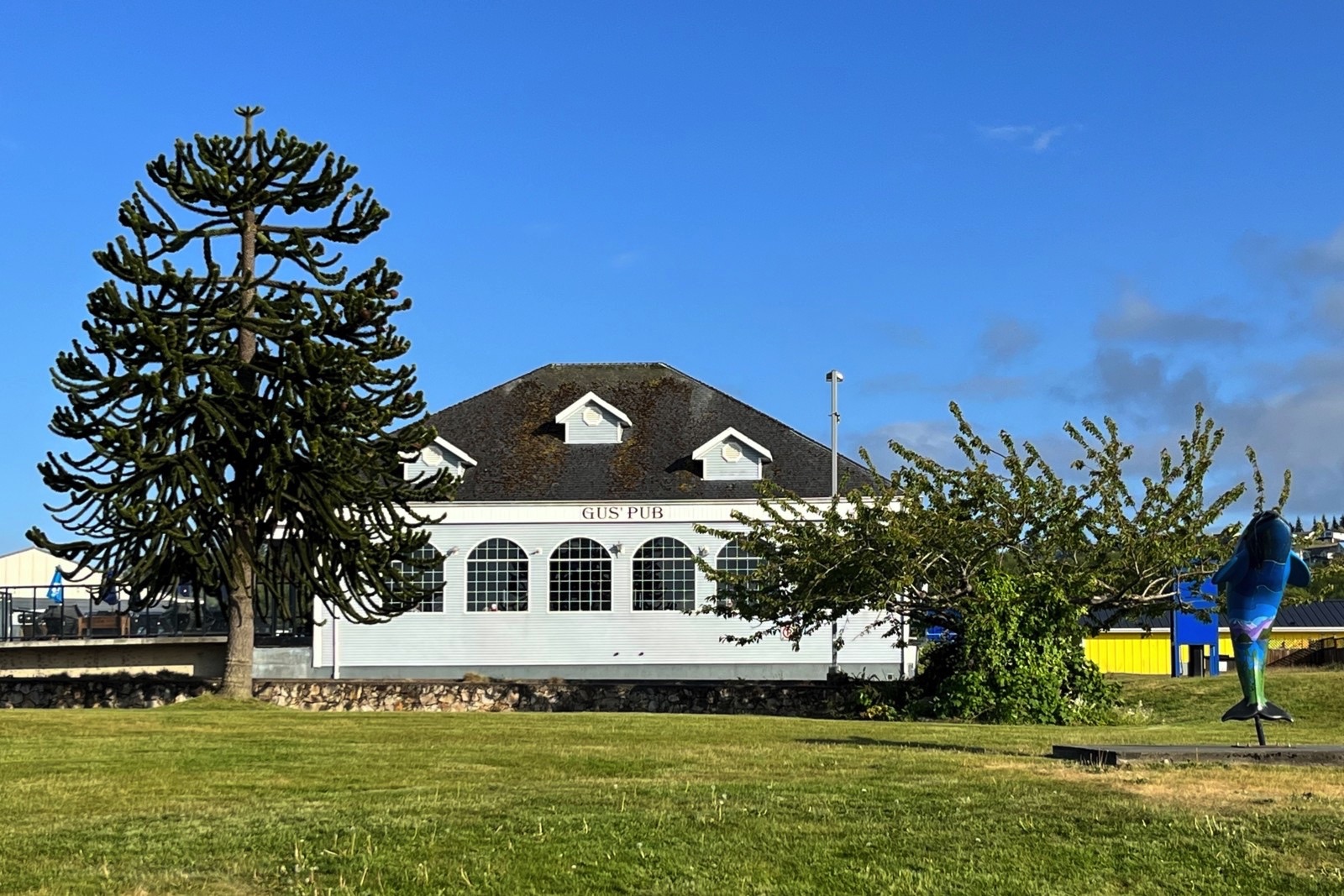 Today has taken me as far north as I will go on Vancouver Island. Apart from a few backroads this is as far as the highway goes, finishing at Carrot Park where the story is it took a very long time from promise to delivery to provide a highway to Port Hardy, BC-19. This is where the ferries go to northern British Columbia but sadly not within my schedule. The headline picture is at Bear Cove in Port Hardy. There is also a pretty cool war memorial which includes a totem recognising the first nation volunteers from this area who fought in WW2. Another totem was looking a bit grumpy which can be explained by the power outage from 7am to, in the end, 5:55pm for maintenance. It meant Port Hardy was like a ghost town with nothing open. In fact there were two places there were people. First there were those being baptised! It is Sunday after all. By far the biggest group were at the scenic Storey Park enjoying picnics and games. A raven was having a little less fun being harried by crows. It is nice to see the two together helping recognise their size difference. The mountains on the mainland coastal range are a constant, including at stops along this very scenic highway. On the way up from Campbell River I took a punt and headed off to the coast at Sayward and its port of Kelsey Bay. Big logging country. The village of Sayward was well maintained but a little sad. The small shopping mall was empty and the hotel and bar had suffered a similar fate. Remote communities are a challenge the world over. I mentioned the highway, BC-19, and it was a joy to drive. Almost no traffic, beautiful surface and views at every turn with cruise control on and favourite music playing on CarPlay, not a bad way to pass a couple of hundred kilometres. I finished my day, with still no power, at the little town of Port McNeill, jumping off point to a couple of the islands in the Broughton archipelago. My small motel is just above the harbour. No super-yachts here, Along the ferry terminal fence there is a delightful art installation, Stream of Dreams, where painted salmon are on the chainlink fence creating a wonderful shadow pattern in the afternoon light. Someone thought about this. As I finished my walkabout a ferry headed off to Alert Bay, one of the Islands, with a handful of vehicles on board. After the long power outage there were questions asked about whether anywhere would be open to eat and gladly Gus’s Pub did their bit and it quickly filled up with grateful diners and drinkers, most of whom seemed to be locals.