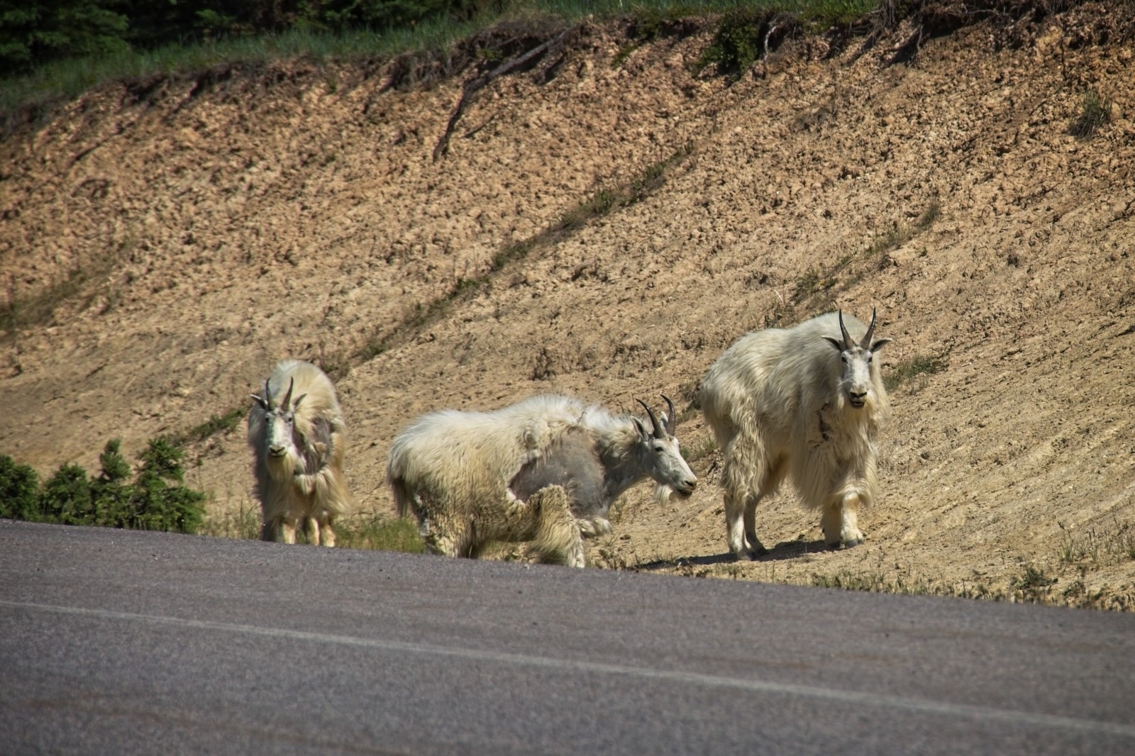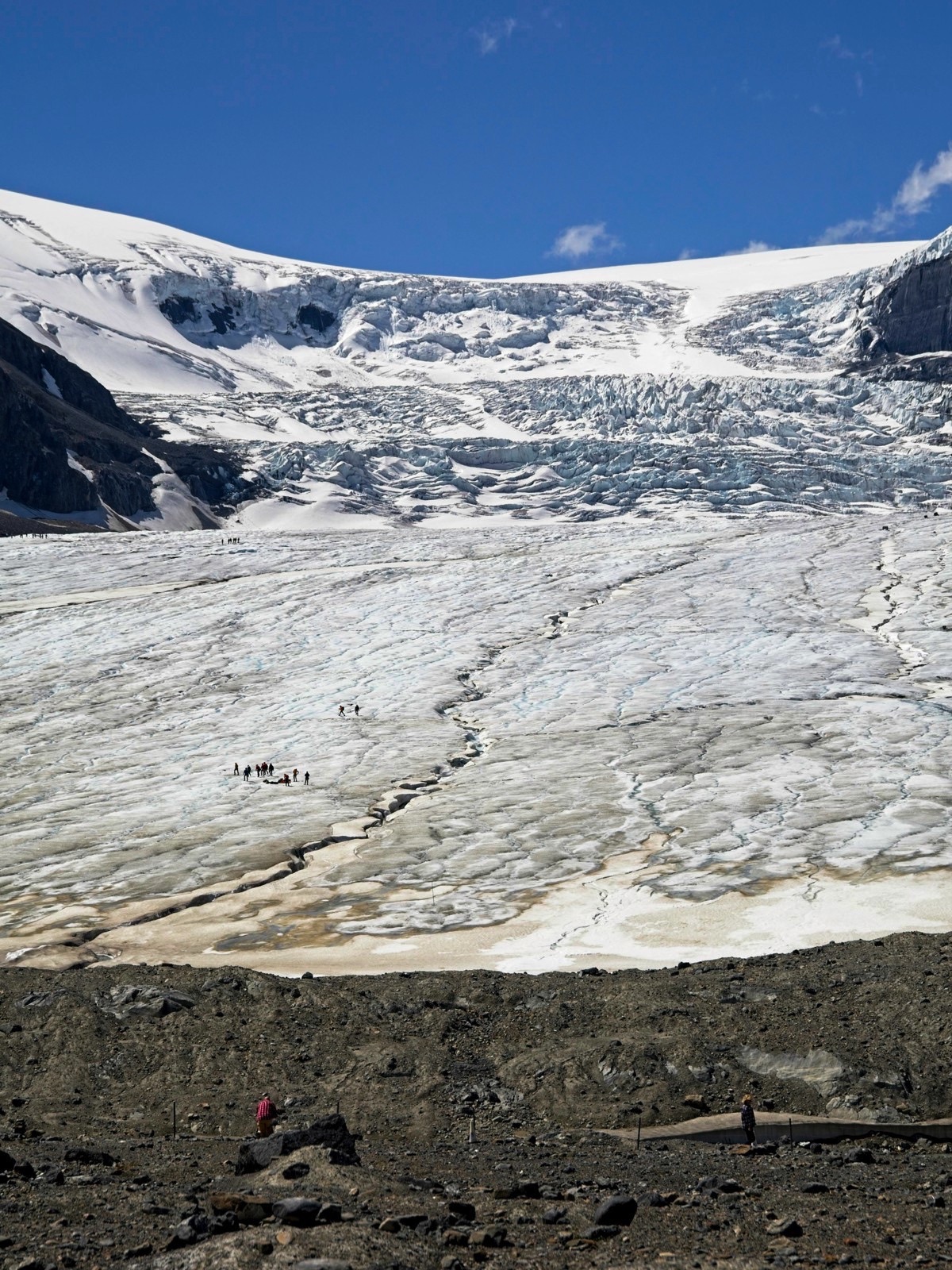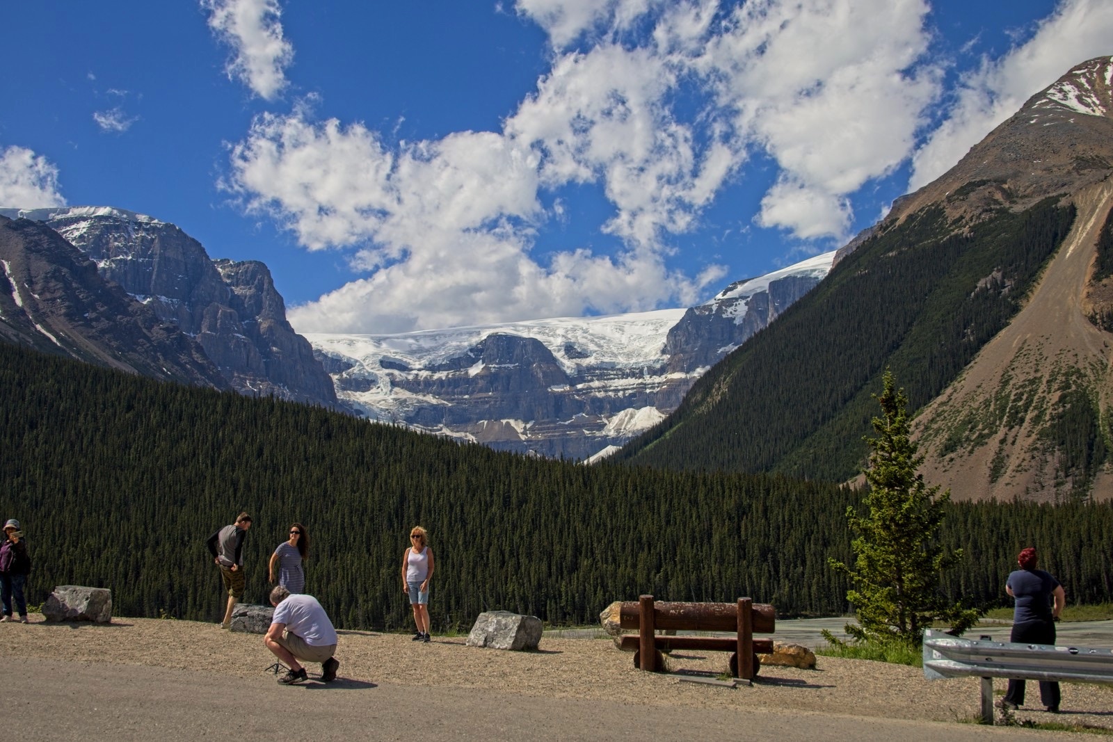 I have just enjoyed one of the most scenic roads on our planet, the Icefields Parkway from Jasper to Banff. The road climbs from Jasper following the Athabasca River with a must stop at the falls then on up to the Columbia Icefield, the largest in the Rockies with a few glaciers rolling down towards the parkway including the accessible Athabasca Glacier. The road then drops down with more glaciers to the right and down deep canyons before another small climb at Peyto Lake for one of the most spectacular views in the Rockies. One of the features that makes this road so good is that much of the road is either straight or around gentle curves allowing the driver to enjoy the scenery, the weather today helped. The headline picture is on the short hike to the toe of the Athabasca Glacier. In fact where I am standing to take the photo was under ice when mum and I were here in 1999. I will go a bit chronologically along the parkway with a stop at Athabasca Falls. There will be a video one day when I have more time! It was busy so I anticipated that despite being an out of season Monday I was not going to have the place to myself. The next photo is typical of the northern part of the parkway, that is now the Sunwapta river. The guy in the next photo was on a fools errand trying to prop up his phone on a little tripod as the glacier winds were strong. I did not wait to see the inevitable damage. Now we are at the Columbia Icefield with a few on the trail to the glacier. The close up is from about the same place as the headline image. I had thought I might take the trip up on the glacier but the queues were pretty long. I should have guessed when I had to search for a parking spot and the size of the fleet of buses that were there and arriving. I took the trip with mum all those years ago but we walked straight onto the Brewsters purpose built bus. There are markers along the way and the glacier was almost at the road in 1903. Next is a typical view of the parkway heading south and on to Peyto Lake. They have built a nice viewing platform but that does not seem to be enough for some. I’ll finish with another grab from in car and the wildlife for the day, mountain goats.
