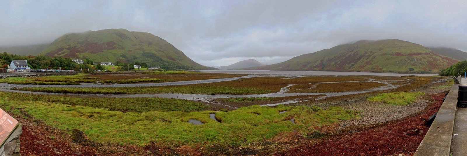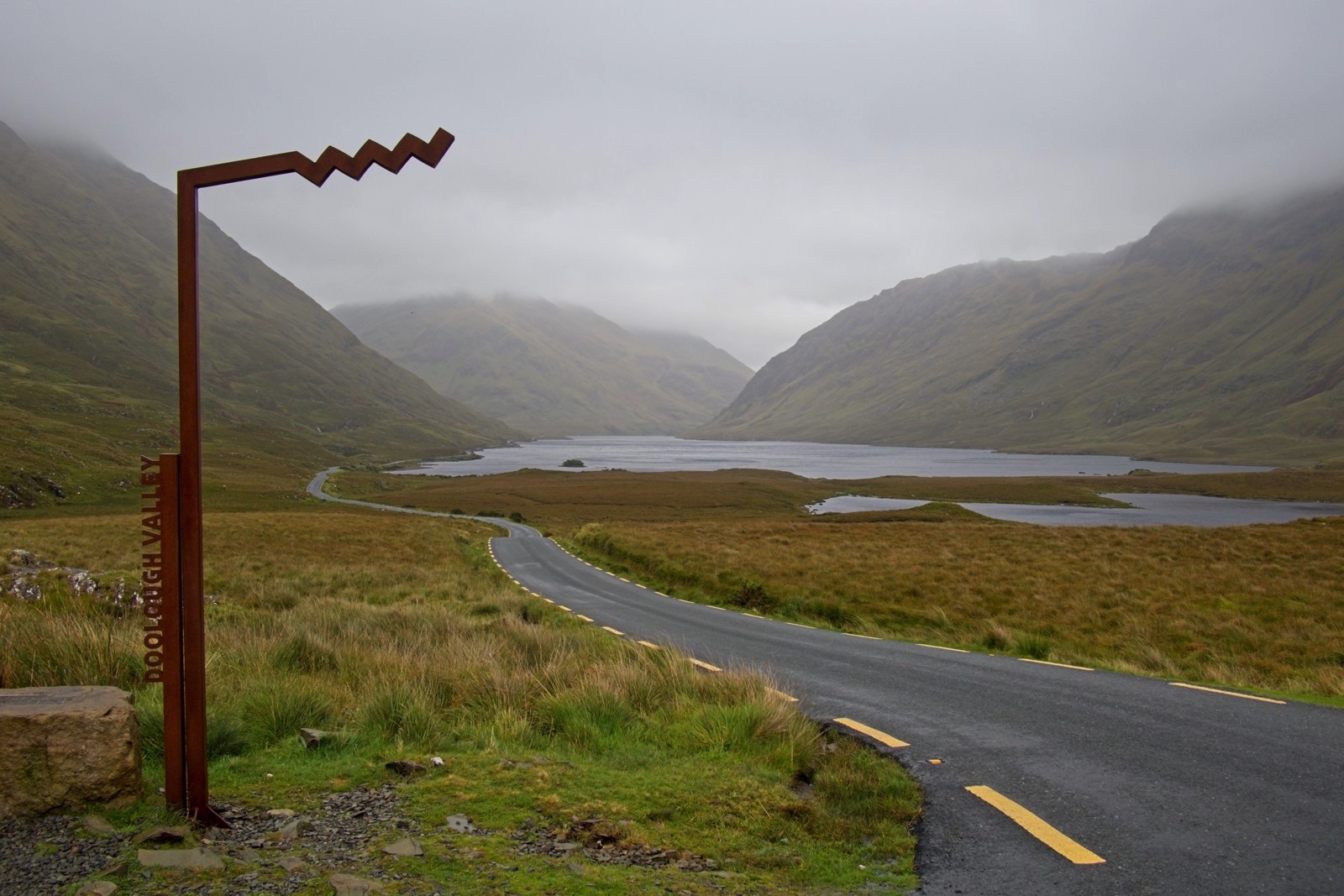 After climbing away from the fjord the next impressive site was Doolough Valley. The Wild Atlantic Way signs help identify locations. Although not in the photo there is a small stone weathered cross recording a march of people to here to avoid the famine with an additional inscription recording the freedom from appartheid in South Africa.