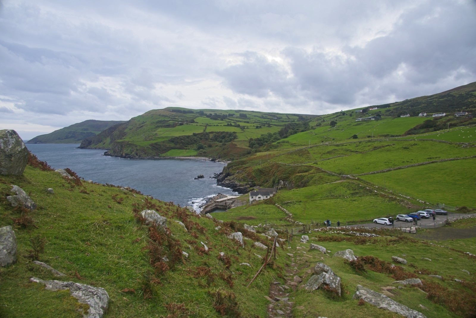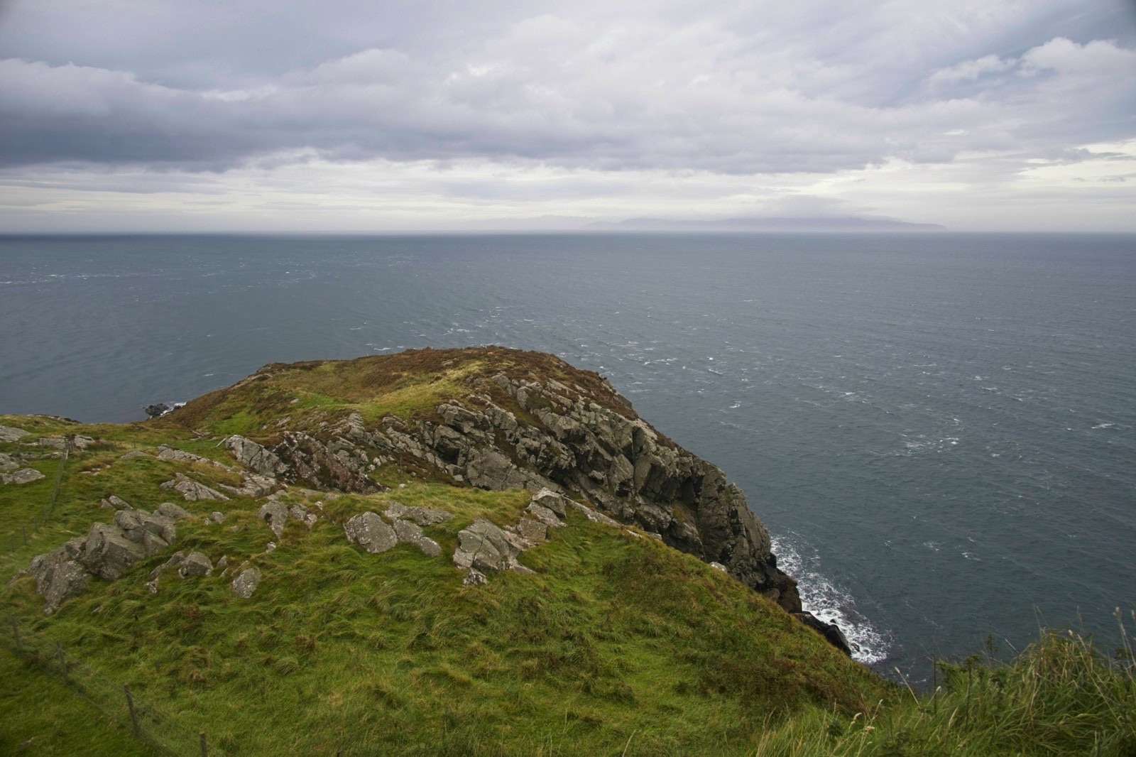 At Torr Head the Mull of Kintyre is visible in the haze and the Causeway Coast cliffs give way to gentler coastal scenery.
