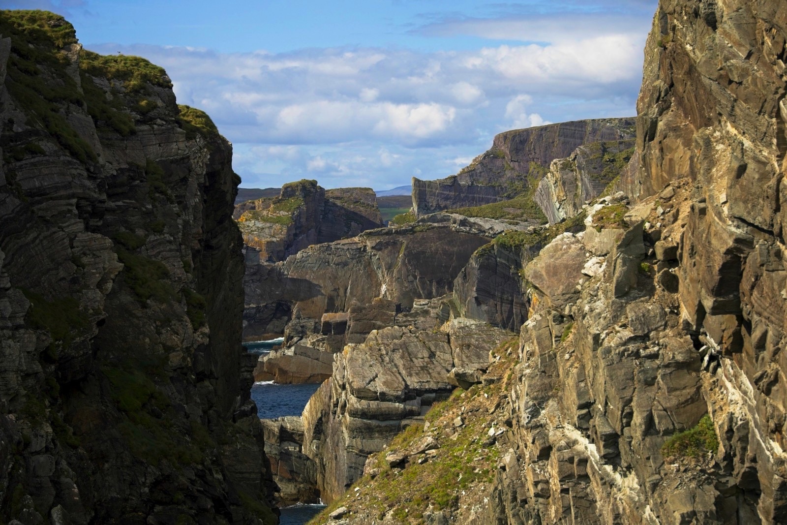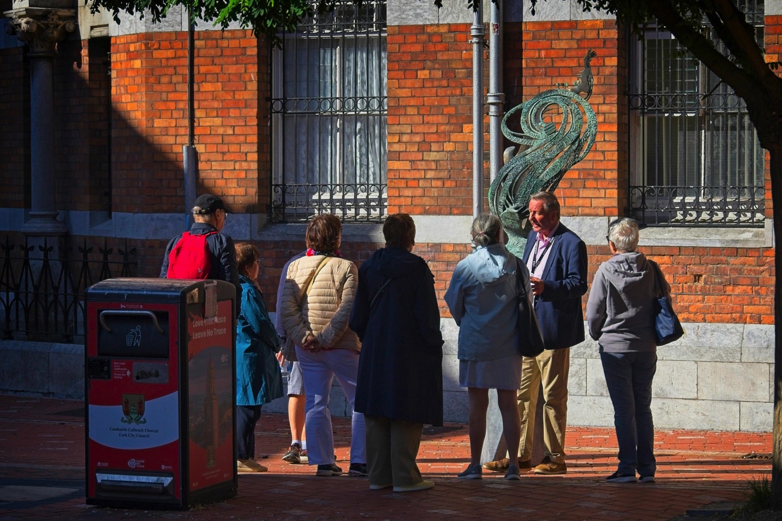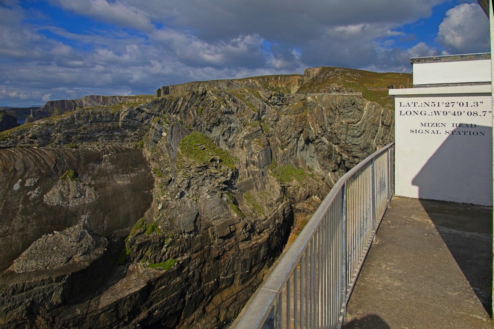 The old saying “If you don’t like the weather just hang on for a little while…….” It is certainly true at the moment. When I went to bed last night the rain was pouring down and a gusty wind was making its presence felt and this morning the sun was shining from a clear blue sky. It was a real benefit as today was about a couple of headlands on the South West coast, Old Head and it’s restored signal tower and also the site of a Lusitania museum and memorial garden, above, followed by Mizen Head, the most Southwesterly point in Ireland looking across the Atlantic to the shoulder of South America, although the world being round I could not see it. To start the day I headed South West to Cork city for a quick look at the centre and to top up the car. I had been warned that Cork was not a major tourist attraction and this is certainly true. My introduction was interesting as the car navigation system brought me in an interesting route providing a panoramic view of the city. After that the city was an enigma. I randomly chose a parking place off North Main Street which turned out to be in an essentially abandoned shopping centre! A wander along the river showed me that there were nicer bits, around the opera house and along some narrow streets with guided walking tours everywhere including one I snapped being presented in German. I have included a few photos of my stroll. Old Head was typical of the area just south of Cork, pretty flat and agricultural, pretty pleasant. The restored signal tower was one of a set which covered the whole coast of Ireland, all in line of site of two others. Quite an undertaking but as interesting was the museum covering the 1915 sinking of the Lusitania of the coast here. A terrible story, a true horror of war. It is a testimony to the volunteers who maintain and develop the site that is was as professional as it could ever be. All of the lost crew and passengers are recorded on a wavy metal panel around a central mast. On my way to Mizen Head I stopped for a 15 minute top up and a comfort stop and was pleased to find lots of families out in the adjacent park enjoy some after school fun. Charged up it was off to my second headland. This time much more rugged and a rearing rocky landscape with incredible folds and twists in the cliffs. It was late in the afternoon meaning a lot of contre-jour photographs with sparkling ocean as a backdrop. There is a red marker as near as it is safe to go to the most South-westerly point. To get to the signal station and the marker it is necessary to cross an incredible chasm on an attractive bridge. Being a clear day the Fastnet lighthouse was clearly visible on the horizon. Very worth the visit. Heading to my overnight stop at Glengarriff I skirted round Bantry Bay and arrived at my waterfront hotel with a room with a view. A great day.