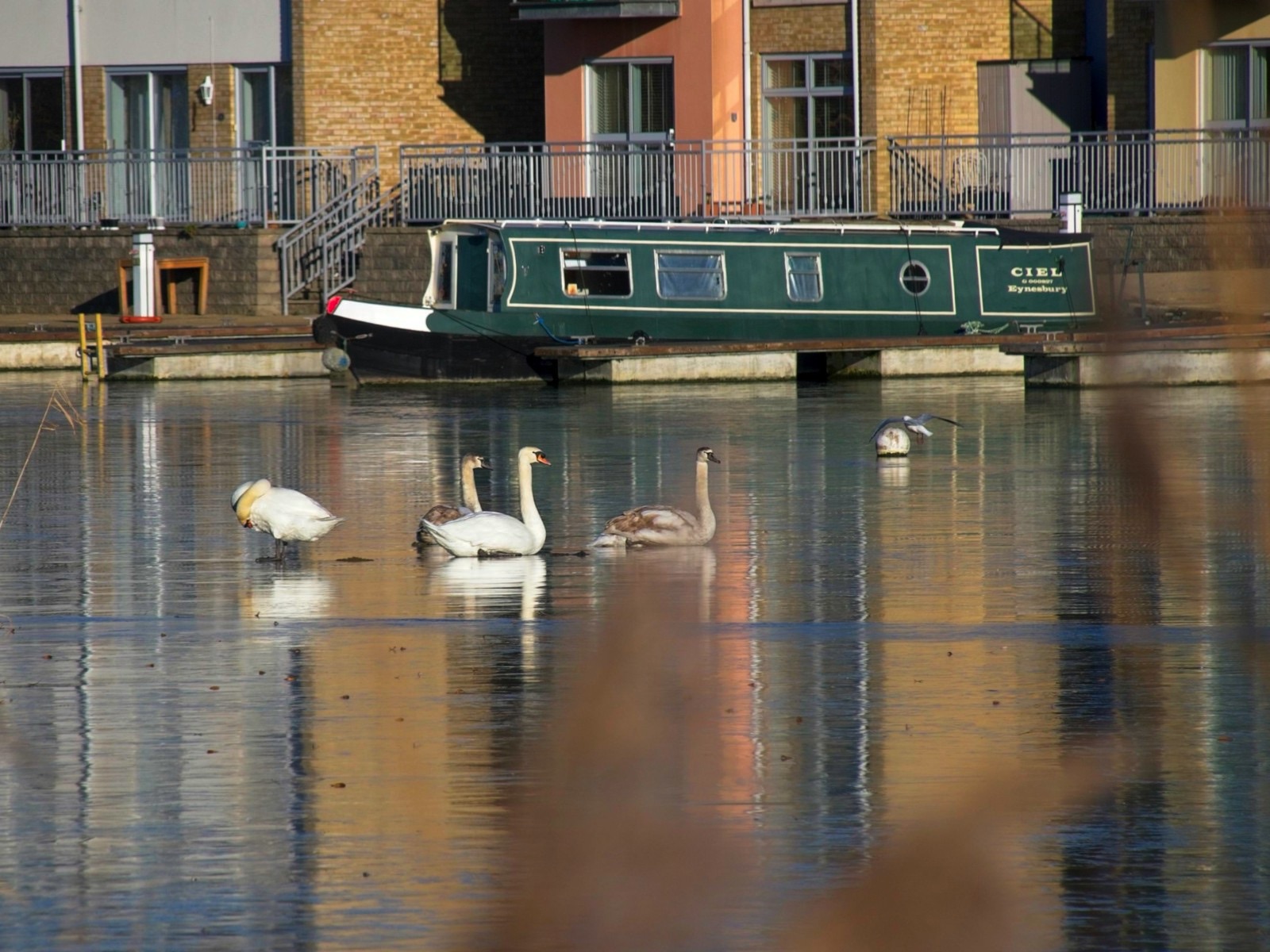 I enjoy my regular walks around the town. We are blessed with paths which take you away from traffic so little noise and pollution. These photos are from the past couple of days. Although comfortably below zero overnight and in fact when I was out yesterday there is still limited visible frost as the humidity is pretty low. The power station at Little Barford creates its own clouds in weather like this. It almost acts as a thermometer. There are actually two cloud sources, the main exhaust chimneys and behind the low level cooling towers. The cold weather has frozen a large part of the marina, creating interesting challenges for the swans. My local squirrel was pretty bold despite spotting me it was determined to get to the sunflower hearts.