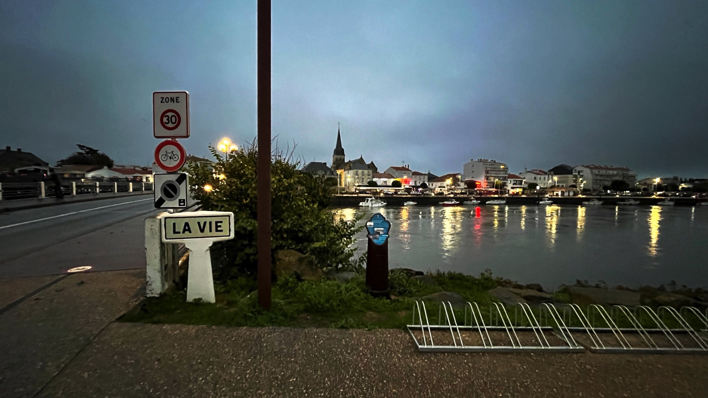 The day started promisingly with a little sunshine as I drove up the Medoc peninsula following the route du vin, Bordeaux, to Le Verdon-sur-mer to catch the ferry to Royan, across the mouth of the Girande estuary. There was a forecast of rain later but I could not have imagined how heavy and prolonged it would be. Light rain on the ferry continued to Saintes for a charge to the car and a panini for lunch but within a few minutes of heading towards La Rochelle the rain just built and built. Heavy at La Rochelle and torrential at Le Roche sur Y’on and then all of the way to my overnight at St Gilles-Crois-de-Vie. (the Vie refers to the river that bisects the town). In many places the road was pretty much flooded, particularly on the dual carriageways around Le Roche. The resut was a little traffic chaos and a couple of detours. Fortunately when it came time to head out for dinner the rain had passed. The problem then was to find anywhere open. The hotel recommended restaurant was closed, the Google top recommendation was closed, in fact but for a couple of bars and takeaway pizza places there was only one proper restaurant open and as I noted on a Facebook post, it was packed and the food and drink were just fine. I managed to get my dailly excercise wandering the streets in search of sustenace, so all good. Not too many picture opportunities today, one because of the weather and the other was time constraits to catch a suitable ferry. Anyway here are a few wine route pictures, including the headline and include a stop in Pauillac, situated on the Girande, and I could not resist one at the entrance to Chateaux Latour, not that I can afford the wine. I remembered from a previous trip here about 20 years ago the unusual fishing system along the river. I am sure it must work. It was fascinating passing so many places famous with wine named for them. Included is a snap of the empty deck on the ferry after we had all retreated to avoid the increasing drizzle. I drive down to the old port in La Rochelle and got soaked taking a handful of pictures. I’ll finish with a few pictures in St Gilles where one could have fired the proverbial automatic weapon and not hit a soul. Another interesting day and a good test of the car’s defoging system. It works well without killing the range.