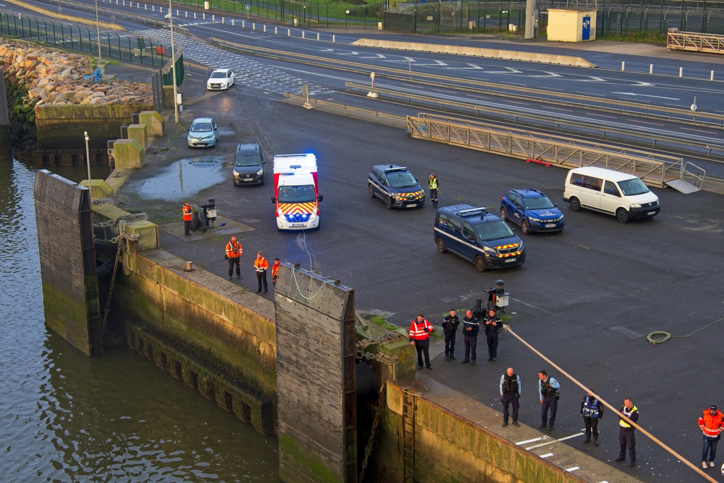 Despite a little spit spot of rain the hardier interested passengers continued to ‘enjoy’ the spectacle as the gendarmerie arrived by boat for their effort to get us going.