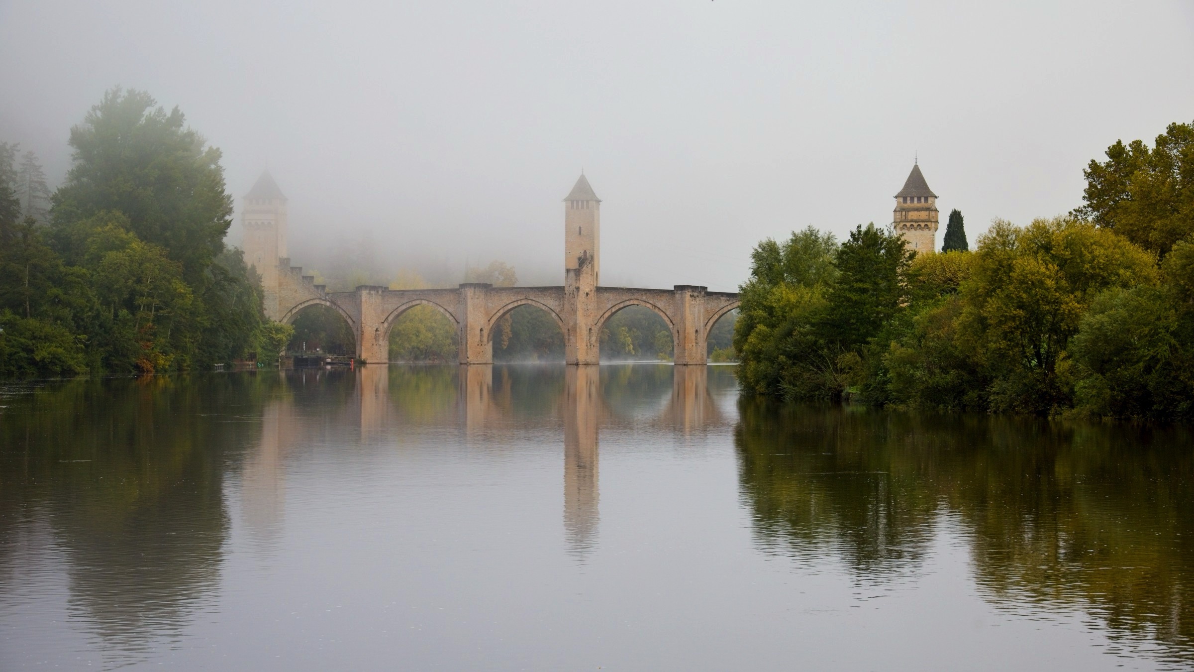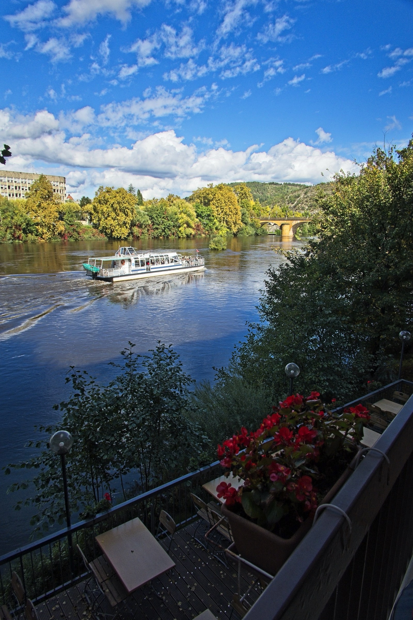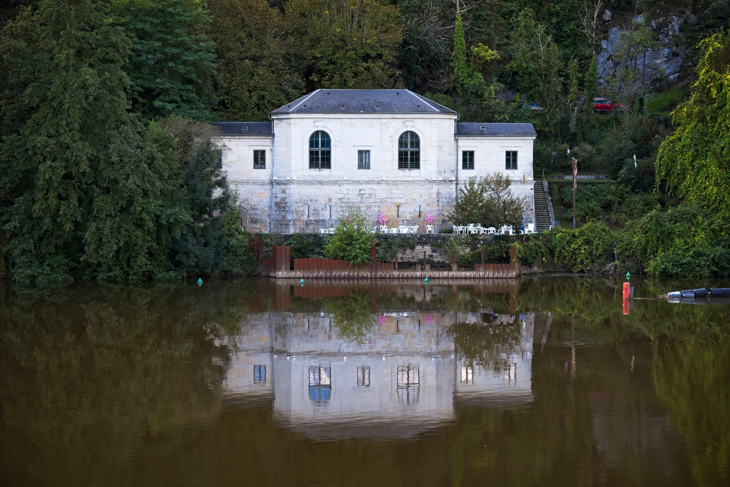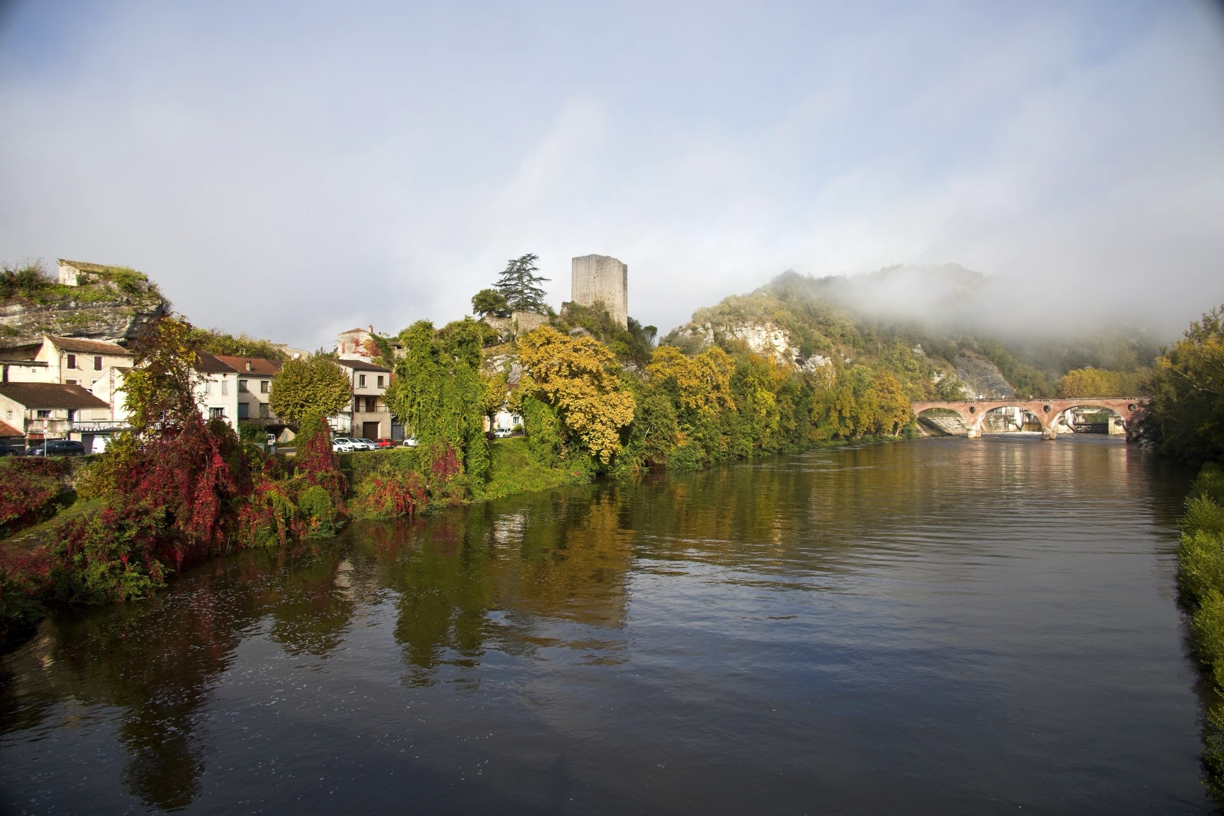 No it was not a miserable day, weatherise, although I was not upset to see mist on the Lot from my balcony when I got up. A quick change of plan and a walk up to the Valentre Bridge in the mist avoiding death from the commuters along the very narrow riverside road. This is the wonderful Valentre Bridge, more of which later. With mist it is all about luck and timing. The view back to the railway bridge was gone in 10 minutes and a look back at the Valentre quickly sharpened. After this unplanned walk I headed off to the wine country to two key locations, Luzech and Puy l’Eveque, both down stream from Cahors. How about vines in the mist. I actually made two stops in Luzech, morning and afternoon, which were very different. It sits inside a tight bend in the Lot and is famous for its tower and its vineyards. So here we go out of sequence morning mist with umbrellas and afternoon sunshine on the vines and a nice little chapel. Puy l’Eveque as its name suggests is a rocky promontory above the Lot and has an upper modern town and lover mediaeval town a good 240ft climb down and back. (Thank goodness for an excellent local patiserie to replenish energy). A pretty flower grabbed my attention but then I realised it was alive with little bugs. I will need my horticultural experts to advise on the plant species but lets just call the bugs, bugs. I got back to the hotel early afternoon had a little rest and then took a walk up the other side of the river to the Pont Valentre. Much less risky than on “my side” of the river. The predicted cloud cover was approaching but there is nothing that diminishes the spleandour of this construction. Although dating from the 14th Century the current restored version dates from the 19th Century. I came here many years ago and was impressed and thought I should return. About 30 years later I did and then twice in one year. There are also lovely buildings along the river creating perfect refletctions. There is another reason to come here, as noted in some sligtly intoxicated Facebook posts, and that is the Hotel Restaurant La Chartreuse which I finish the post with. It is in the classic Logis de France tradition of a restaurant with rooms, although in this case the rooms are pretty decent. The Logis philosophy ensures that food and drink of the locale are offered and I am in my element here with a soft spot for Malbec wines and French cuisine full stop.