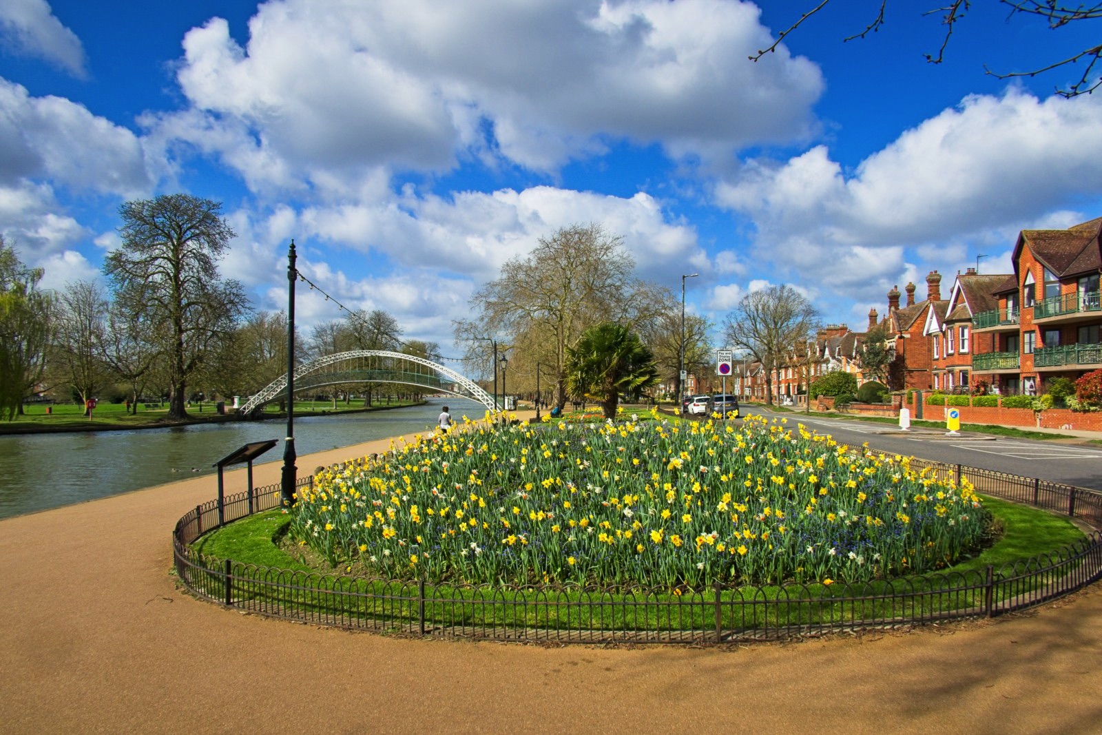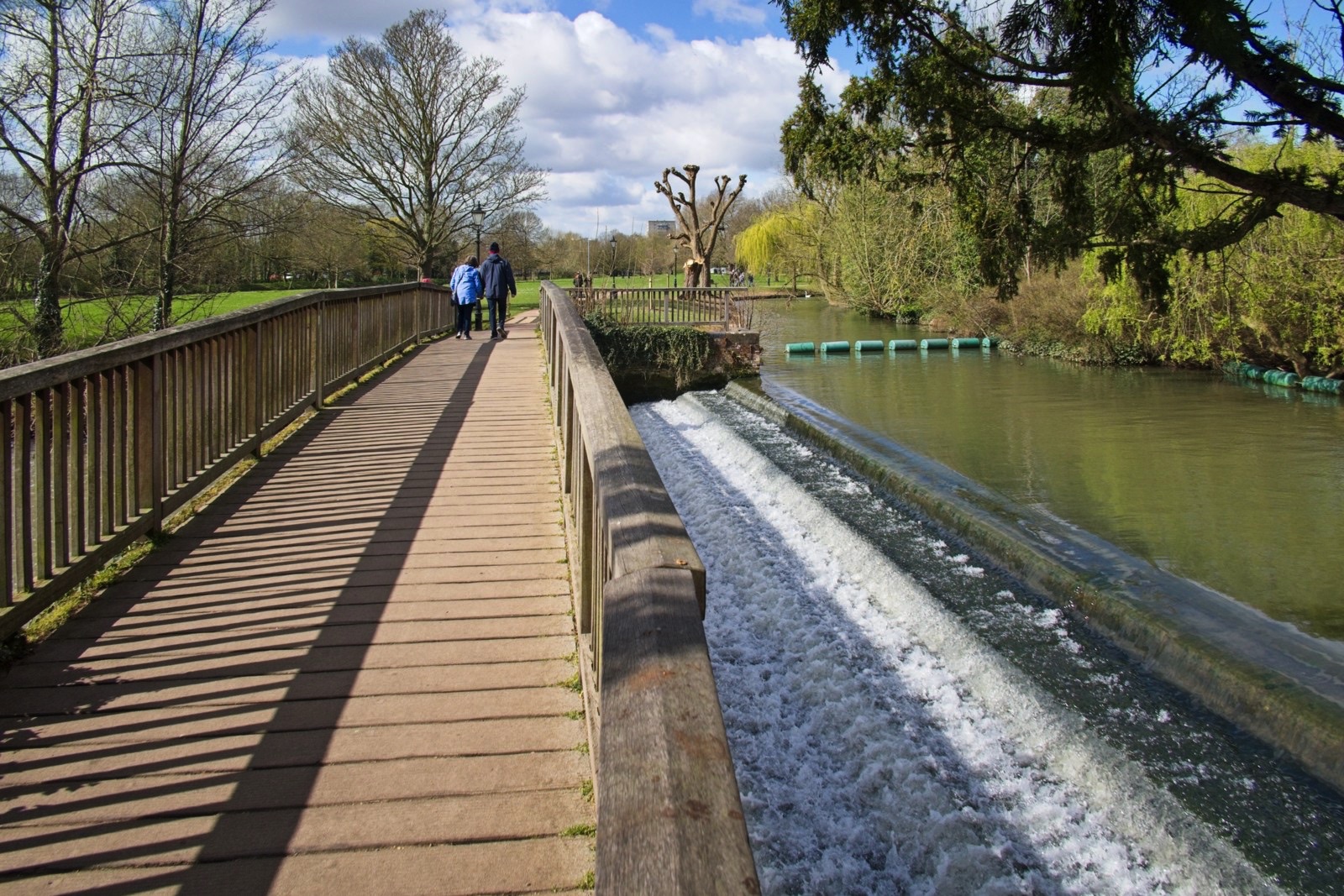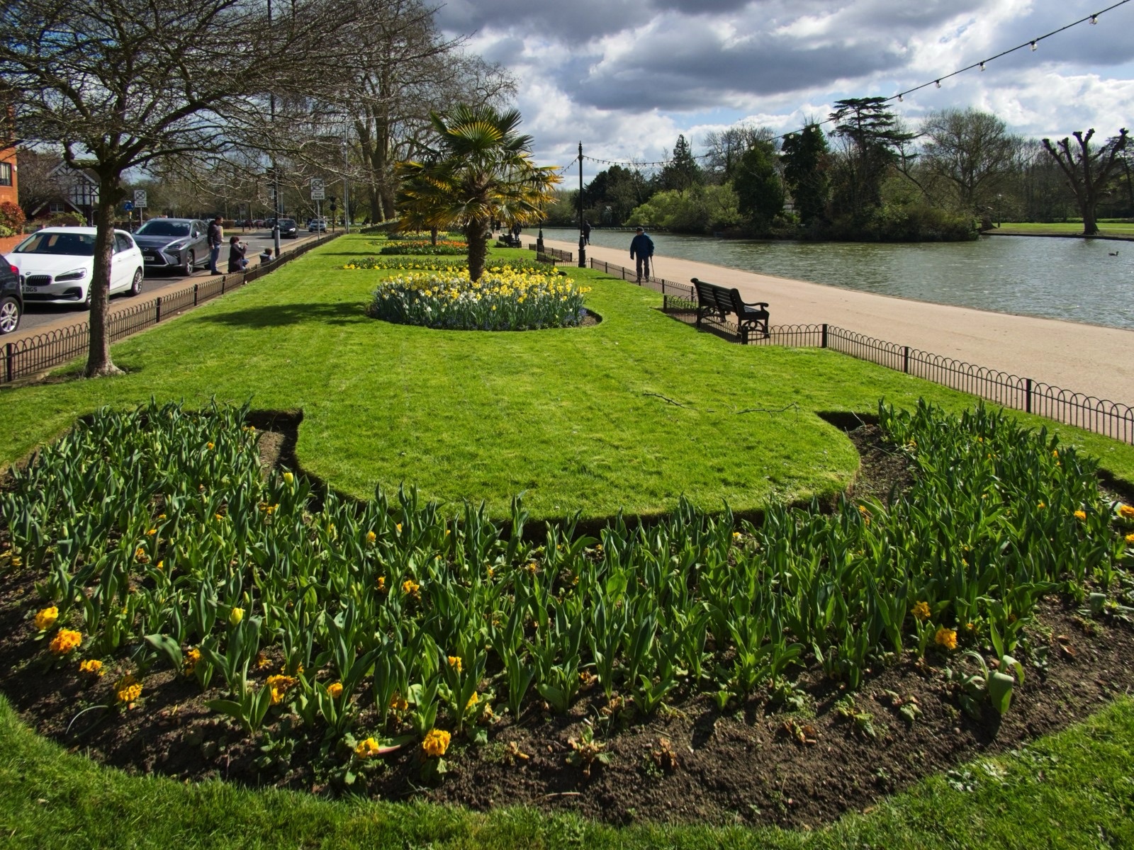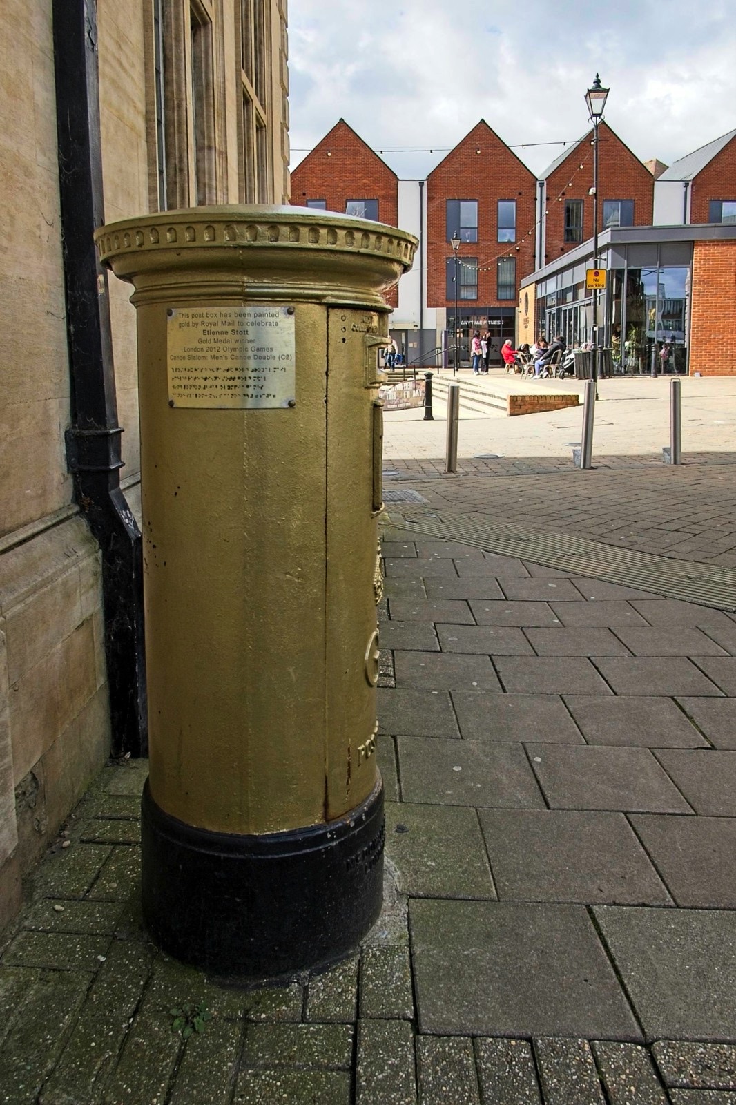 A sunny Sunday morning along the Embankment in Bedford makes for a lovely spring walk. The town always puts on a display of flowers through the year and the spring blossoms are popping out, including my first tulips of the year. I assume the gardener responsible for the tulips has been fired for allowing a rogue pink blossom in the orange bed. (I hope not!) I was pleased to see a few people out enjoying the day and feeding the swans. I have commented before about Bedford and the fact that a small provincial town has such a wonderful and expansive riverside embankment. The main river drops down to the South and this stretch along the Embankment is managed and used widely for rowing. There is an additional water sports facility at the weir where the river drops, if you like your canoe slalom, named for local boy Etienne Stott. He won a gold medal in the 2012 Olympics and his gold post box is tucked around by the town hall.