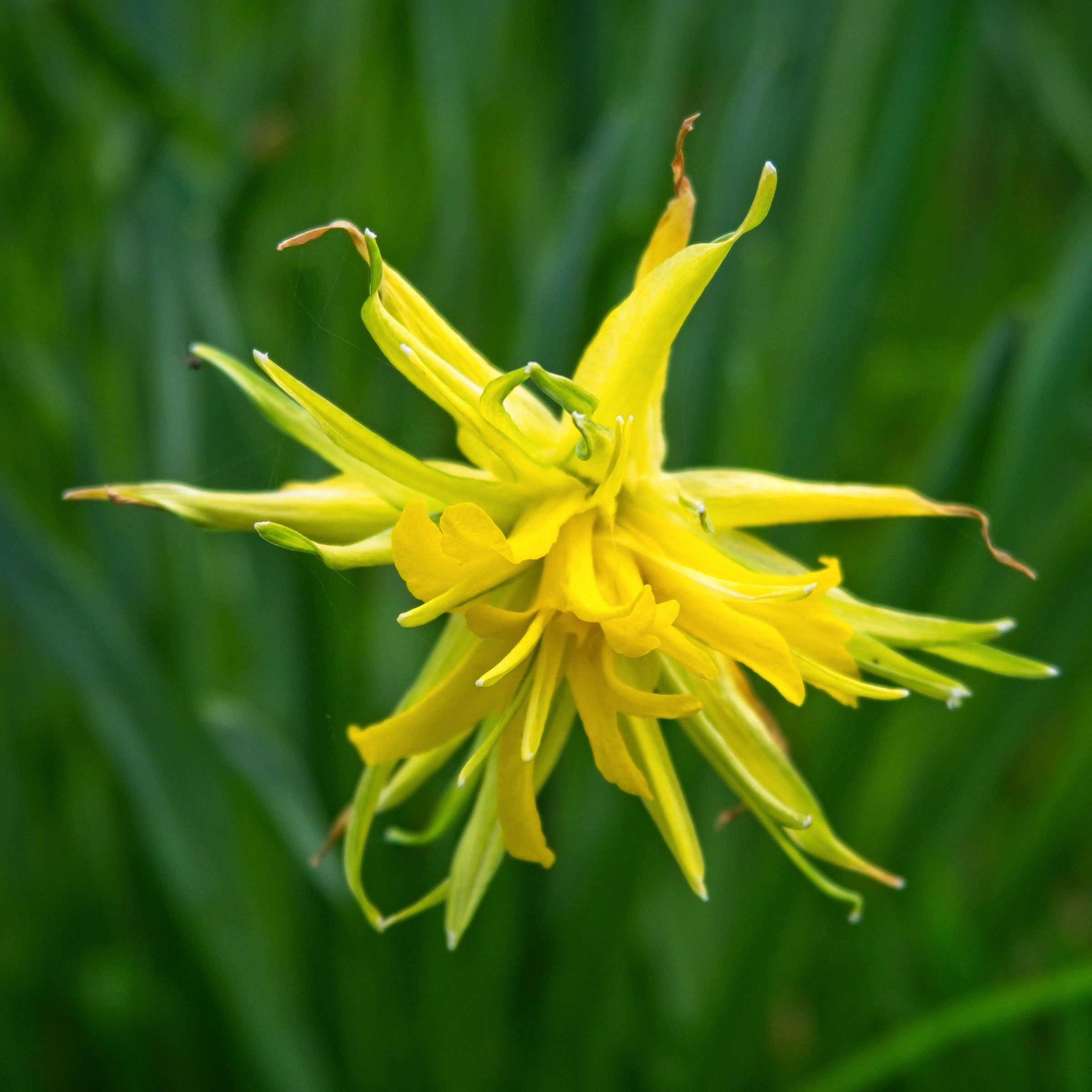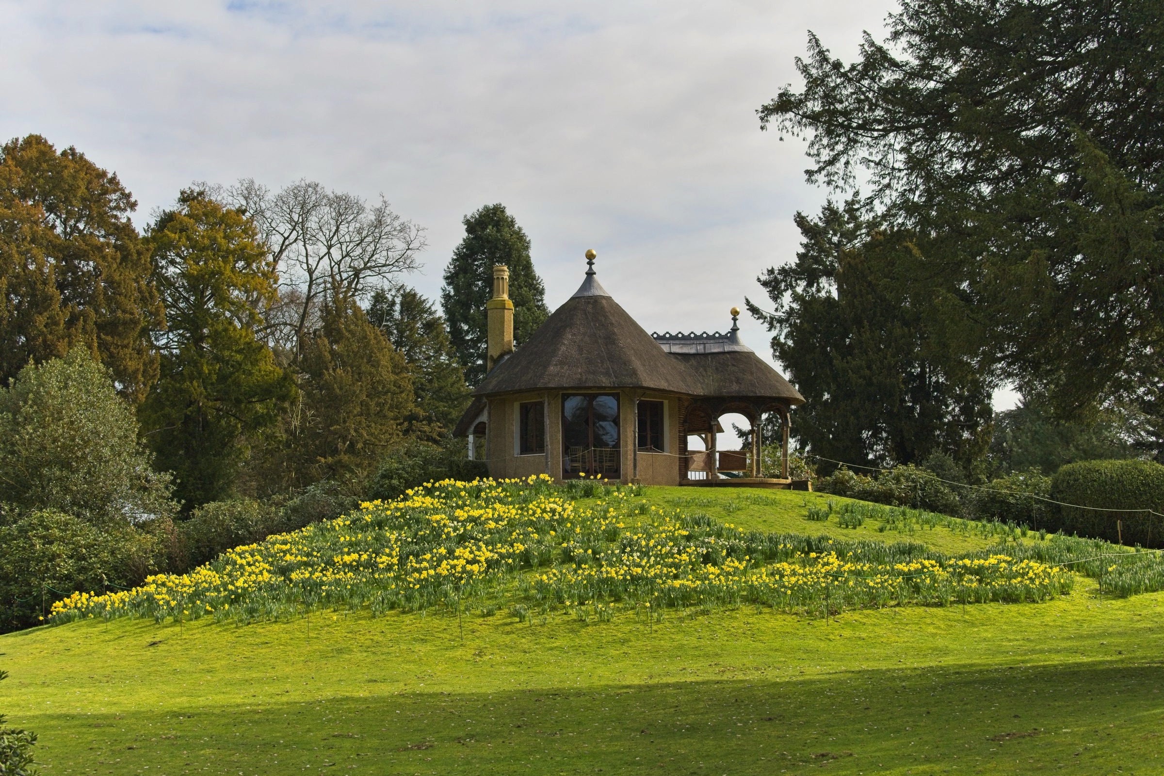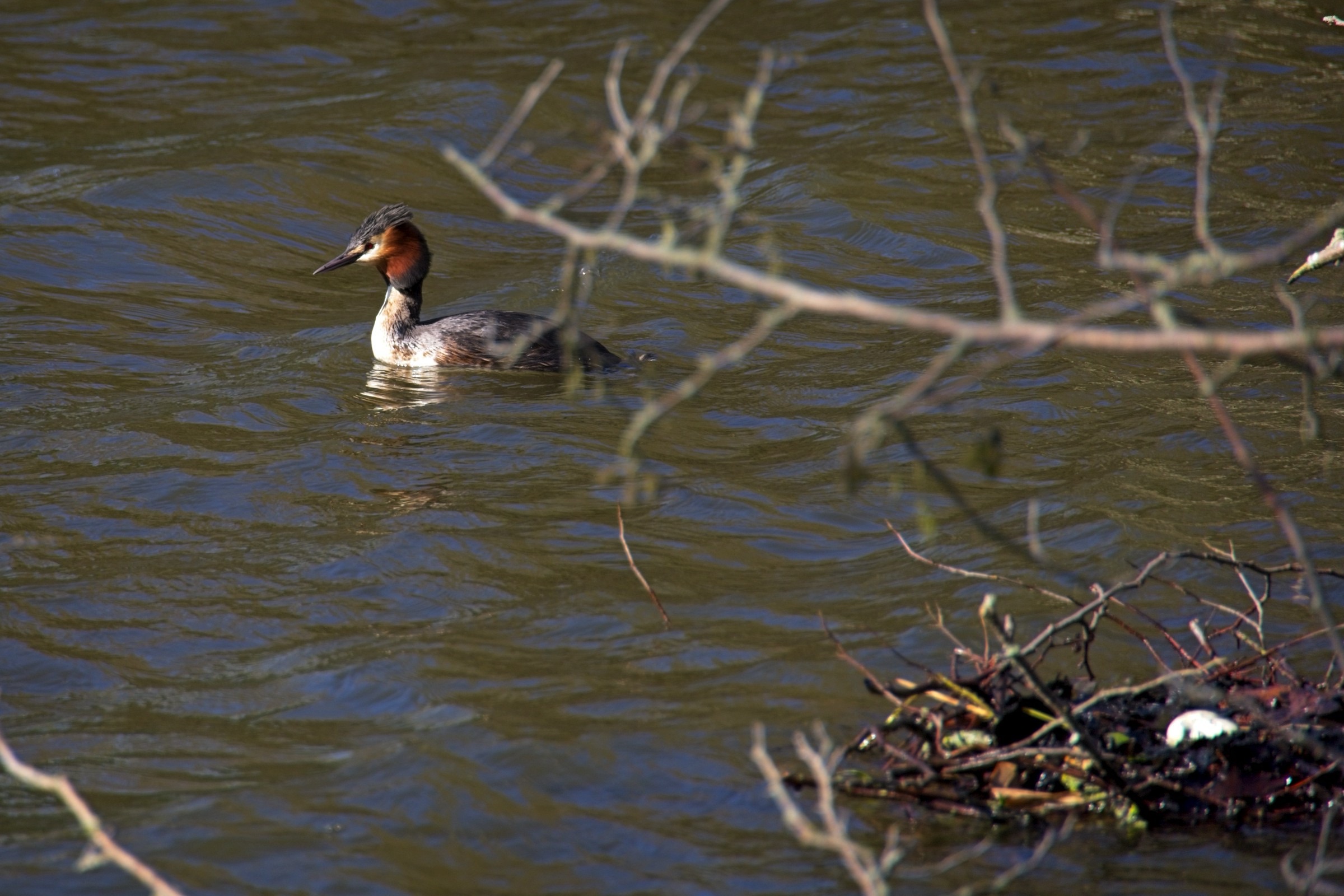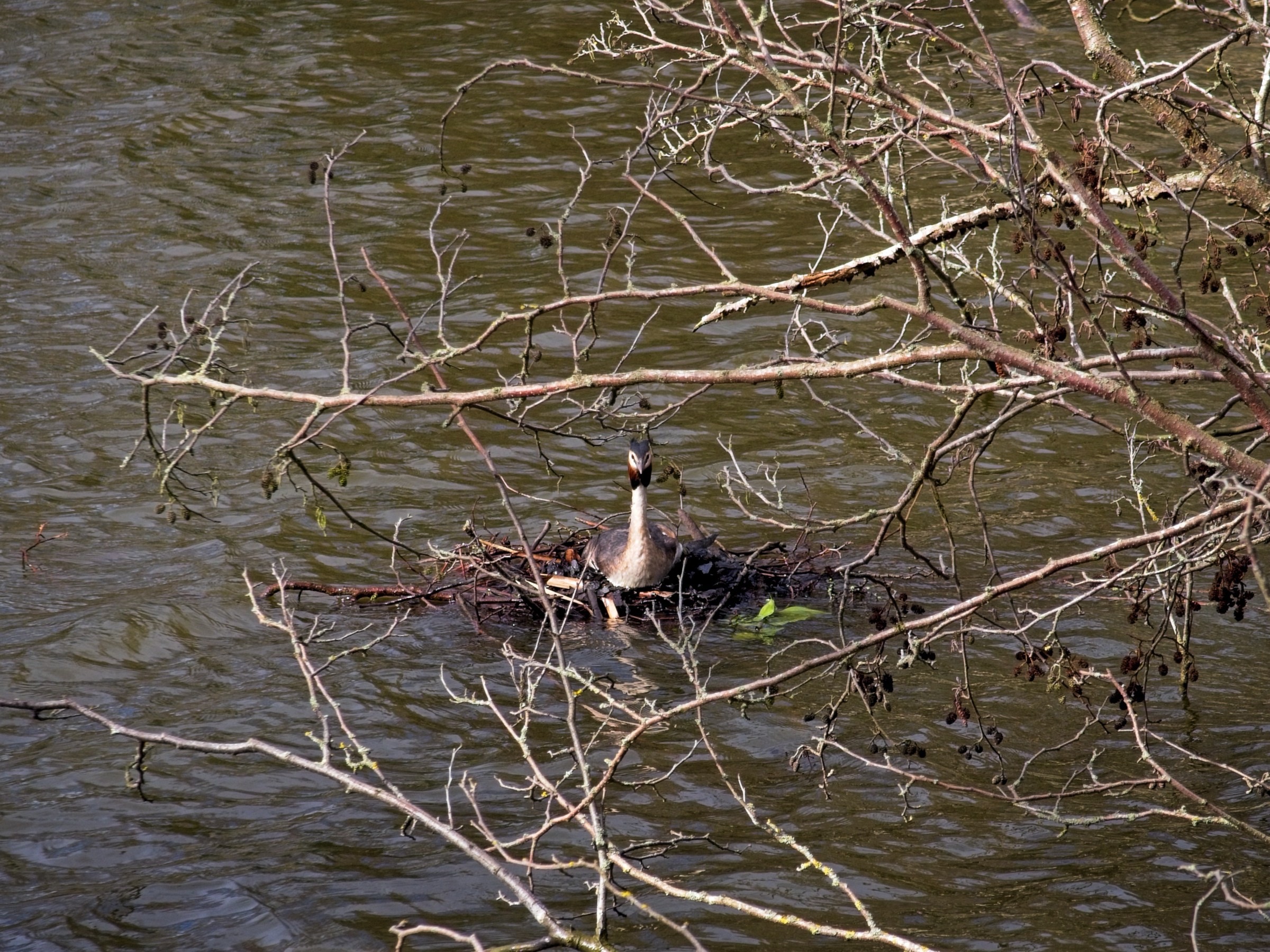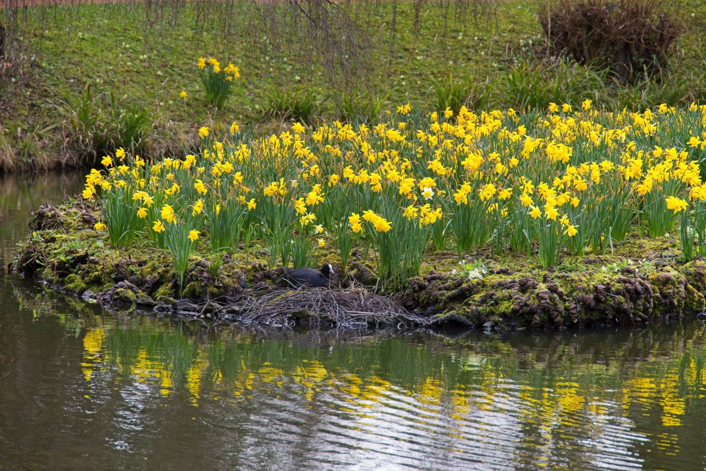 The daffs are out. There is a quant variety in the Swiss Garden, all spiky, which I am told is called Rip Van Winkle. I like it. There are quite a few varieties on show and on a little island they provide some cover for a coot’s nest. On the lake, a great crested grebe has chosen to nest close to one of the angler’s ‘piers’. That is a big egg but just the one on Sunday. I don’t know how many she is sitting on now. The first of the magnolias are bursting out and our blue peacock remains on duty at the gardener’s hut. It is a lovely time to wander the garden in the sunshine.