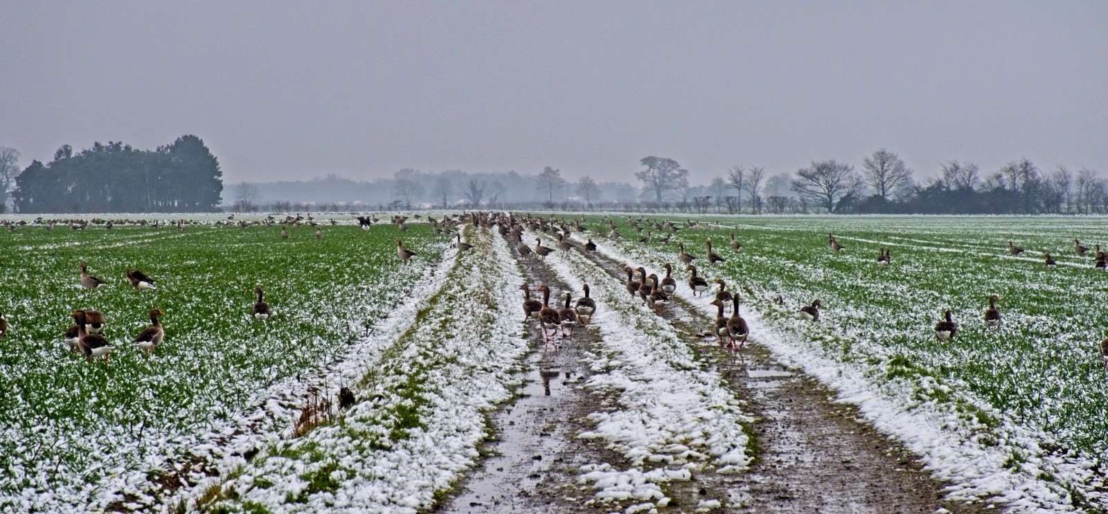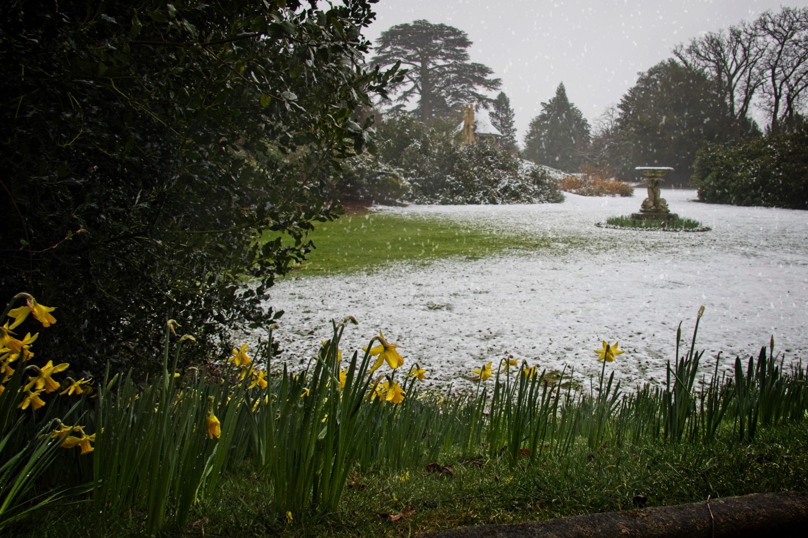 We planned a walk at Old Warden for Thursday morning and a bit of wet snow did not deter us. It was nice to get out for some interesting winter images around the gardens and paddocks. The temptation to take some monochrome images could not be resisted with, as Joni Mitchell would sing, the naked trees looking great. A little plot of daffodils were looking a bit sorry for themselves. On the drive in we glimpsed a decent sized flock of greylag and Canada geese so a quick dab on the breaks and out with the camera was worth getting cold.