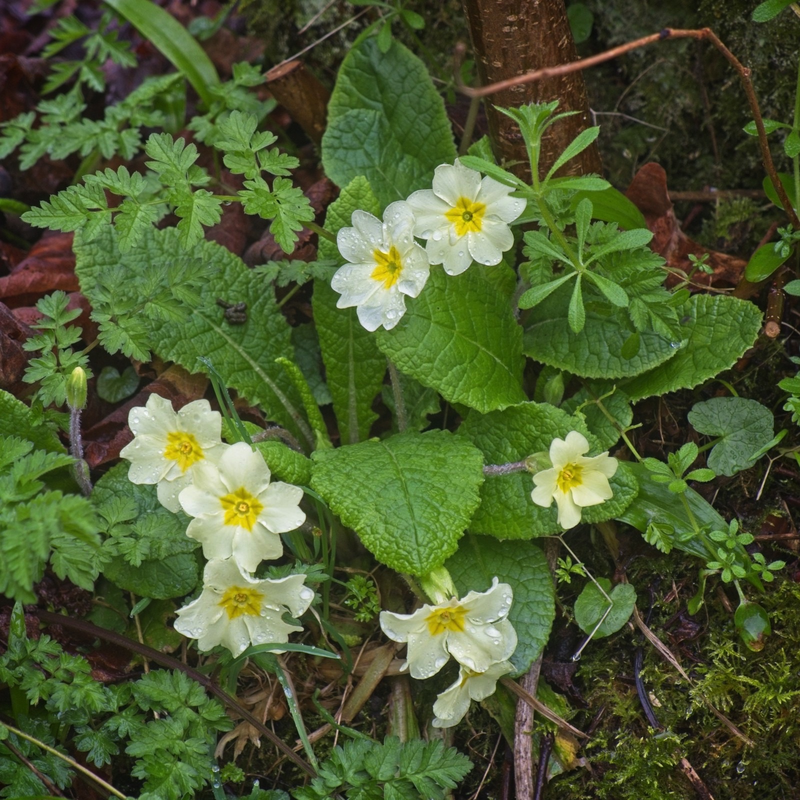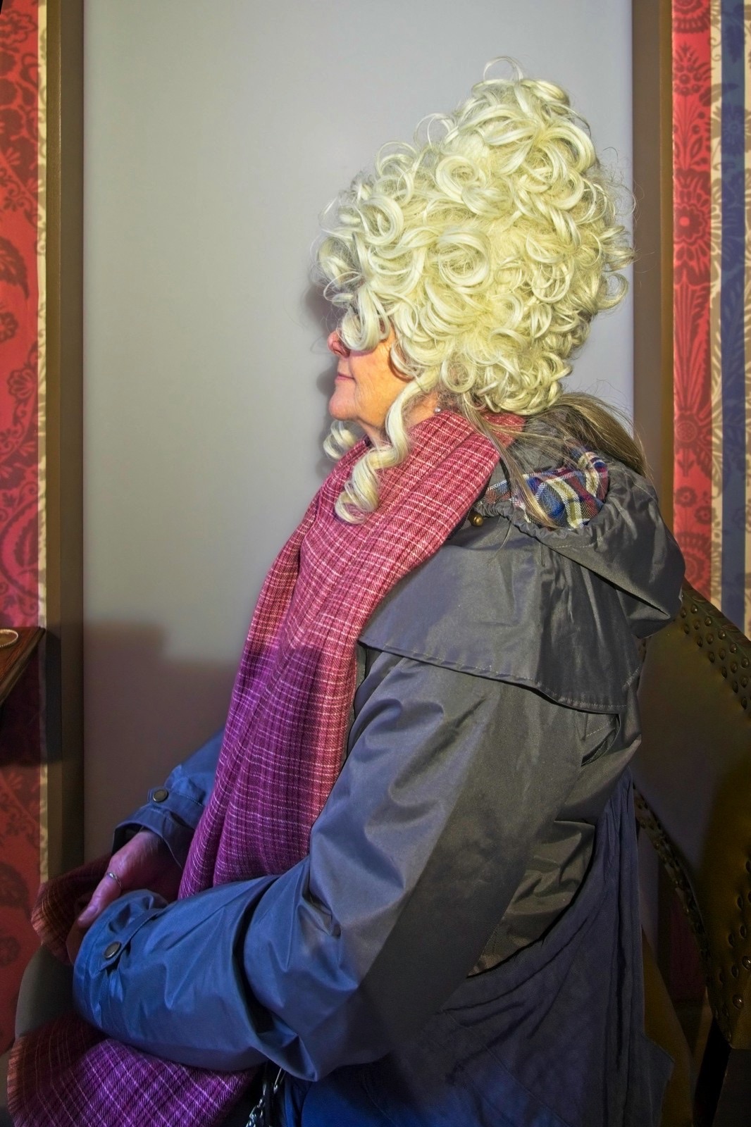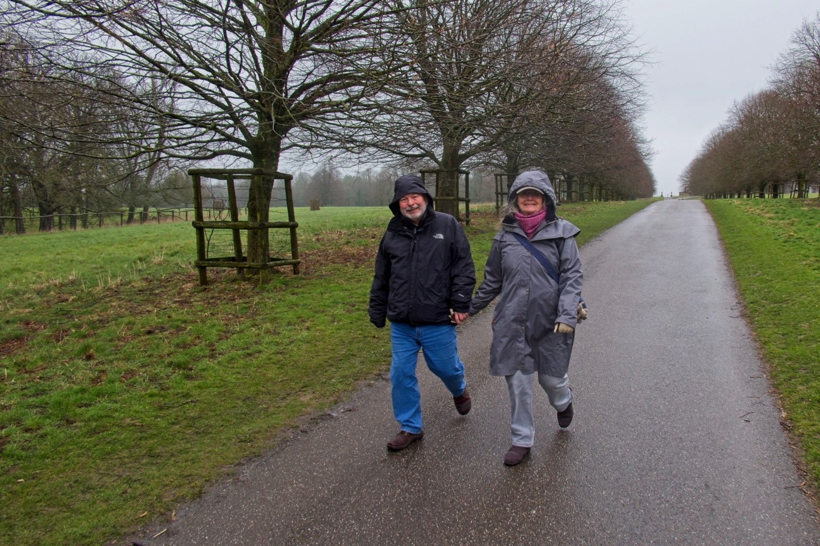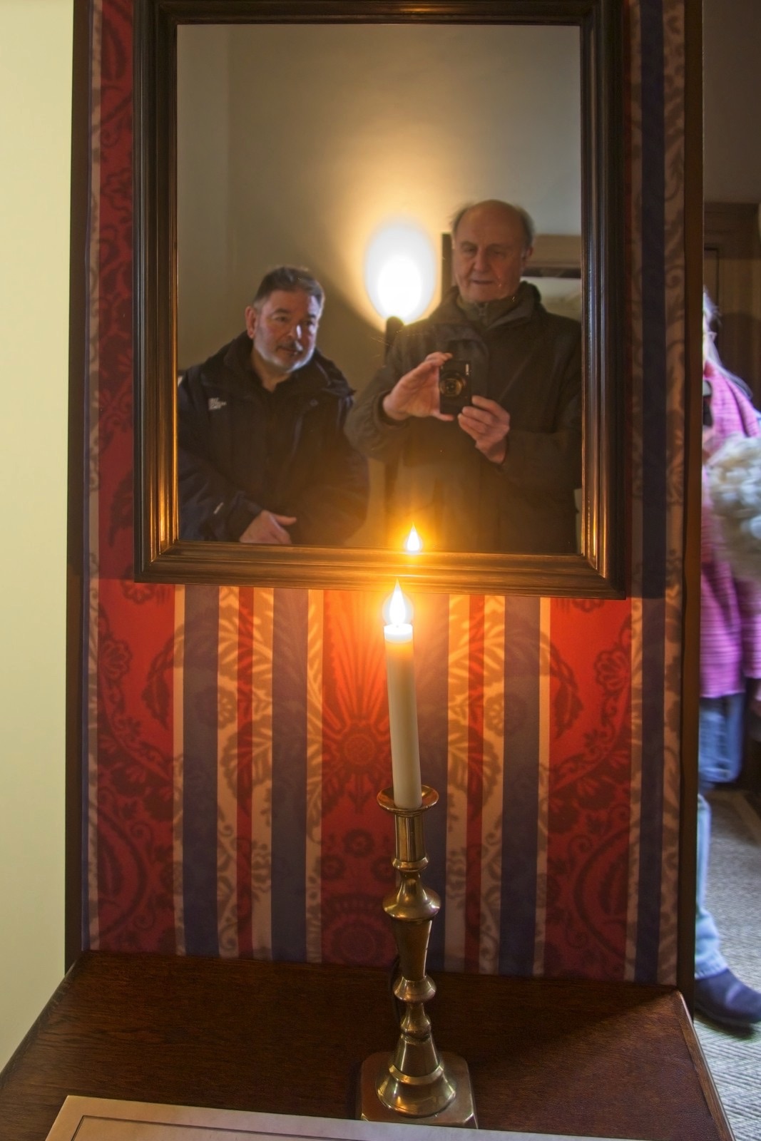 Following on from my post from Bristol yesterday here are some pictures from Dyrham Park near Bath from Wednesday. It was not exactly dry but also not terribly wet as you can see with Deborah and Tim well dressed for the weather. It is a fair distance down to the house and gardens and as Tim and I can attest it seems a bit further back up the hill. There were echos in my mind of a Billy Connolly song “Why Don’t They Come Back To Dunoon” which includes the line “it’s got hills you can walk up as the rain’s running down”. Rain adds a touch of magic to flowers by adding natural water droplets as on the primroses an daffodil. We stopped for a chat with a couple of gardeners who were putting up some natural fencing and did a bit of plant identification for us. The formal gardens looked rather fine. Mr Brathwayte, who built the house, was a lover of Delft pottery and there are quite a few tulip display pots including a couple in a tapestry covered room and one in the Delft tiled kitchen. How about a candle lit selfie with Tim and also Deborah trying on a wig. I’ll finish with a glimpse into the heated greenhouse. There was a range of citrus including what I think are tangerines.