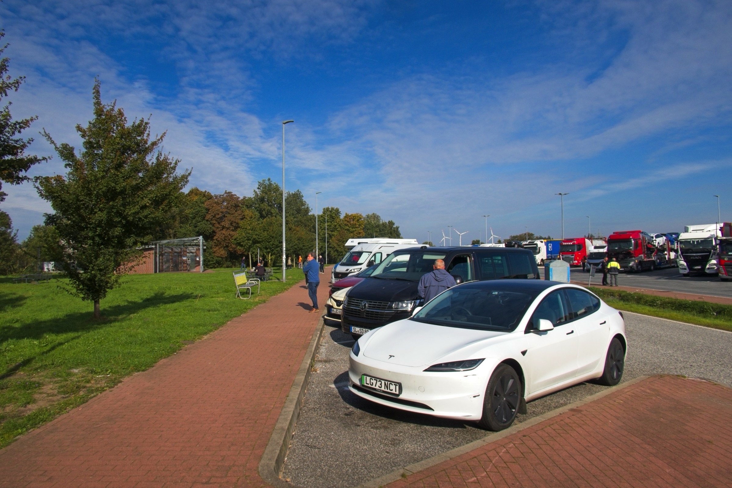 No sightseeing today just a steady autobahn drive from Aalborg in Denmark to Bremen in Germany. Apart fro serious roadworks near Aarhus and causing a major hold up around Hamburg it was a pretty easy run, but windy in places. The only place that I would like to have stopped for a photo op was at the Kiel Canal which allows shipping to go from the Baltic to the Atlantic. I assumed there would be a junction near the crossing and checked at my stop before Kiel. Wrong! I could not see a junction on either side of the canal so asked the navigation system to take me to see it. The response was not good as it would add 40 minutes to my journey. So I just saw it from the bridge with ship actually passing underneath. The pictures today kind of illustrate a road trip in an electric vehicle. I do not generally let the navigation system decide where I should charge as I generally have a route planned. Today I just let the system do its work. The software selects charging stations that will provide the fastest journey based on minimising charging time. The current software also allows me to set an arrival charge level at my destination. As I like to be charged for the next day the car added an extra charging station just 8 km from the hotel to ensure I would be ready for the morning. The total journey was 572 km which took 8 hours and 19 minutes of which 56 minutes was spent charging. Without the top up for the morning the charging time was 35 minutes. The first charge was long enough for me to walk to the adjacent McDonalds for a coffee and the toilet and back with a few minutes to spare. The second was a “sit in the car and have a snack” as the adjacent shopping centre seemed abandoned. There were also a couple of comfort stops at rest areas. I also took advantage of a quiet stretch of Autobahn to let the Tesla fly. It just effortlessly accelerated to 160 kph (100 mph) and would have kept going. It felt completely stable and eerily quiet. Noise level used to be a good indicator if I was going too fast but not in my Model 3. Here are a few pictures which illustrate the variety of locations where you find Tesla Superchargers plus a few from the road. I mentioned roadworks and around Aarhus they stretched for about 25 miles with an 80kph speed limit which was easy to keep up to. It was like they are building a completely new road. The headline image is from Aalborg, so that is Christmas sorted out. :-) The other pictures are captioned apart from the final one where the words of John McEnroe “You cannot be serious!” come to mind. Having to fold the mirrors to park the car in the hotel car park is a little different. From entering the car park my car tells me it took 5 minutes to manoeuvre the car into this spot. It required a 57 point turn as behind the camera, close by, are other spots the same but occupied by other vehicles.