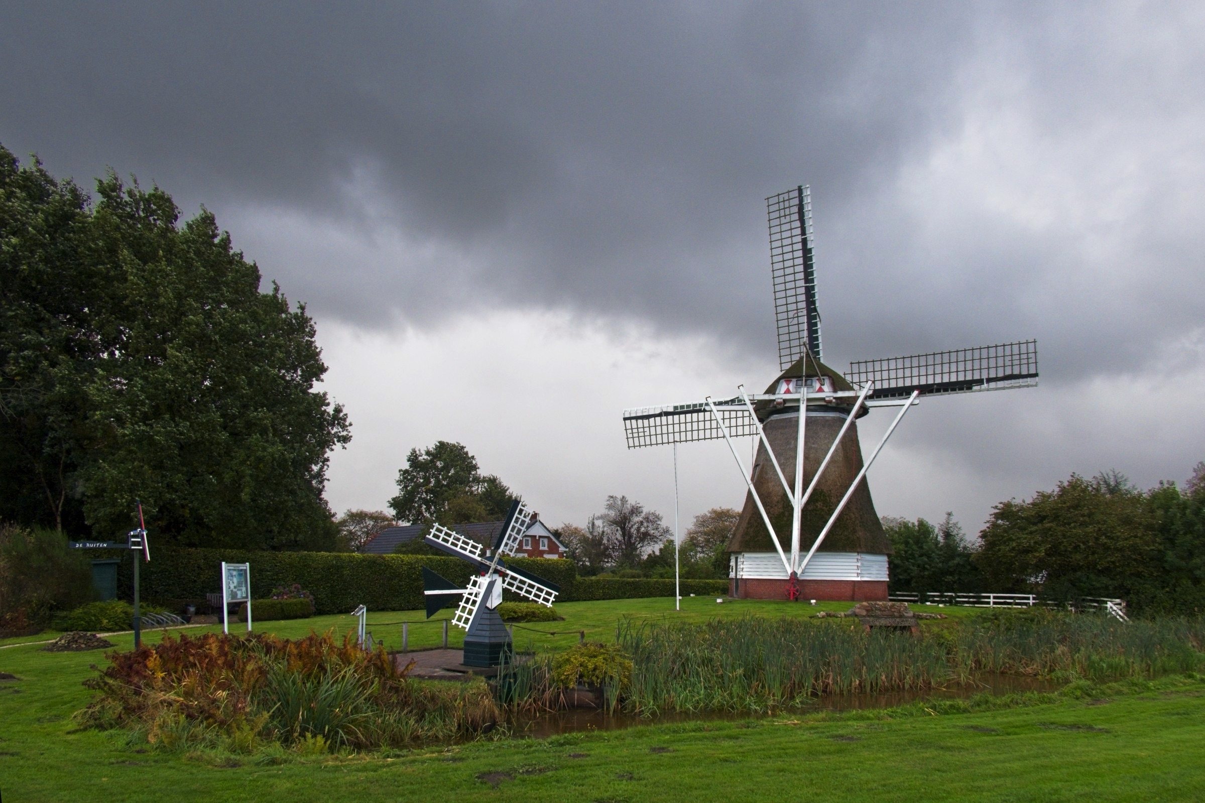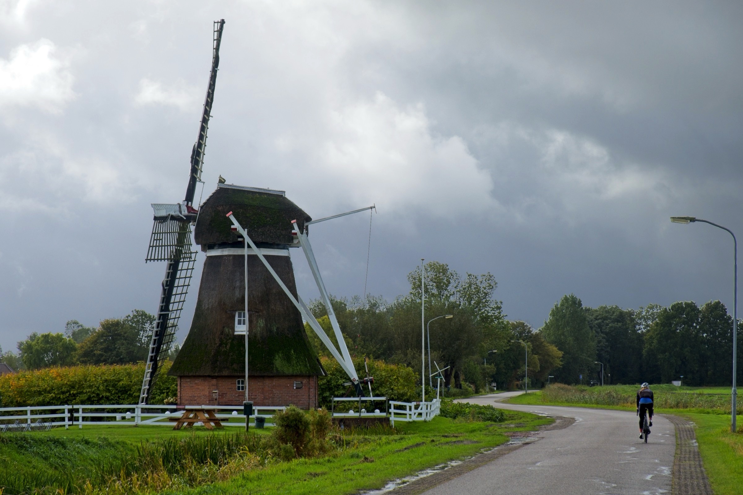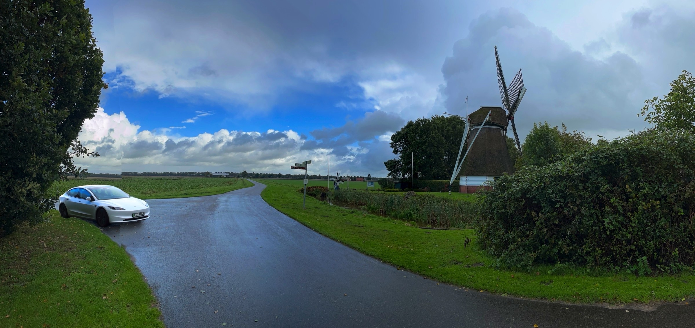Gosh, what can I say. Talk about lucky with the weather. If today’s weather had been anywhere important to the trip it would have been a wash out. I think we are getting a taste of Amy! It started very, very wet from Bremen to the Dutch border and from there two things changed. We got occasional sunny periods and the wind built and built until I nearly got blown over in Noordwyk. It was just under 300 miles and with all day and a bit of evening it did allow a couple of diversions for a little sight seeing. The route was taking me by Groningen and after a check to see if it was worth a visit the answer was not really but lo and behold there are adjacent historic Poldenmolen. They are wind pumps used to manage water level on the polders. Windmills to you and I. There were three within a couple of kilometres and I even saw the first one briefly in sunshine. The other diversion was to Noordwyk where I have spent a few evenings at the Het Hot Van Holland, a restaurant with rooms while visiting ESTEC the European Space Agency Technical centre including once to present a paper at an international conference. Visiting there was strange as nothing seemed familiar. Memory fades and it was 25 years ago! On the road I had a couple of musical moments. Not far out of Bremen the road conditions were atrocious which did not seem to deter the drivers of large, mainly German cars from flying along the Autobahn. Bruce Springsteen’s “wreck on the highway” was playing on my music when one of the speedsters nearly replicated the song. A car some way ahead indicated and pulled out to overtake a truck. The speedster flew by me and did not seem to slow down. Suddenly the anchors were on as he closed to what from my range seemed a couple of metres from the back of the overtaking car. As I reached and overtook the truck the BMW was long gone back up to speed. The other moment was a little surreal. One of my favourite all time songs is Cyndi Lauper’s “Sally’s Pigeons”. I don’t really completely get the story but it always makes me melancholy and think back on my childhood. This morning it brought a long buried memory to life. We lived in Elgin Place in Edinburgh and the flat looked over a railway line. My dad had a large chest with a domed top by a window and I remembered sitting on it with Marion Brown who was in my class at primary school watching the trains. The brain is a strange organ for sure and music certainly has the ability to move us. Anyway enough of this lets get on to the photos. The headline and a few below are of the Poldenmolen near Groningen and where they pump the water to. There is nothing usable from the stretch of road to the “Poort of Groningen” where I stopped for a coffee. There are a few on the road below and a photo that demonstrates I was definitely in Holland. I’ll finish with one of the churches and the Het Hof Van Holland in Noordwyk.