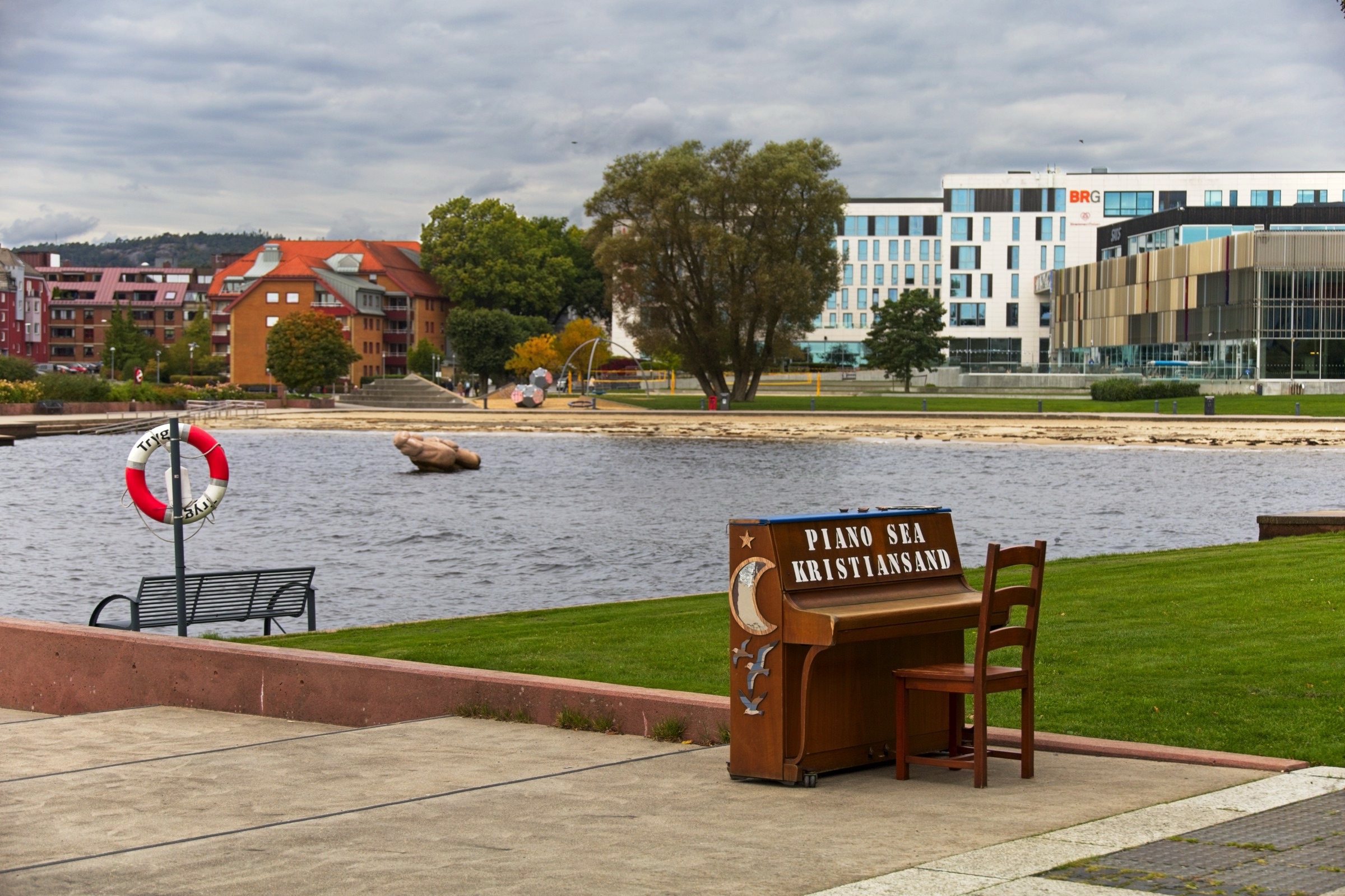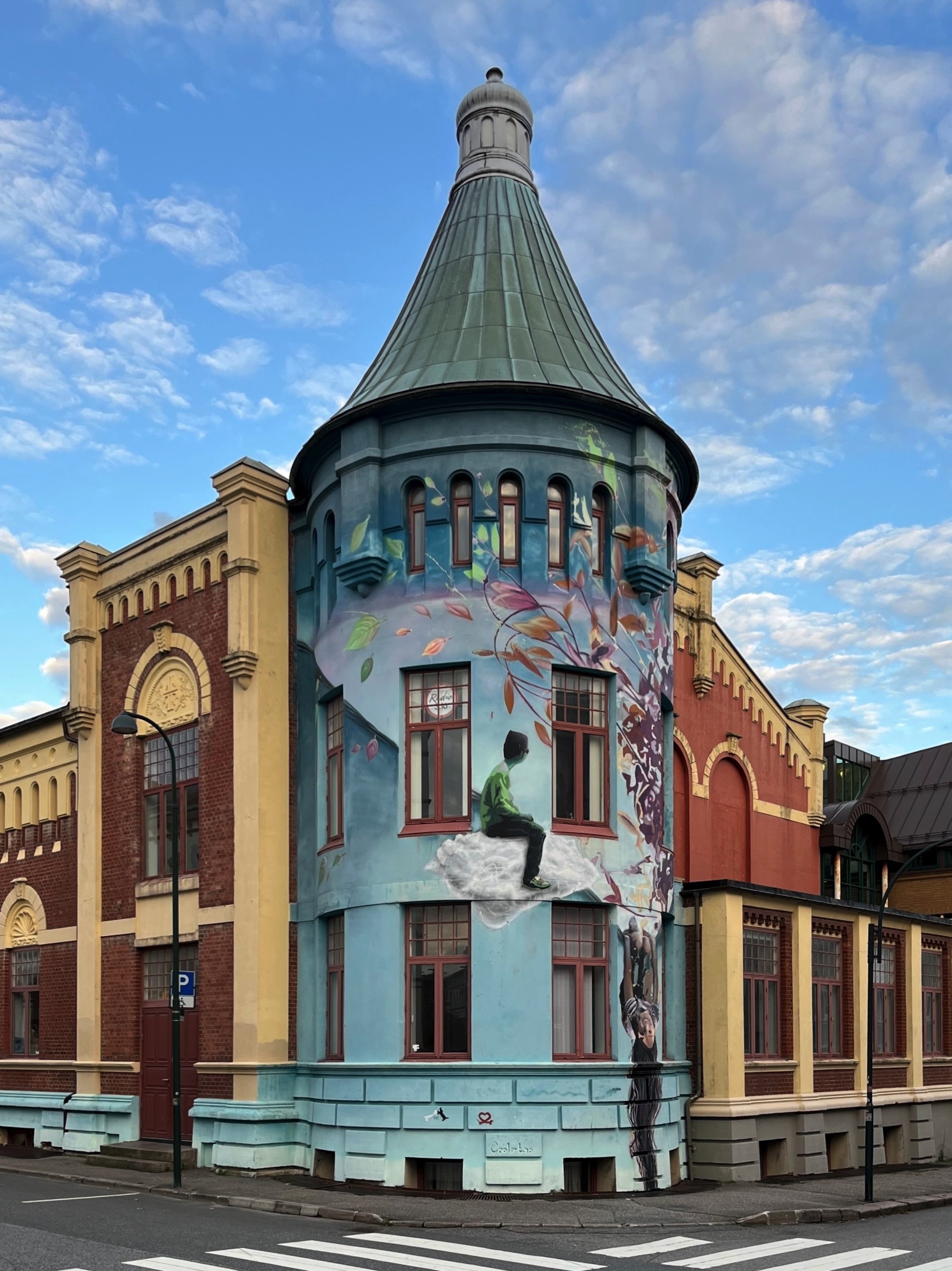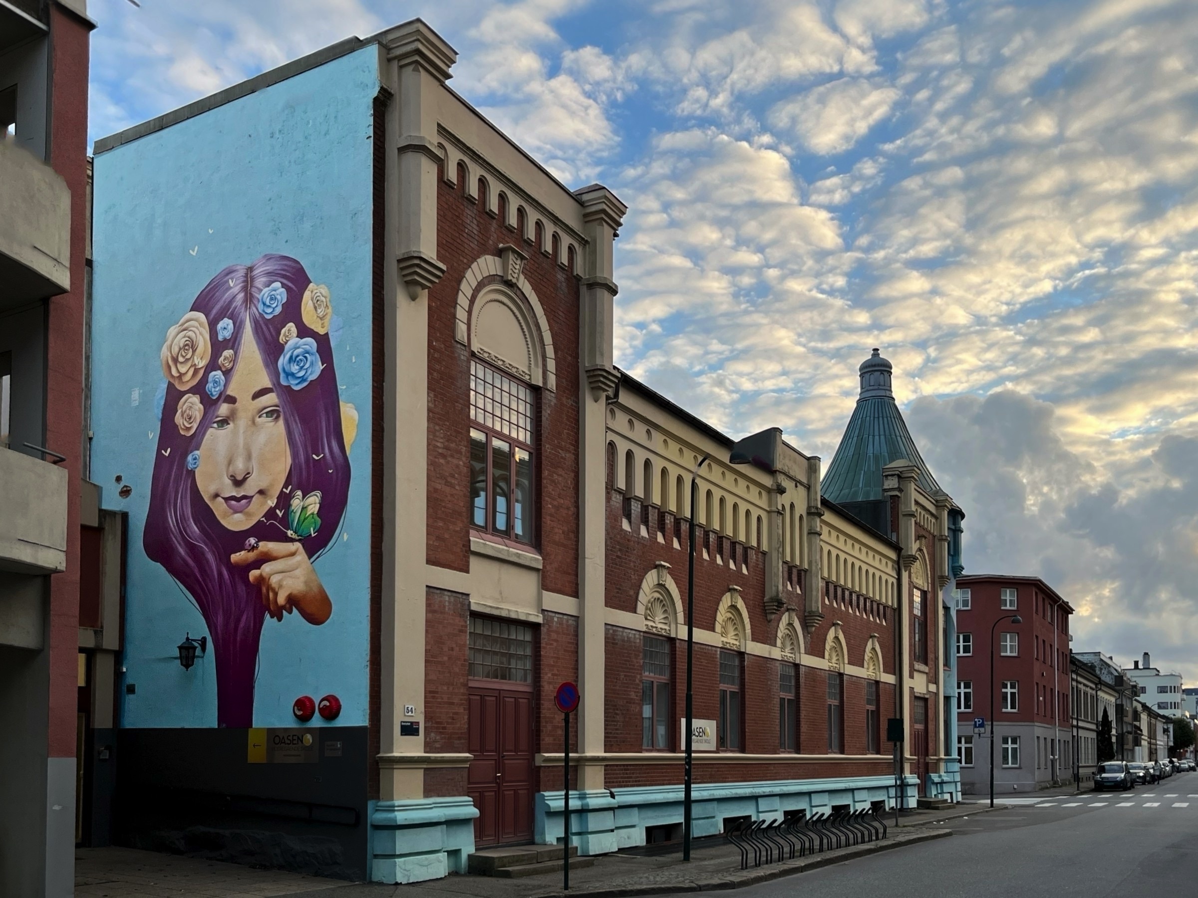 Kristiansand has a compact city centre based on a grid of streets, including those with old buildings. It is contained by water on three sides and a hill to the north. You could easily cover the key places in a morning but I was in no hurry. The hotel is by the ocean side and its name, Bystranda, refers to a beach close by. The receptionist kindly gave me simple map with suggested walking route which I largely followed. This will be my last night in Norway, for this trip, and then a couple of ferries, first to Denmark and then to Harwich overnight on Saturday and a couple of long driving days in between will see me home. Norway has exceeded my expectations which indicates how little I knew of the country, which becomes obvious when there are statues of famous people everywhere and the only one I knew was Edward Elgar (spelled differently on his statue). I know a little more now, just a little. The weather has really been very kind with only a couple of very wet days which were manageable. So here are some snaps from my final full day from wandering around this pleasant city. A highlight is definitely the fish market and surrounding buildings with at least two housing architects practices and I’ll start there with the headline and a few more. I am confident the fish lady is not Dolly Dimples which is maybe the name of a restaurant. In the small market itself there were several tanks of live lobsters and some actual shoppers. Along the waterfront from the hotel there are small boat harbours, the fortress, some street art and an impressive fountain complex as you head to the fish market. There was a chance meeting with a giant bug and it had its eyes on me. In the same area there was a boat inspired bridge over to one of the city’s museums. I met a space-suited gorilla along Markens Gate, the pedestrianised main shopping street. Another car free street leads to the heart of the city, the Cathedral and nearby town hall. The cathedral has the coolest organ and, although not austere, foregoes the gold ornamentation of the cathedrals in Southern Europe. As I left the Cathedral I saw a crowd at the end of the square and curiosity took over. I am glad it did because, as I walked over, a brass band struck up a tune. They were great and pleased the small but supportive crowd. I have added an edited video of one of their tunes as best as I could to under 3 minutes. You can watch it here but at least have a listen to a few bars. They are good. After the joy of a brass band I headed down to the river side past many classic Norwegian houses. I was admiring what I expect are expensive apartments on the other side of the river when suddenly the peace was shattered by a KLM (I think) Airbus on approach to the airport. These apartments are right under the flight path so I hope there are no late night arrivals and departures. As you move down to the ocean side the buildings get more traditional and on my side this ends in a park with views out and with facilities for a little recreation. The ferry is the very boat that I will be taking tomorrow afternoon at 14:30 after it’s next round trip to Hirtshals in Denmark. It was then a short walk back to the hotel. On my walk to Markens Gate for dinner I took a different route from last night and found some excellent wall painting, a nice way to finish for today.
