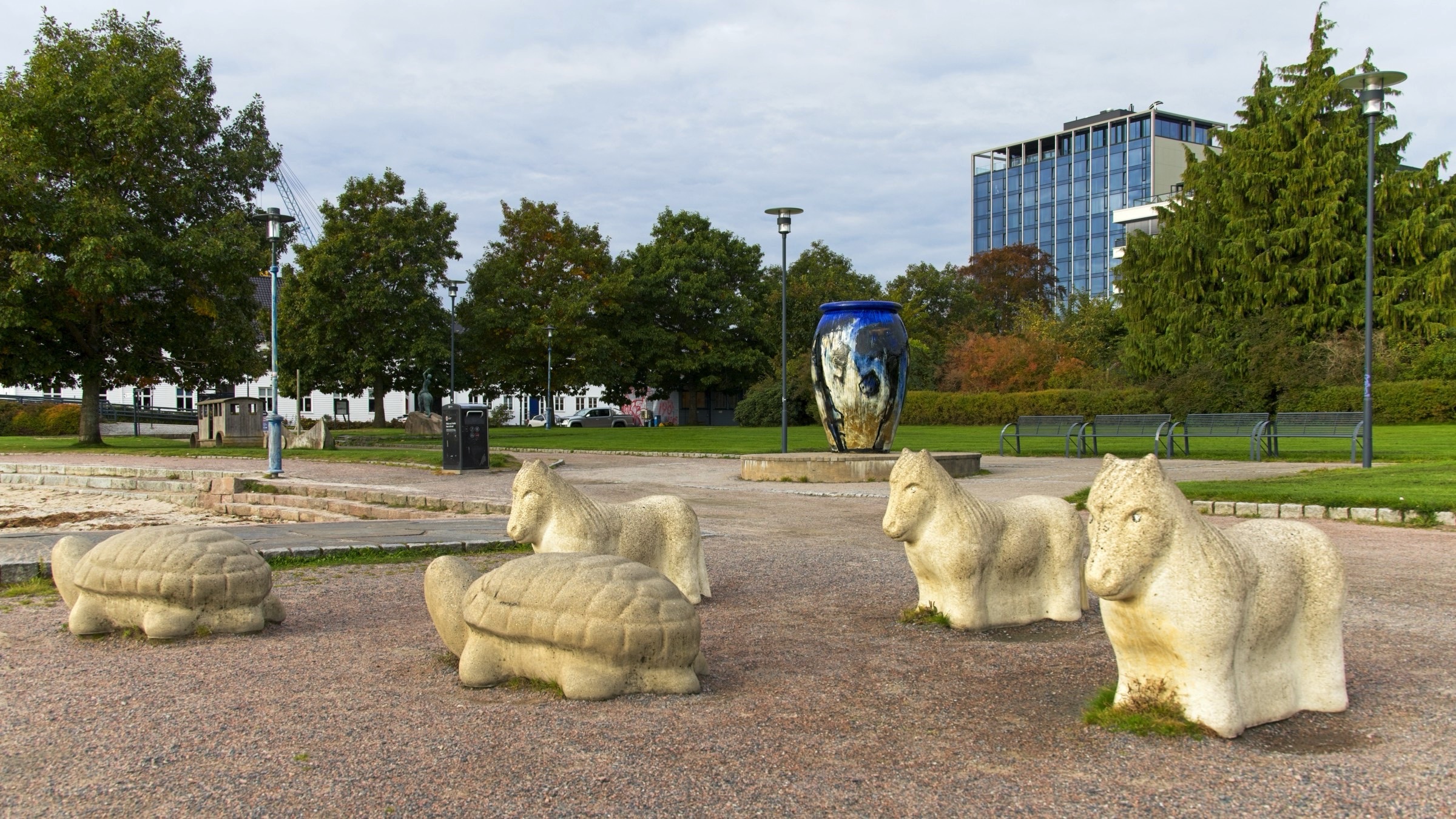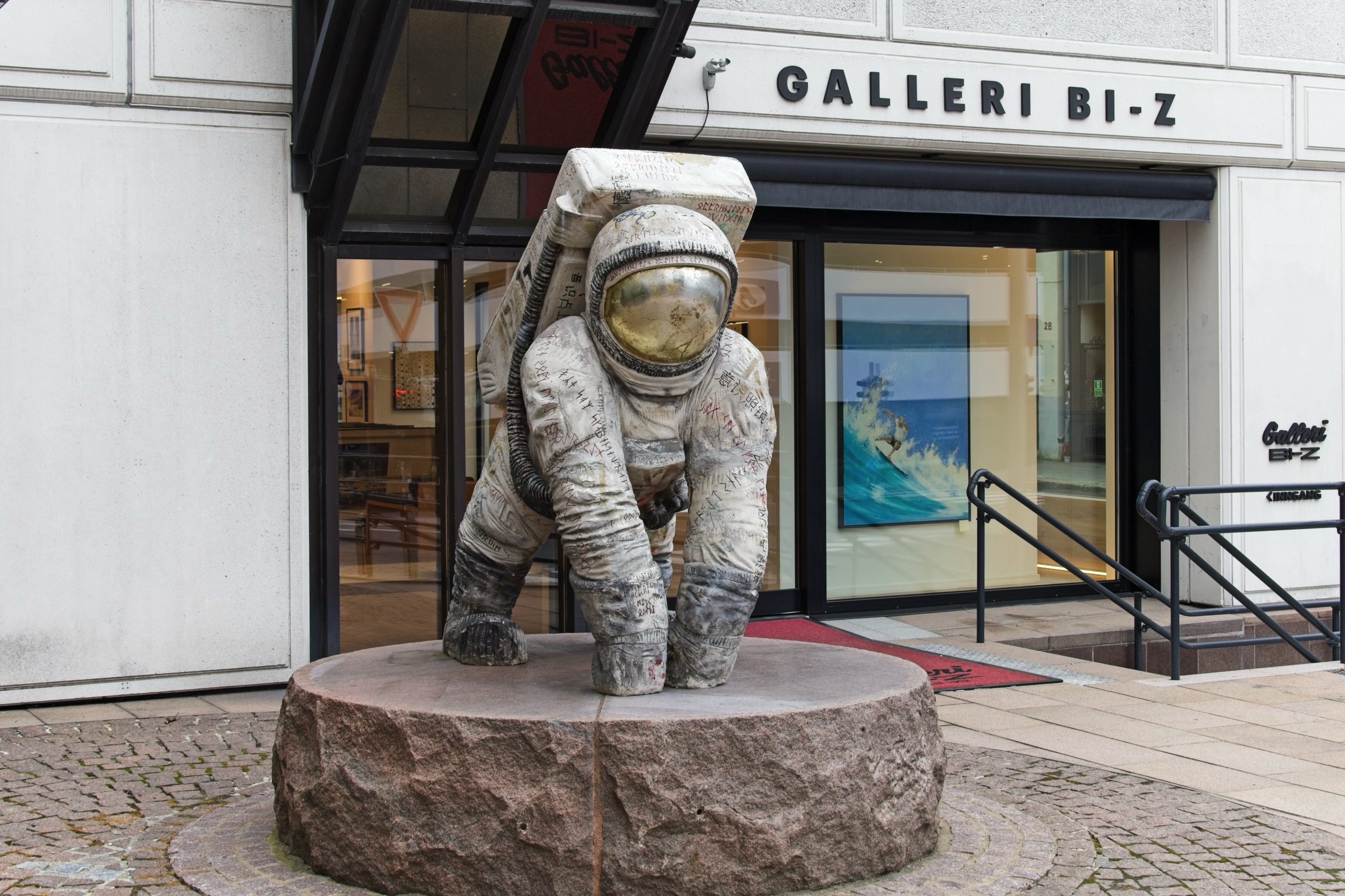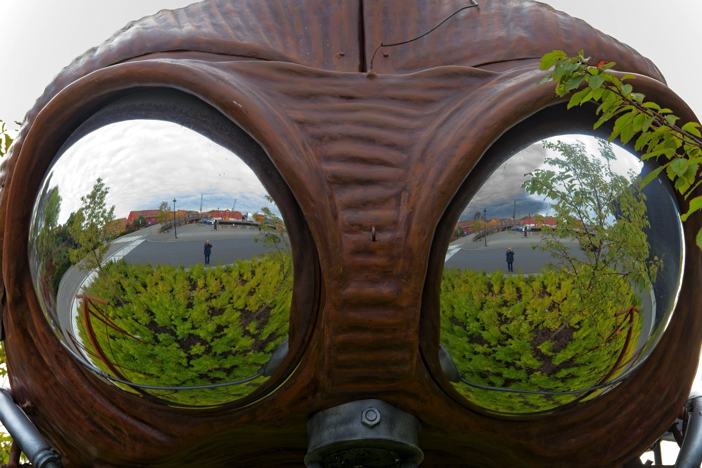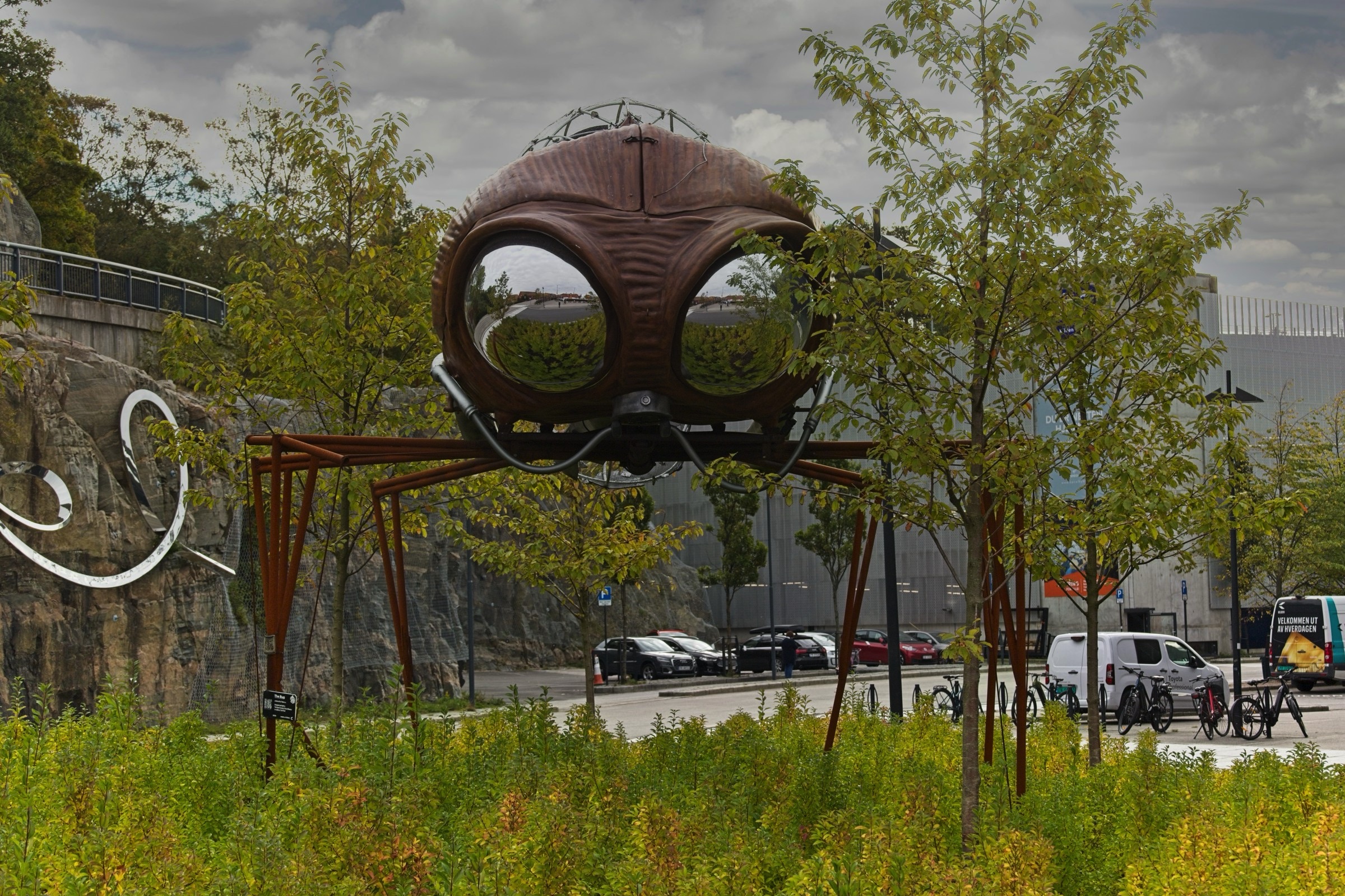 Kristiansand has a compact city centre based on a grid of streets, including those with old buildings. It is contained by water on three sides and a hill to the north. You could easily cover the key places in a morning but I was in no hurry. The hotel is by the ocean side and its name, Bystranda, refers to a beach close by. The receptionist kindly gave me simple map with suggested walking route which I largely followed. This will be my last night in Norway, for this trip, and then a couple of ferries, first to Denmark and then to Harwich overnight on Saturday and a couple of long driving days in between will see me home. Norway has exceeded my expectations which indicates how little I knew of the country, which becomes obvious when there are statues of famous people everywhere and the only one I knew was Edward Elgar (spelled differently on his statue). I know a little more now, just a little. The weather has really been very kind with only a couple of very wet days which were manageable. So here are some snaps from my final full day from wandering around this pleasant city. A highlight is definitely the fish market and surrounding buildings with at least two housing architects practices and I’ll start there with the headline and a few more. I am confident the fish lady is not Dolly Dimples which is maybe the name of a restaurant. In the small market itself there were several tanks of live lobsters and some actual shoppers. Along the waterfront from the hotel there are small boat harbours, the fortress, some street art and an impressive fountain complex as you head to the fish market. There was a chance meeting with a giant bug and it had its eyes on me. In the same area there was a boat inspired bridge over to one of the city’s museums. I met a space-suited gorilla along Markens Gate, the pedestrianised main shopping street. Another car free street leads to the heart of the city, the Cathedral and nearby town hall. The cathedral has the coolest organ and, although not austere, foregoes the gold ornamentation of the cathedrals in Southern Europe. As I left the Cathedral I saw a crowd at the end of the square and curiosity took over. I am glad it did because, as I walked over, a brass band struck up a tune. They were great and pleased the small but supportive crowd. I have added an edited video of one of their tunes as best as I could to under 3 minutes. You can watch it here but at least have a listen to a few bars. They are good. After the joy of a brass band I headed down to the river side past many classic Norwegian houses. I was admiring what I expect are expensive apartments on the other side of the river when suddenly the peace was shattered by a KLM (I think) Airbus on approach to the airport. These apartments are right under the flight path so I hope there are no late night arrivals and departures. As you move down to the ocean side the buildings get more traditional and on my side this ends in a park with views out and with facilities for a little recreation. The ferry is the very boat that I will be taking tomorrow afternoon at 14:30 after it’s next round trip to Hirtshals in Denmark. It was then a short walk back to the hotel. On my walk to Markens Gate for dinner I took a different route from last night and found some excellent wall painting, a nice way to finish for today.