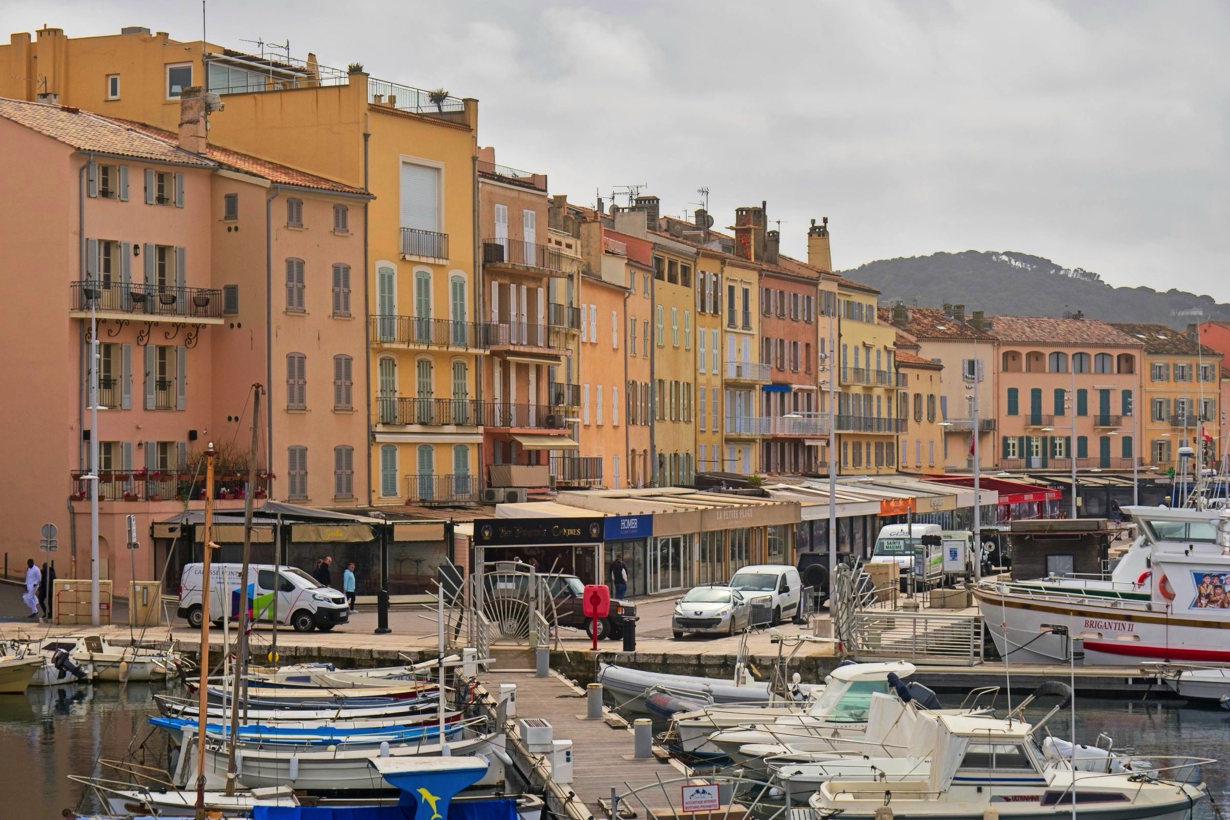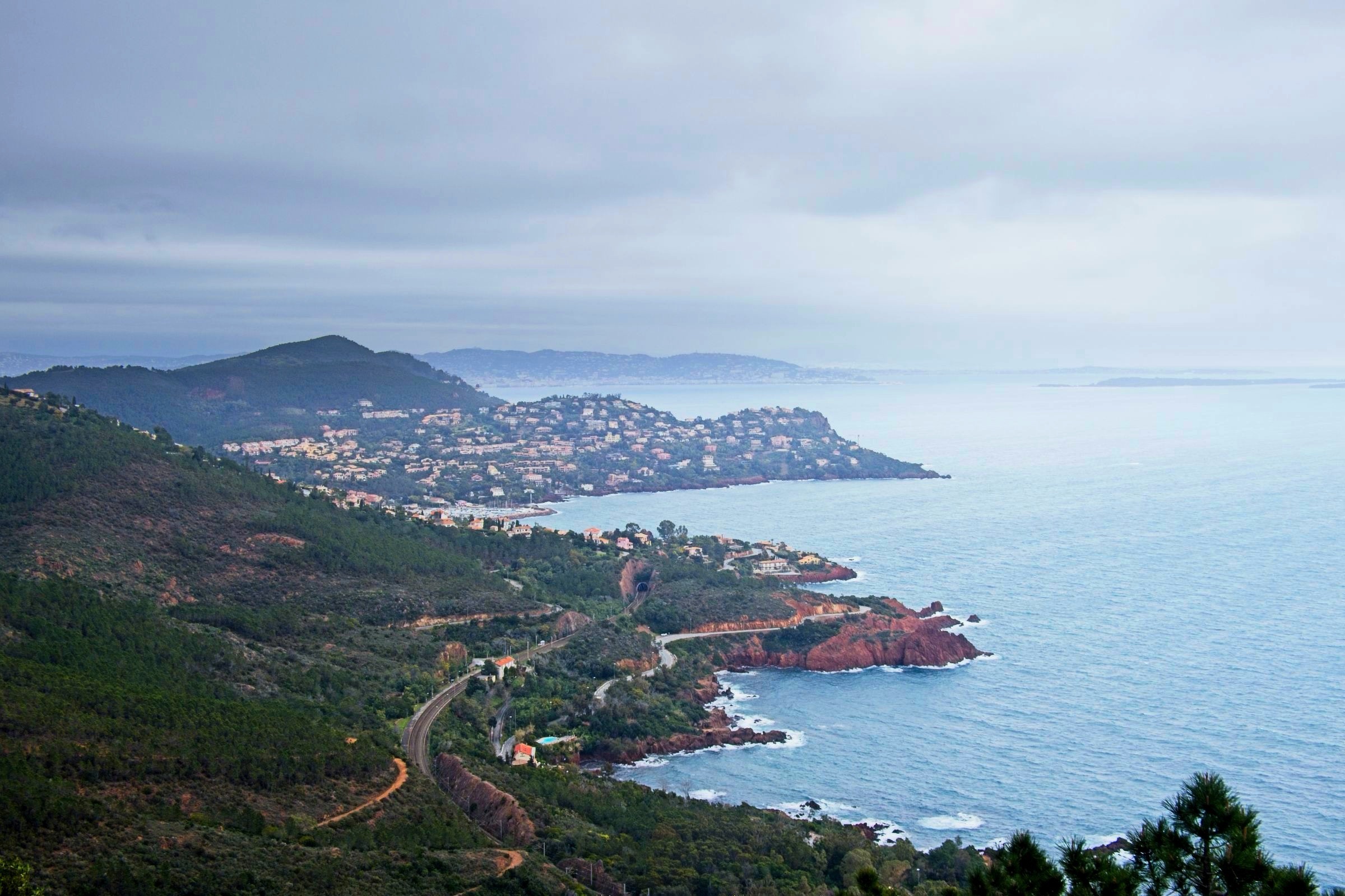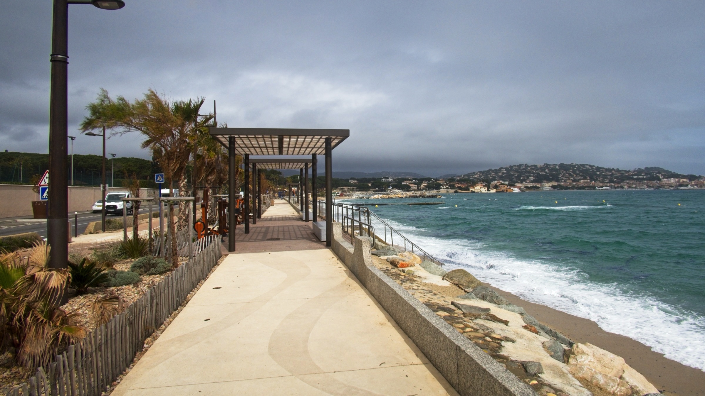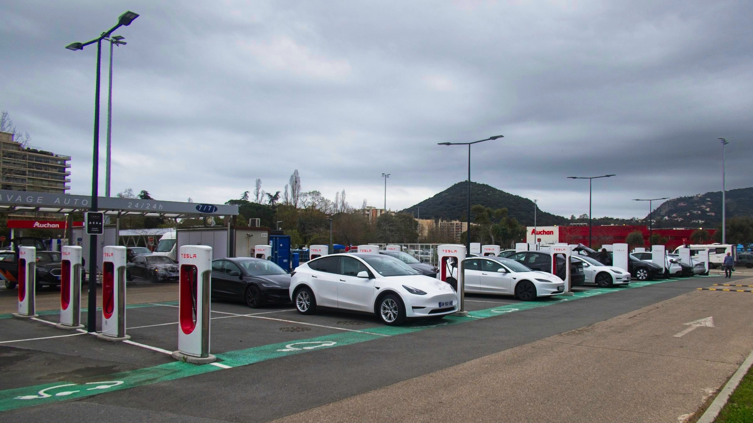 I am pleased to say the Mistral had lost some of its sting this morning and despite forecast of rain it stayed dry until I got damp walking back from dinner to my Hotel in the old Port in Nice. I was retracing some steps from 1971 with stops in Cavalaire-sur-Mer and Saint-Tropez. It has been a long wait to return and they have changed a bit. My first beer by the Med was sipped in September 1971 with three school friends, Eric, Kenny and Ronnie, and little did I know that it would set a pattern for leisure travel by car that holds to this day. Cavalaire was unfamiliar with lots of modern buldings and a splendid promenade, none of which I remember. I do remember a cold beer and a cooling breeze of the sea. The beach was undergoing maintenance. The port in Saint-Tropez on the other hand looks as I remember it although the yachts are bigger and there are more of them. A difference was a large car park attesting to the popularity of this one-time home of the likes of Brigitte Bardot. Along the coast I stopped in a little sunshine at Saint-Maxime before a climb into the Esteril Corniche for a touted view along the coast via Cannes to Nice. A rough forest trail climbs up through the red Esteril mountains but a little too much haze meant that Nice was just a light smudge on the horizon. Another stop along the coast produced some nice views of the red Esteril before topping up the car at a Tesla Supercharger in a retail park on the edge of Cannes. They know how to do it. I have seen a site like this before allowing 24 stalls in a compact area. Tricky if you don’t drive a Tesla through depending on where the charge port is. It was getting on a bit so I decided to take the peage to Nice saving over a half hour. The toll charge has not come through yet so no idea what the cost was. I am glad I did as I got snarled up close to the hotel when the traffic was being diverted to avoid a street protest. Lots of vehicles into a small detour is not a recipe for fast travel. The car provides detailed tracking and the last 2 km took 19 minutes. Not a real issue but one of the challenges in any major city on a weekend. The headline is a panorama of the port in Saint-Tropez. Below I’ll start in Cavalaire-sur-Mer before moving on to Saint-Tropez, Saint-Maxime and the Esteril crimson mountains, a Tesla Supercharger plaza and evening by the old port in Nice to round of a very pleasant drive down memory lane.