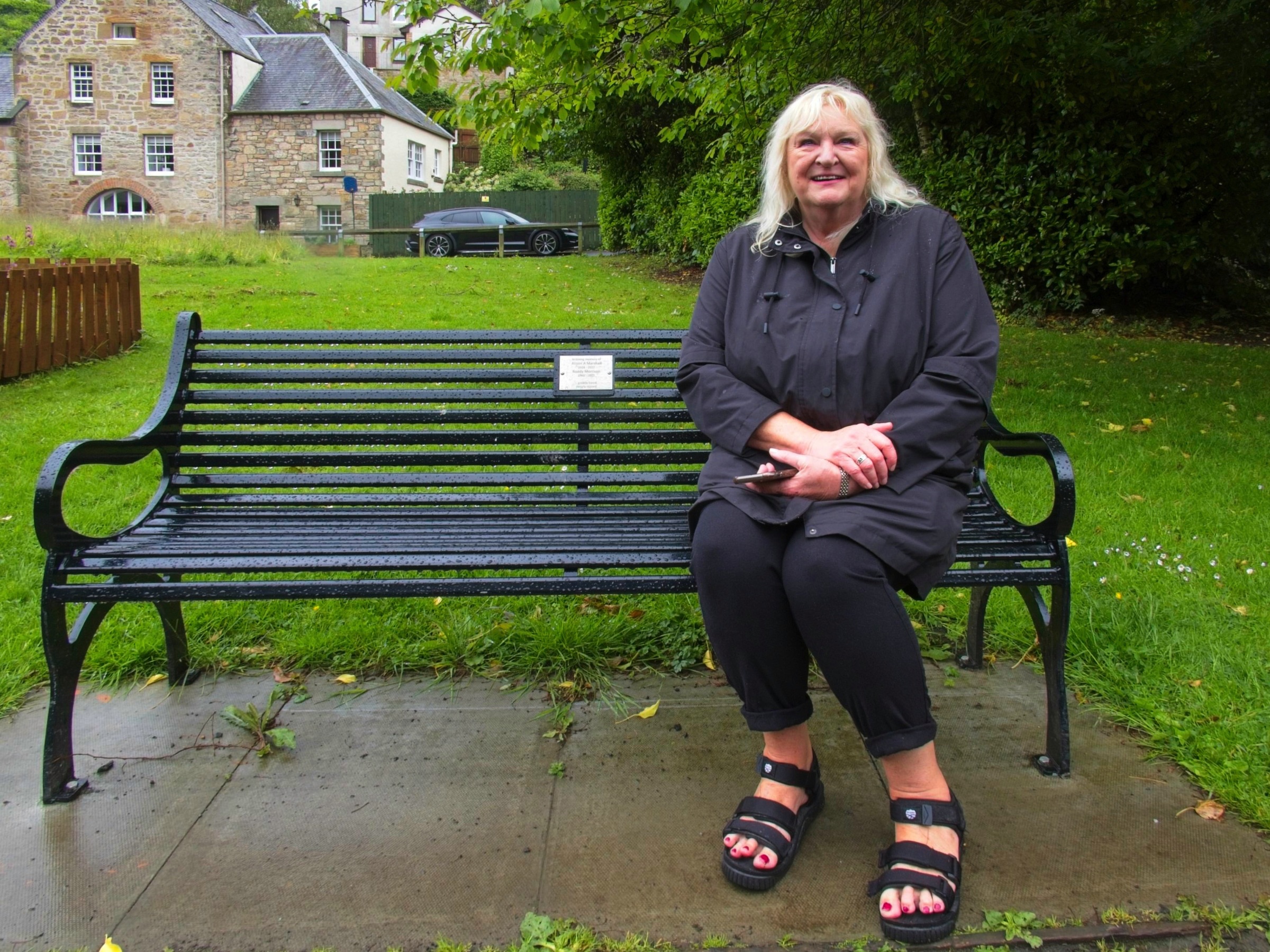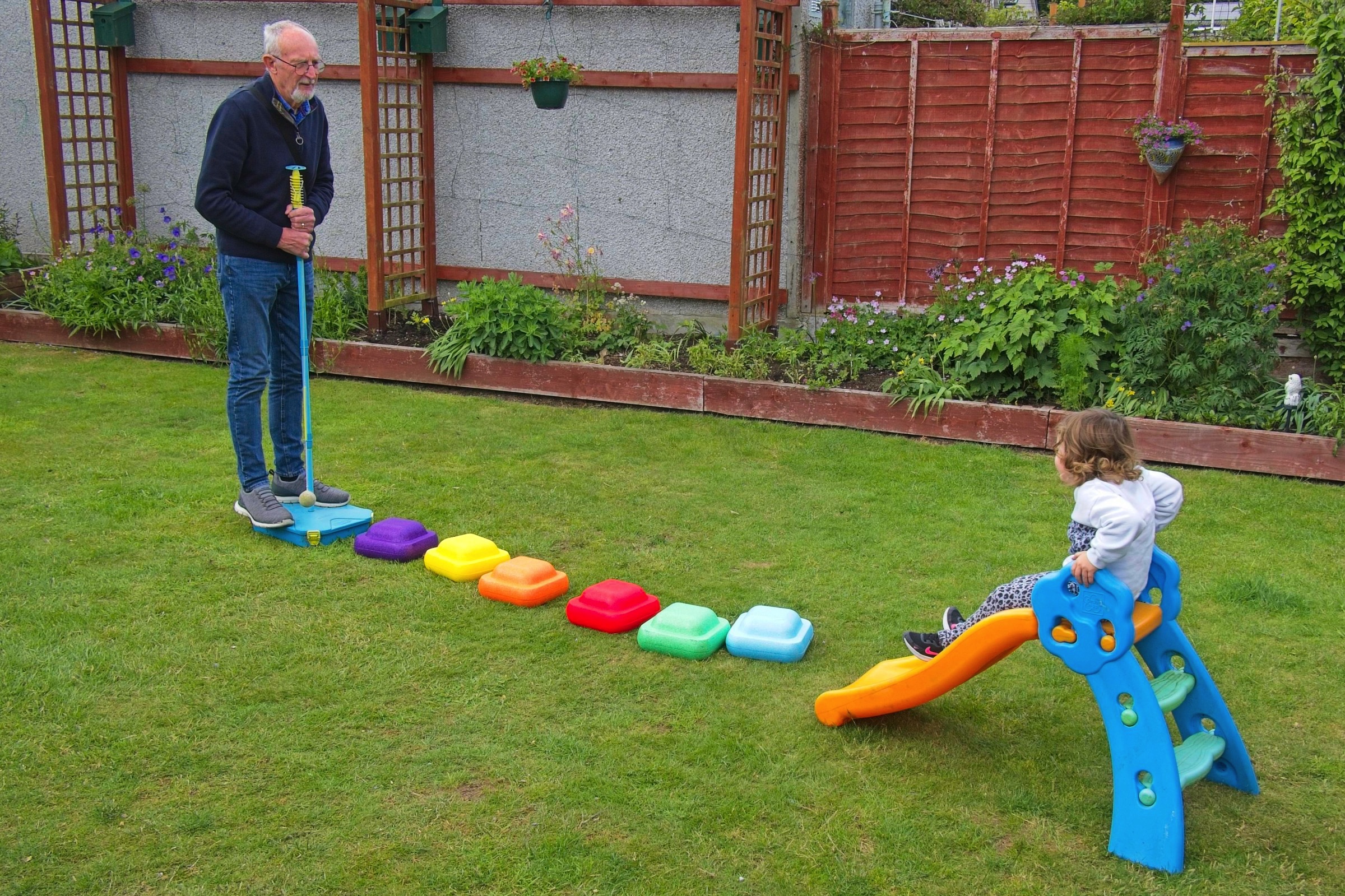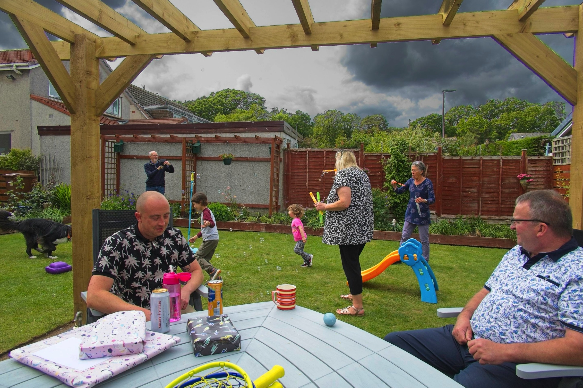Here are a few pictures from a lovely weekend in Scotland with family celebrating a couple of birthdays, Rosie at three and Douglas at a little older. The new patio got some action. Very nice. It is always lovely to spend time with family and, of course, the sun shone. We took Sam the border collie for a walk in the park on Anne and Douglas’s doorstep which has nice views of the hills to the south. Mind you it is not always sunny. Anne and I went to Cramond for a walk and a chance to see a bench arranged by our cousin Mary for our Aunt Alison and her brother Roddy. An emergency stop for coffee avoided the heaviest of the rain. The ducks and heron were not worried.