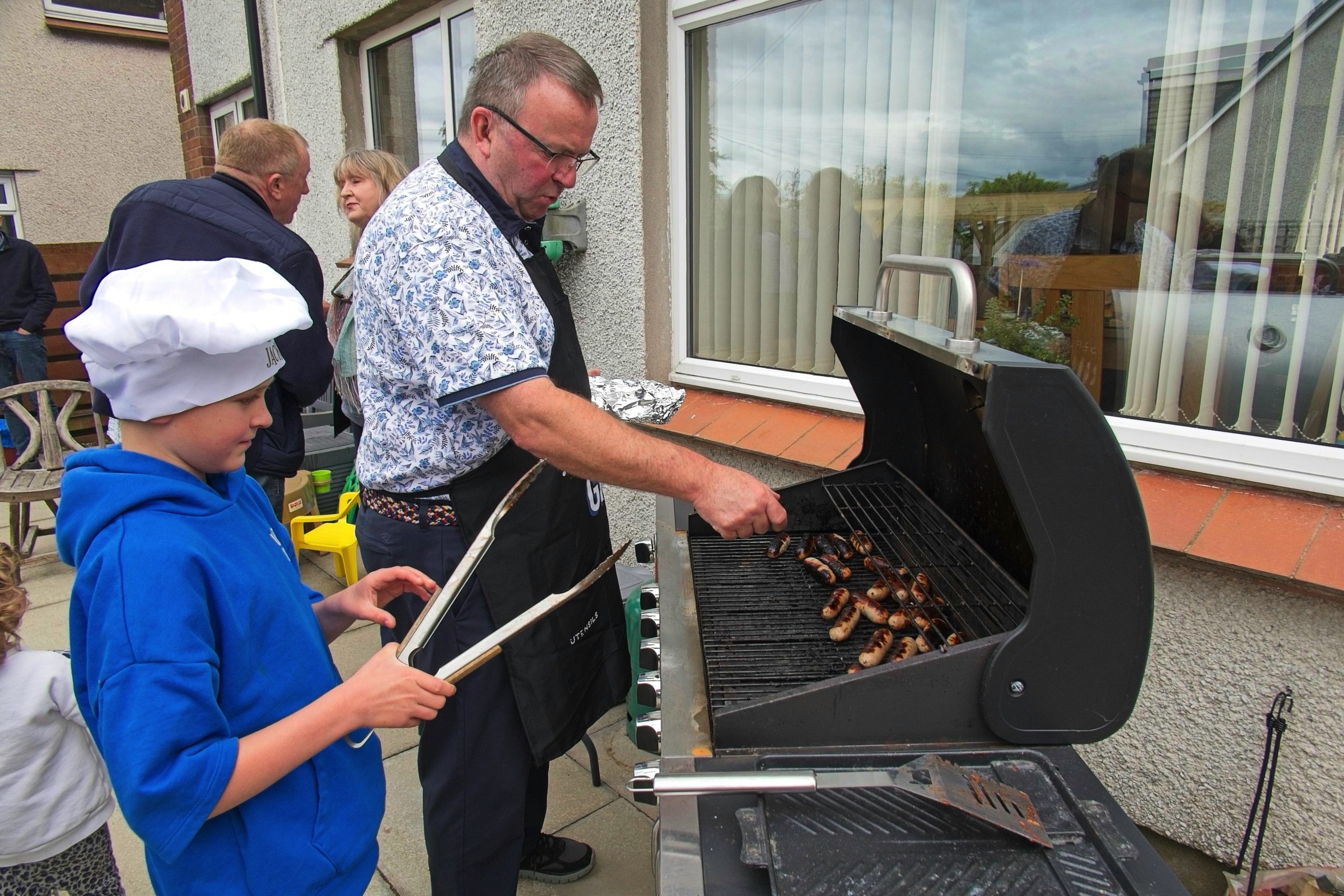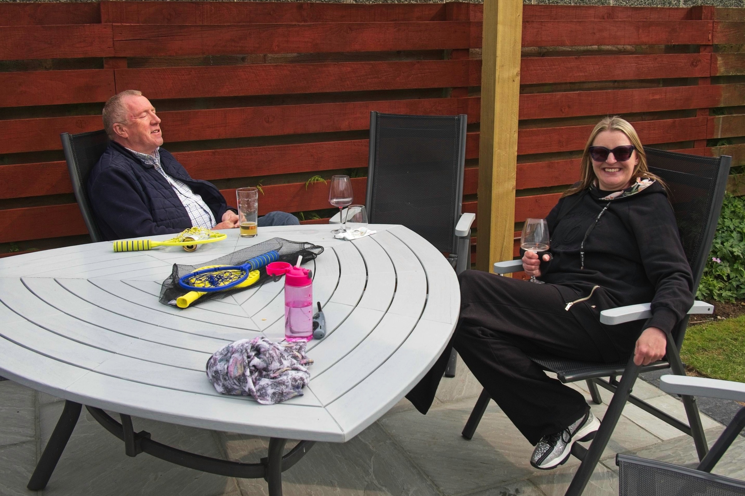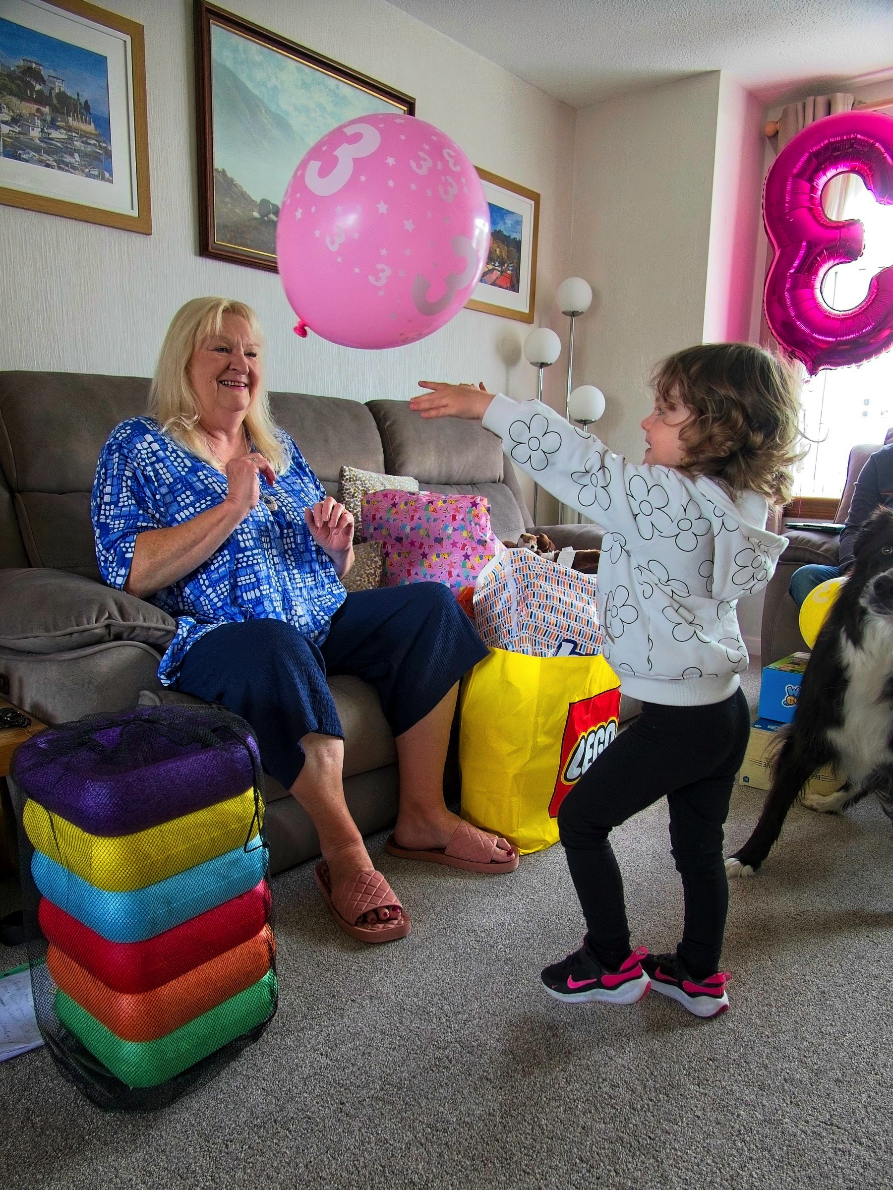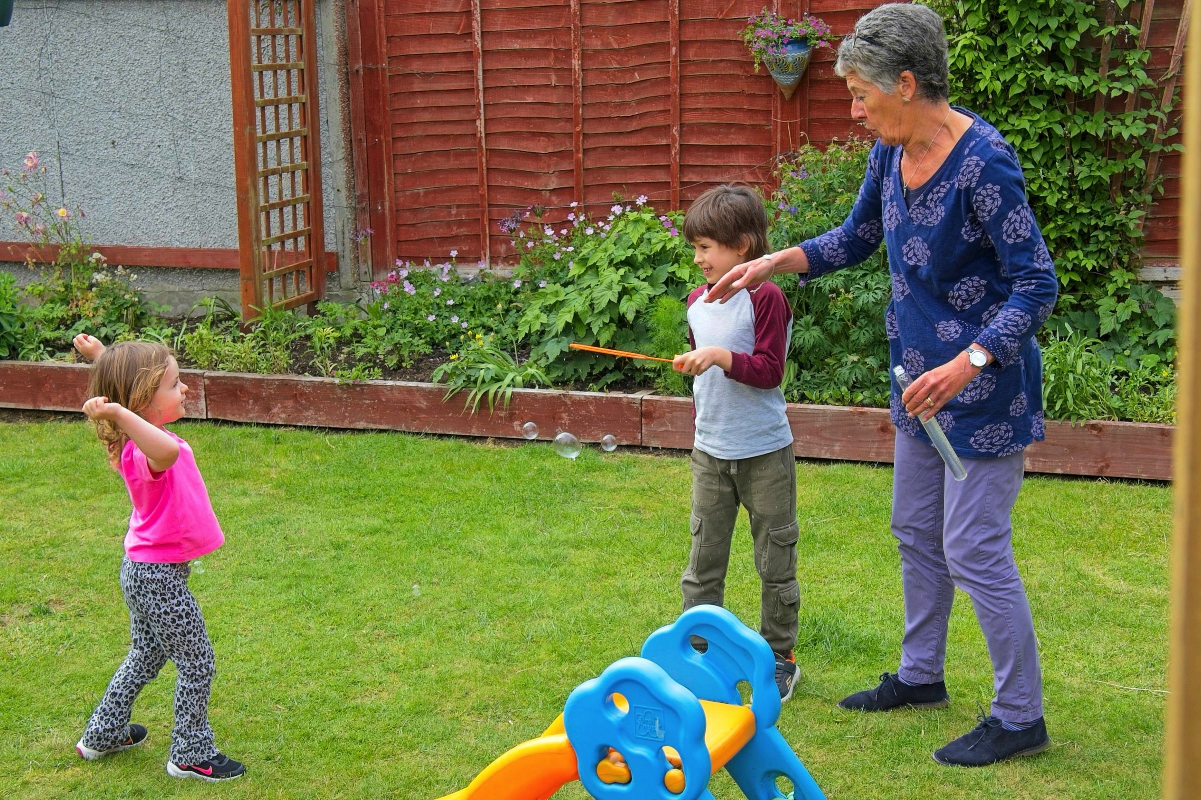 Here are a few pictures from a lovely weekend in Scotland with family celebrating a couple of birthdays, Rosie at three and Douglas at a little older. The new patio got some action. Very nice. It is always lovely to spend time with family and, of course, the sun shone. We took Sam the border collie for a walk in the park on Anne and Douglas’s doorstep which has nice views of the hills to the south. Mind you it is not always sunny. Anne and I went to Cramond for a walk and a chance to see a bench arranged by our cousin Mary for our Aunt Alison and her brother Roddy. An emergency stop for coffee avoided the heaviest of the rain. The ducks and heron were not worried.