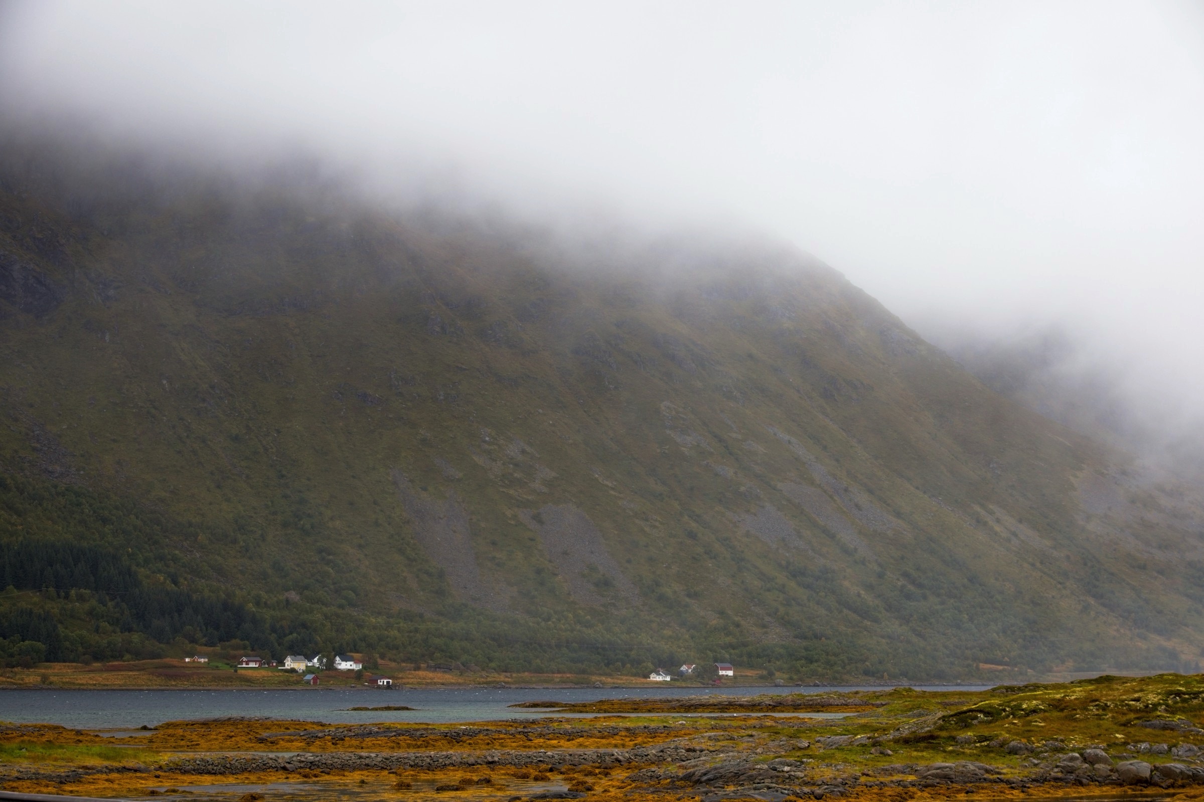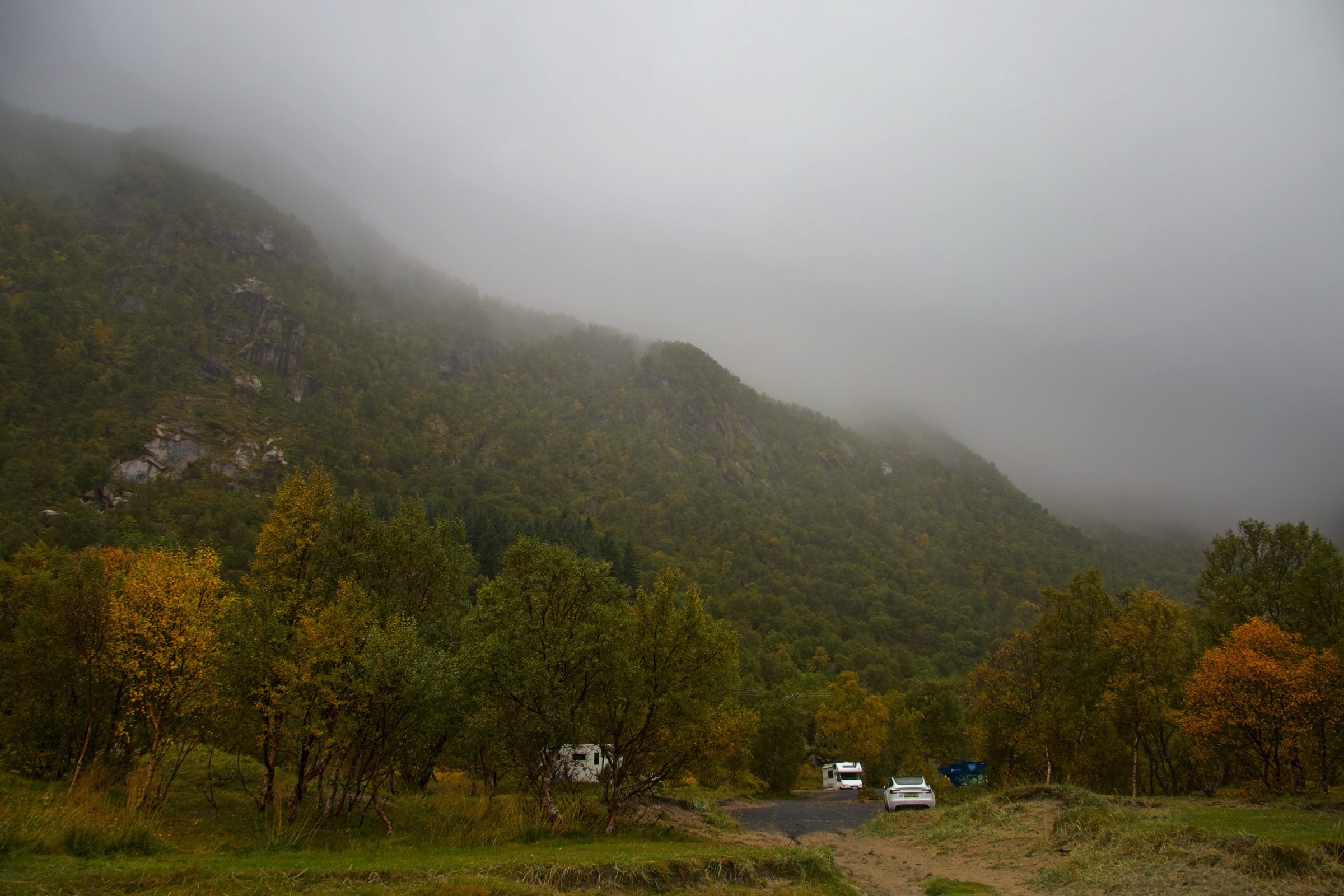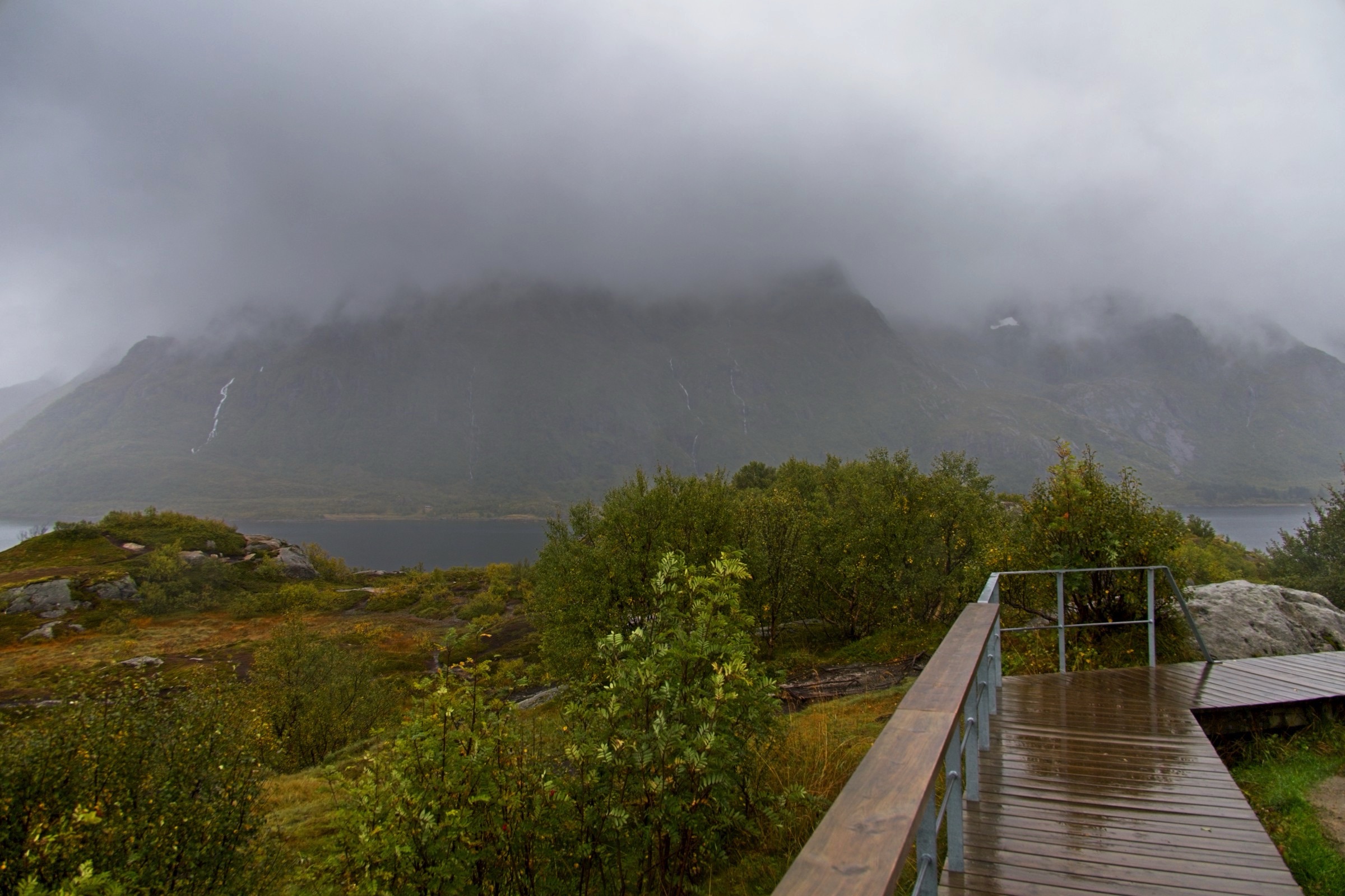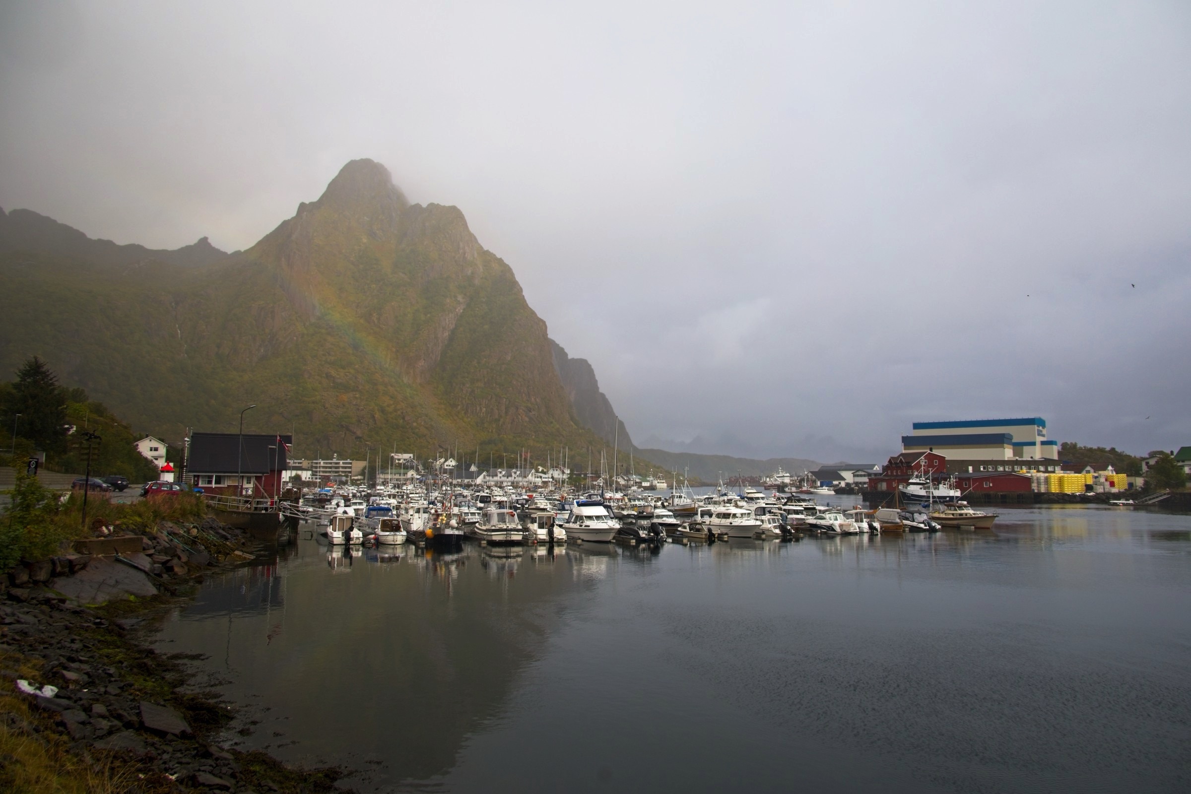 I hear myself say that I will not complain about the weather and as a general rule I do not. Then it comes to visiting Lofoten which, I'm told, has some of the most spectacular scenery, not just in Norway but in the world. To enjoy scenery you actually need to see it. There were still vestiges of low cloud hanging around Narvik is I headed, essentially, west with a lot of wiggles around fjords. The picture looking back at Narvik, above, sums up the morning conditions. There were even spells when the sun broke through, short but promising. As I approached Lofoten the wind picked up and the rain started, not a little shower mind you and effectively the scenery was obscured. I am not going to complain about the weather but let’s say it put a dampener on this afternoon’s sight seeing. Did I mention it is also cold not including the sizeable wind chill. As I write this the wind can be heard buffeting the hotel from time to time. I really am out on the North Atlantic coast so what should I expect. Fingers crossed for tomorrow and I have plenty of warm clothes. So ride along with me on a less than perfect drive. There was an amazing amount of commercial traffic and, for a stretch, road works with either traffic lights or convoy system every 5 kilometres. So stop start, dodge the trucks was the order of the day. The first eight images were before I crossed the bridge to Lofoten and I was happy with. I have posted some pictures from Lofoten but do not be fooled these are the handful where there was actually something to see, even a rainbow when I was having a walk while the car charged at Svolvaer. I’ll finish with a view from my hotel room window after an ejoyable dinner. I was so glad that the restaurant was open, a slight surprise, until I noticed a coach arrive to make up numbers.