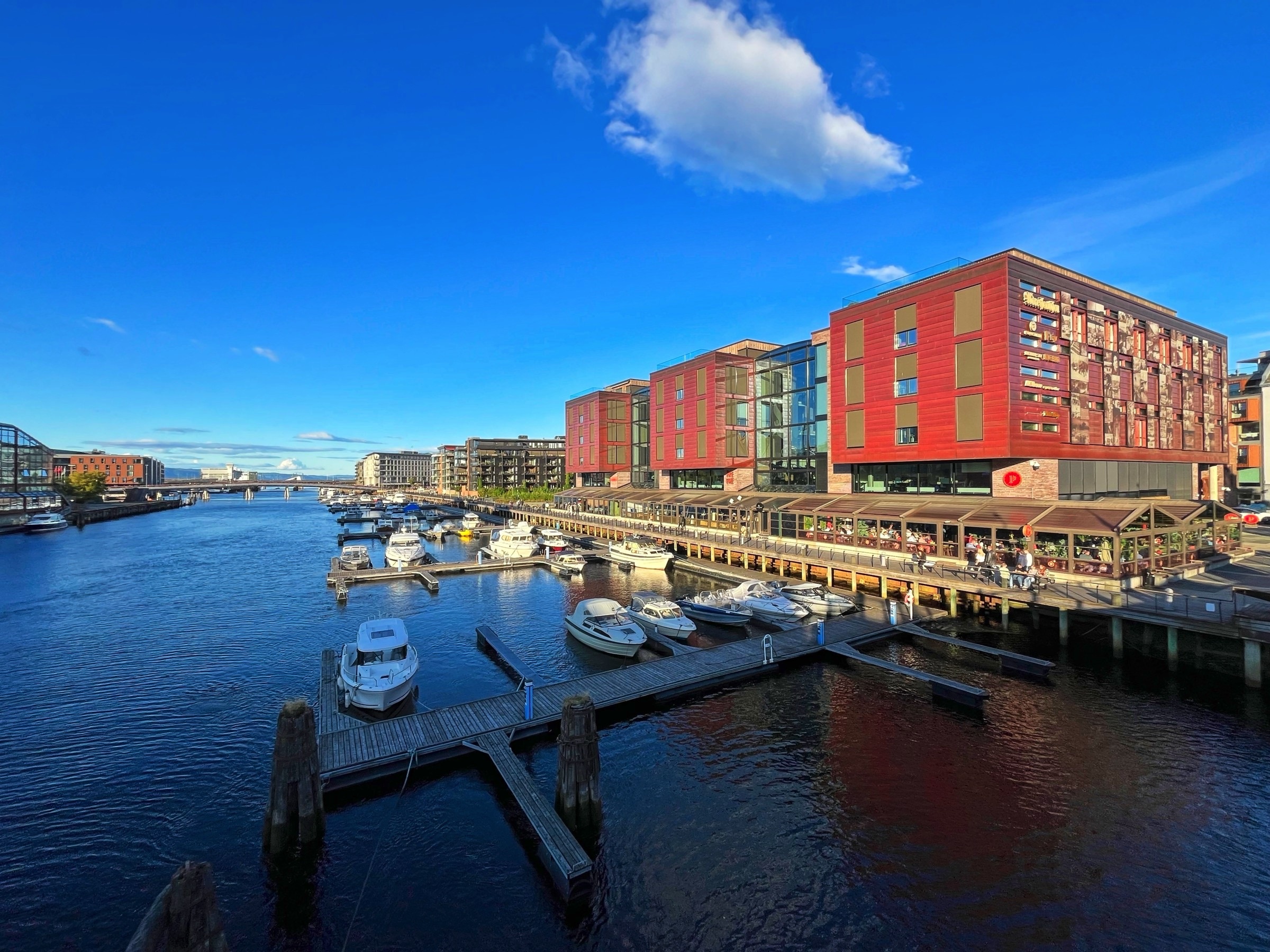 It has been a long day with only one real stop, at Lillehammer, and a few necessary stops to charge the car and grab a snack. Nearly 400 miles on quiet roads is not a problem really but I did expect more motorway than there is. It pretty much dies at Lillehammer wirth still 280 miles to go. That said the quality of the roads is very high and with little traffic it meant I could keep up a steady pace. It was damp when I left Oslo with the GoPro on to capture the city exit and usually a glimpse of some previously unseen parts. Not Oslo though. As soon as I wiggled a few streets down to “The Ring” the road goes underground and a tunnel took me out into the suburbs. Very efficient but with limited sight seeing potential. It was a wet morning and as I drove the couple of hours up to Lillehammer it was a case of wet valley - tunnel - new valley dry - tunnel - new valley wet on a regular basis and when I took the turnoff to follow a scenic road the last 20 km to Lillehammer the sun was shining. My purpose of stopping was to take a look at the winter olympic facilities with a focus on the ski slope, which usually attracts me in such places. After driving up to the olympic park the view back to the town was excellent but also bad news as you can see in the headline picture. The rain was sweeping along the valley so it was a quick dash to the bottom of the ski slope and back to the car as the heavens openned. Lucky timing. I dropped down into the town to charge the car and got a little wet. I could easily have made one less stop for charge as I had not anticipated that the final 80 miles or so was all down hill to Trondheim. I should have realised as the road climbs into the mountains but has to get back to sea level. The car was telling me but I did not believe it. Silly me. One of the clever things about electric vehicles is that, like internal combustion vehicles, they use less “fuel” going down hill but unlike their traditional alternatives they also put fuel back into the tank with regeneration. I ran for about 15 miles with the same remaining battery capacity while driving at 50 miles per hour. I do like my car! I made a brief stop when I saw a lovely church pretty close to Trondheim. By the size of the car park they must have a huge congregation. When I got to Trondheim I just freshened up, changed from travel clothes and took the 5 minute walk to the harbour restaurant district which was humming on what was, by now, a lovely Saturday evening. A spicy Calzone and a non-alcoholic 1664 Blanc was just what I needed to prepare for a little photo editing and blogging. As the headline is from Lillehammer I will add three more pictures from there. A panorama of the ski slope, some intrepid climbers and a very wet largely deserted charging station. The run from Dompass to Oppdal was across some wonderful high moorland which looked great in the afternoon light as you will see in the frame from the GoPro. Mountains, lakes and heathland and this area features on one of Norway’s long distance walks called the Kongesvergen, I think. I mentioned the church and it is next. That gets us to the Port of Trondheim and its popular waterfront. In the first picture my hotel is essentially over my right shoulder on the waterside. Then it is along to the main eating hub and my chosen spot which had the full range of clients from a teenager’s birthday party, a large group covering three generations of clearly family, young families, young couples and old travellers like me. The sort of place I like, unpretentious, popular, good service and good food at, for Norway, a fair price.