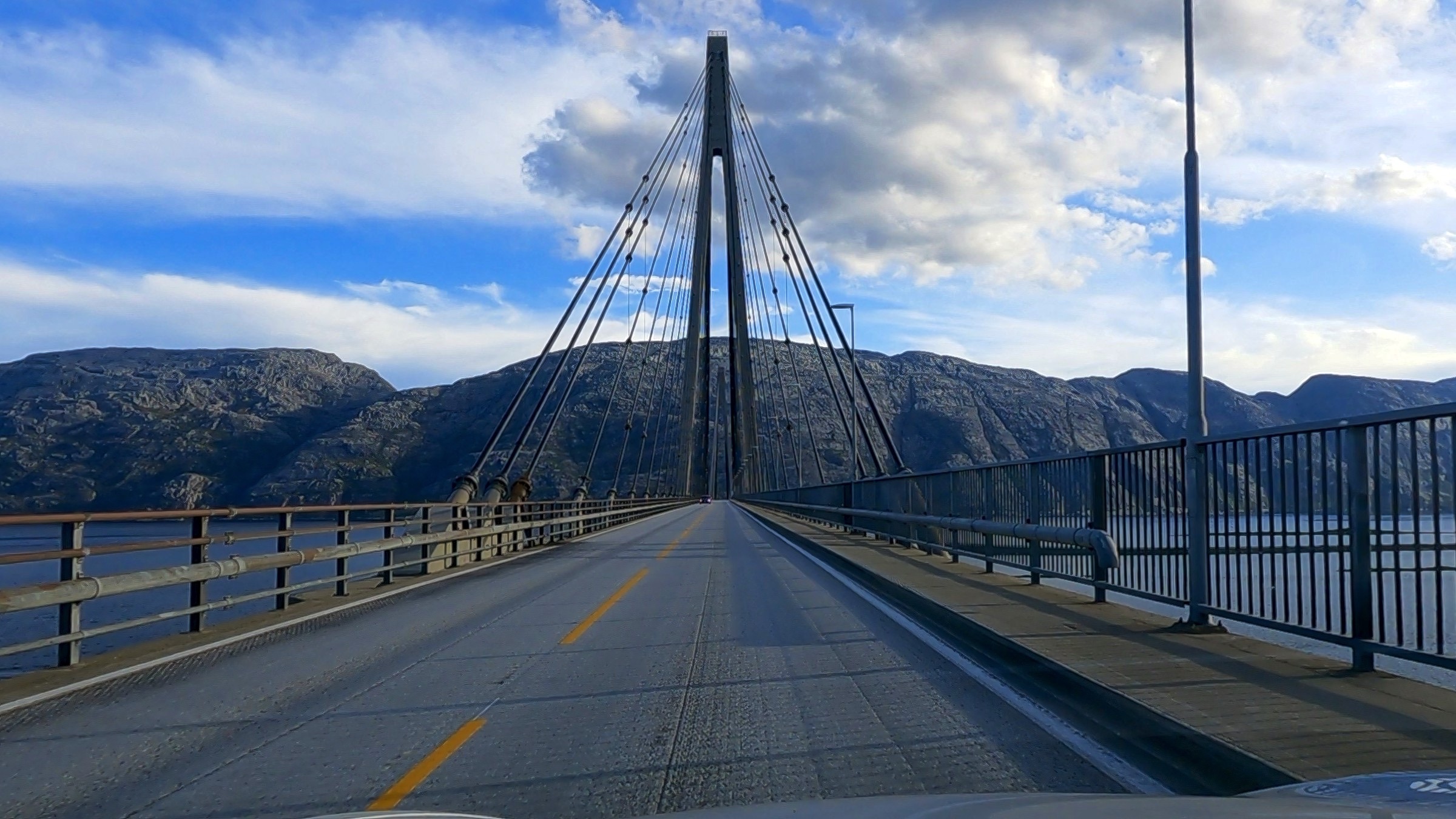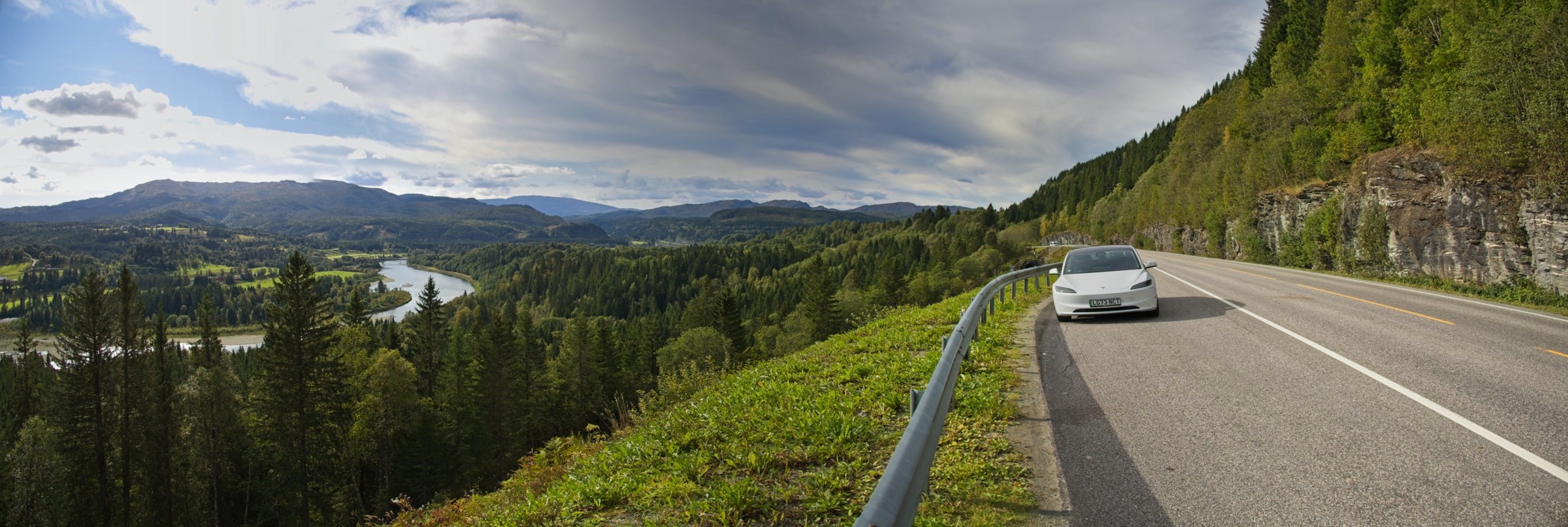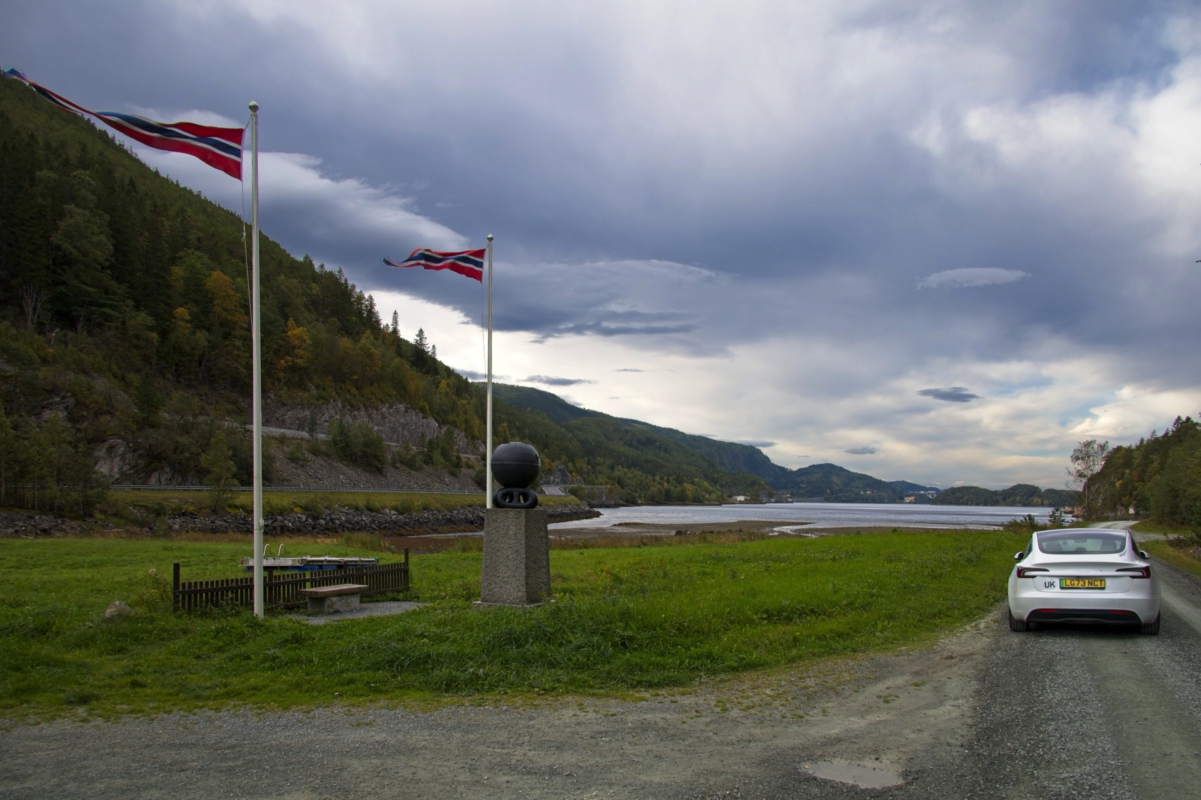 Another long day is progressively taking me to the Arctic Circle. Norway is quite a big country. :-) It has been a beautiful run through varying countryside, alongside fjords, along valleys with manicured farmland, rivers and potential large waterfalls (in spring), through small largely industrial towns and not much traffic. It was a beautiful morning in Trondheim and that was pretty much it for the day. As the sun set here in the port of Sandnessjoen the moon came up and was an incredible sight from my hotel room window, such that it is the headline for today. Often when I include the moon in a photo I make it slightly larger to emphasise it but not this evening. I don’t think I have seen the moon this large in a normal photo that I have taken. As I’ve started here in this little port right out on the West coast and which I’ll visit again, briefly, when I sail back down the coast in a week or so, here are a few more pictures. I will then head back to Trondheim for a couple of photos at the hotel. I noticed a roadside point and on my sat-nav it identified it as the Tirpiz memorial, which peeked my curiosity and so stopped to have a look. It commemorates the allied airmen lost while attempting to sink this German battleship. Simple and to the point in a lovely spot. Remember Norway was neutral in WW2 so have no military connection. Along the E6 there are regular rest places and most if not all have immaculate toilets and often a nice view of the local ountryside as the one in the photos did. Much of the E6 today was a joy and there were even ocasional places to stop and enjoy the views. About 300km north of Trondheim I crossed from Tronland into North Norway and there was a very welome cafe, restaurant, shop and toilets. I often can get a little sleepy mid afternoon and was planning to stop at the next rest area when, lo and behold, this wonderous place appeared securely guarded by a Troll. Would you believe I had a Costa coffee! From there it was about 100km to a Supercharger and then a further 65 km to get me here just after 5pm. It is certainly one of the most scenic drives I have taken including its variety. I have added a few frames from the GoPro to give a little bit of an idea.