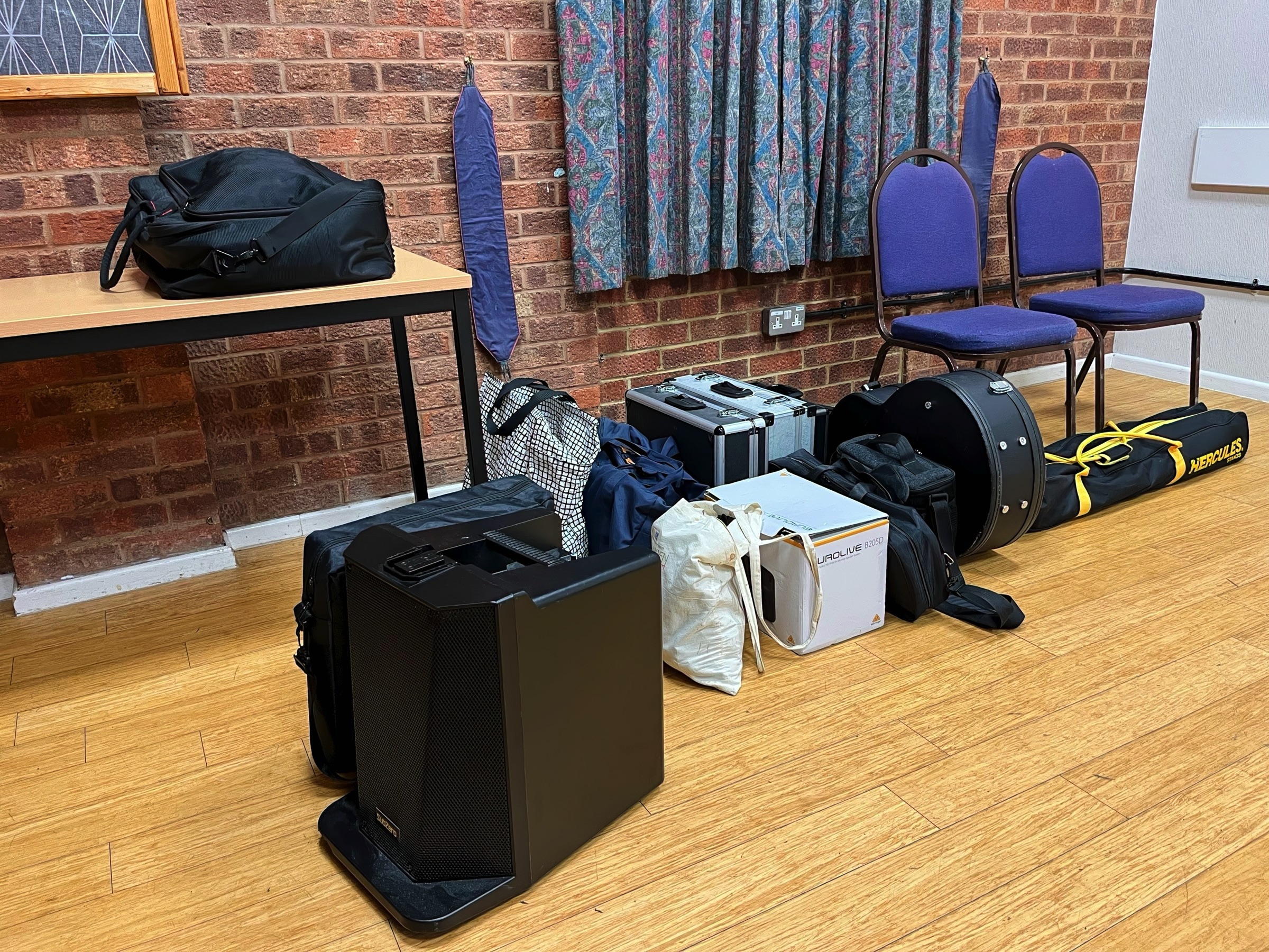 Welcome to the monthly music session in Moggerhanger Village Hall. The evening went very well, managed by Stuart, with a couple of issues. First the most important one. We missed calling one of our regular performers Mark. It has happend before, not to Mark, and no doubt will happen again despite our best efforts. The second issue was the direct responsibility of the tech guy. That would be me! The camera malfunctioned throughout the first half meaning no GoPro video. The sound is recorded separately so at least we got the excellent music. Fortunately Hilary’s husband shot some video as did Steve so all was not lost. I have edited the video in two parts, as on the night, and they can be found here. I have added a couple of photos below to set the scene and a more comprehensive set can be found here. I have included a view of the kit that somehow fits into my car and then how the “stage” looks before it is muddled around to suit the various perfomers. Slip ups aside it was a fine evening, welcoming the return of Neil, Mike M and Hilary as well as enjoying Jimmy’s set for the first time.